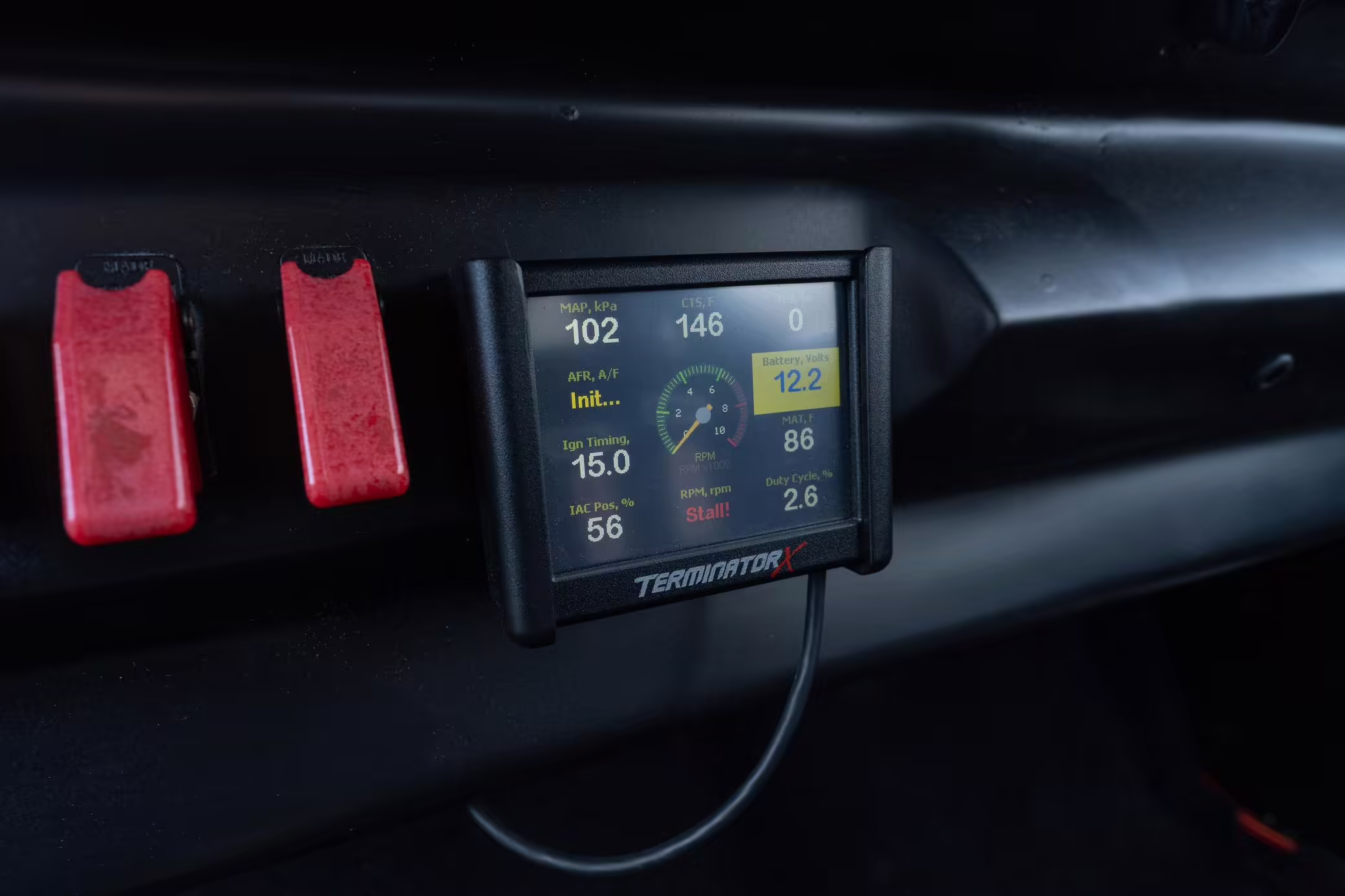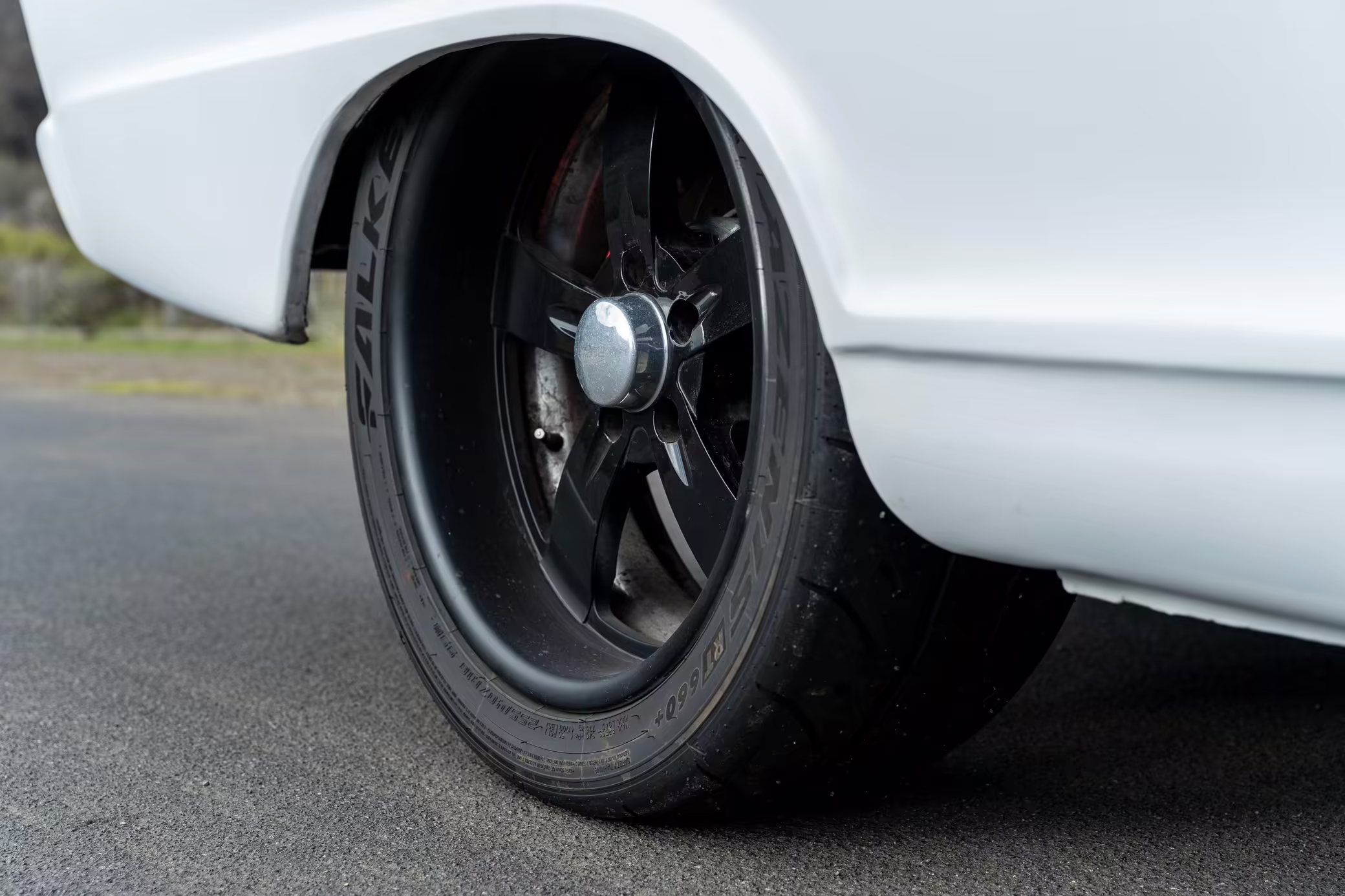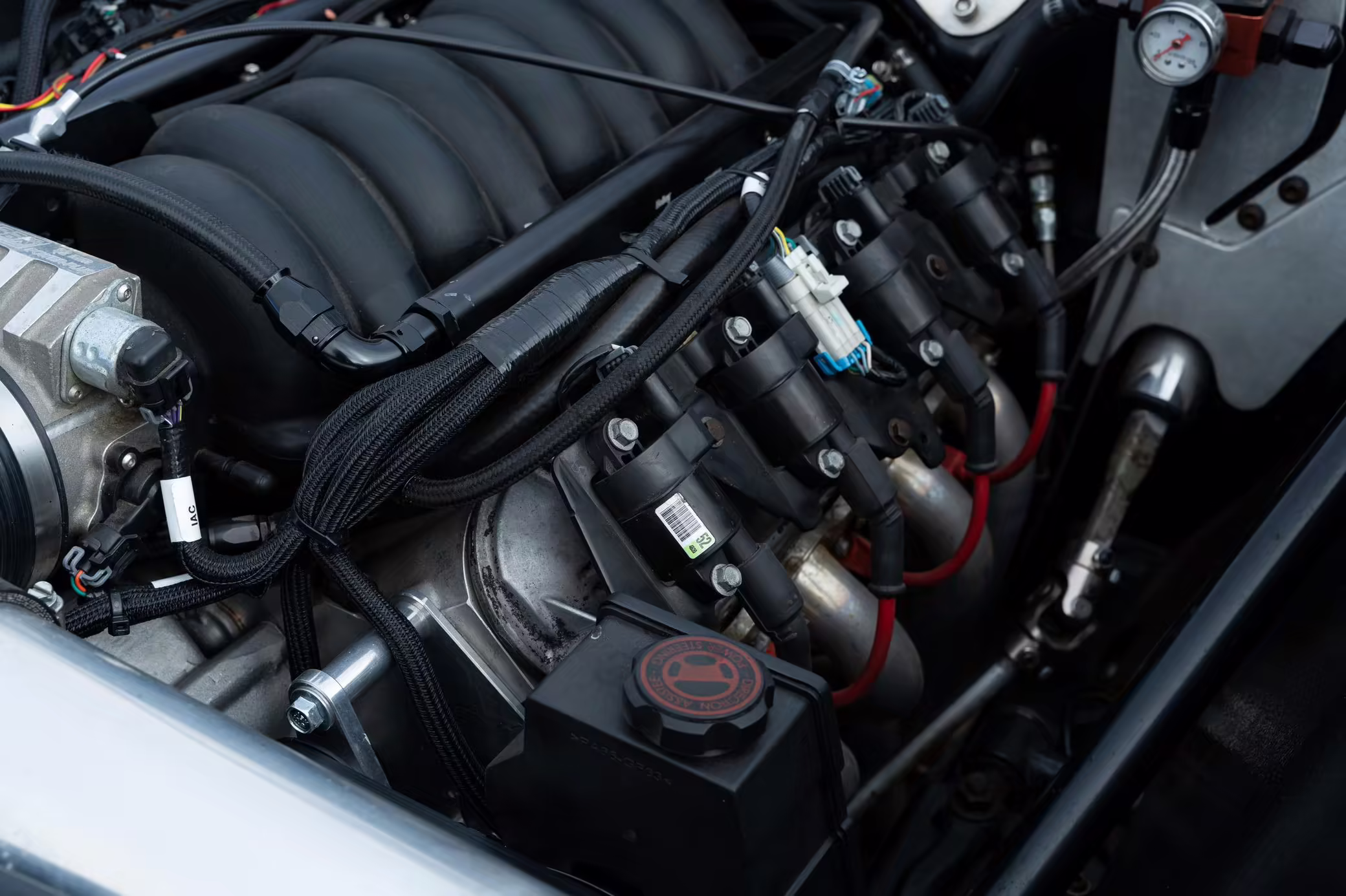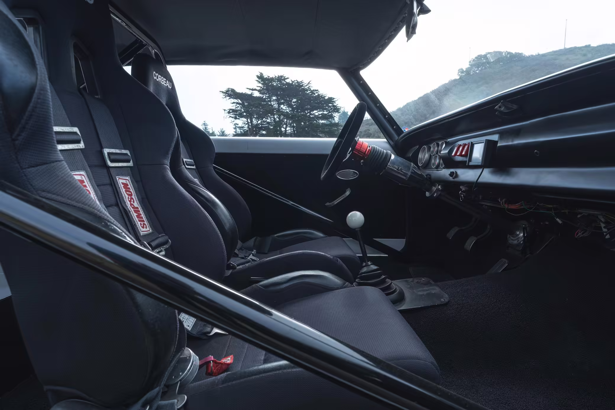 • A partial list of notable currently installed equipment reported by the seller includes a Holley Terminator X engine management system, a trunk-mounted fuel cell, a Total Cost Involved front and rear suspension system, Wilwood Engineering front and rear disc brakes, fiberglass body panels, and Corbeau front seats.