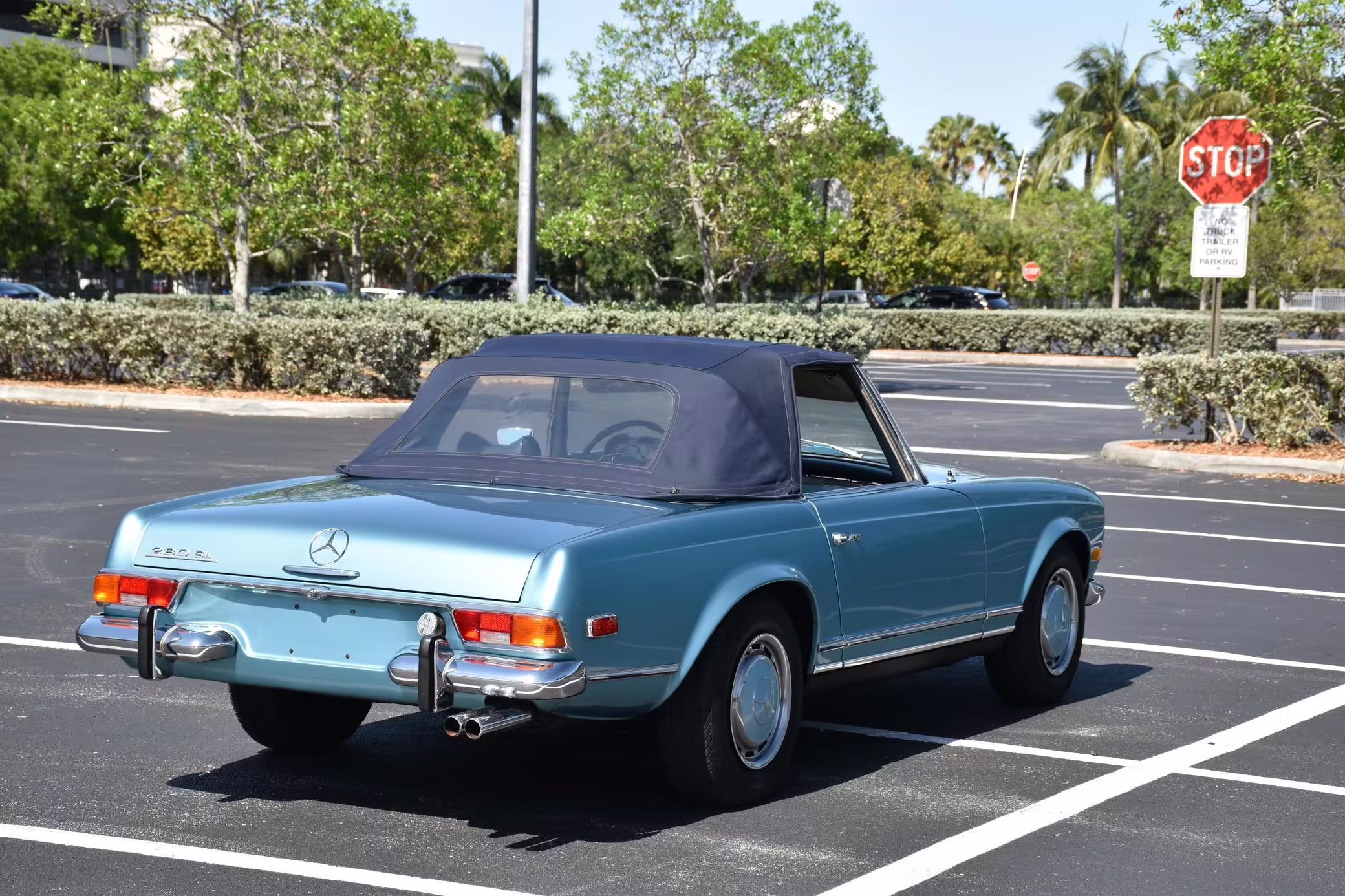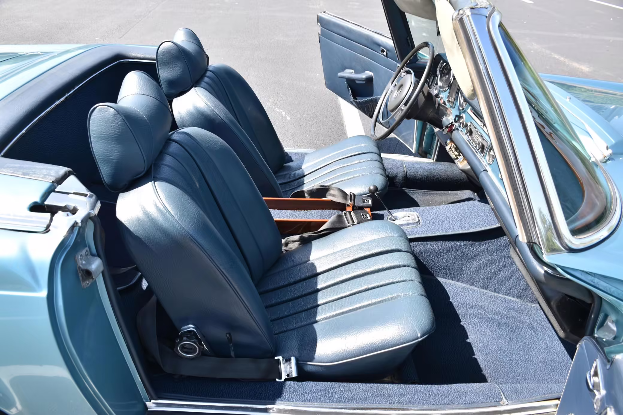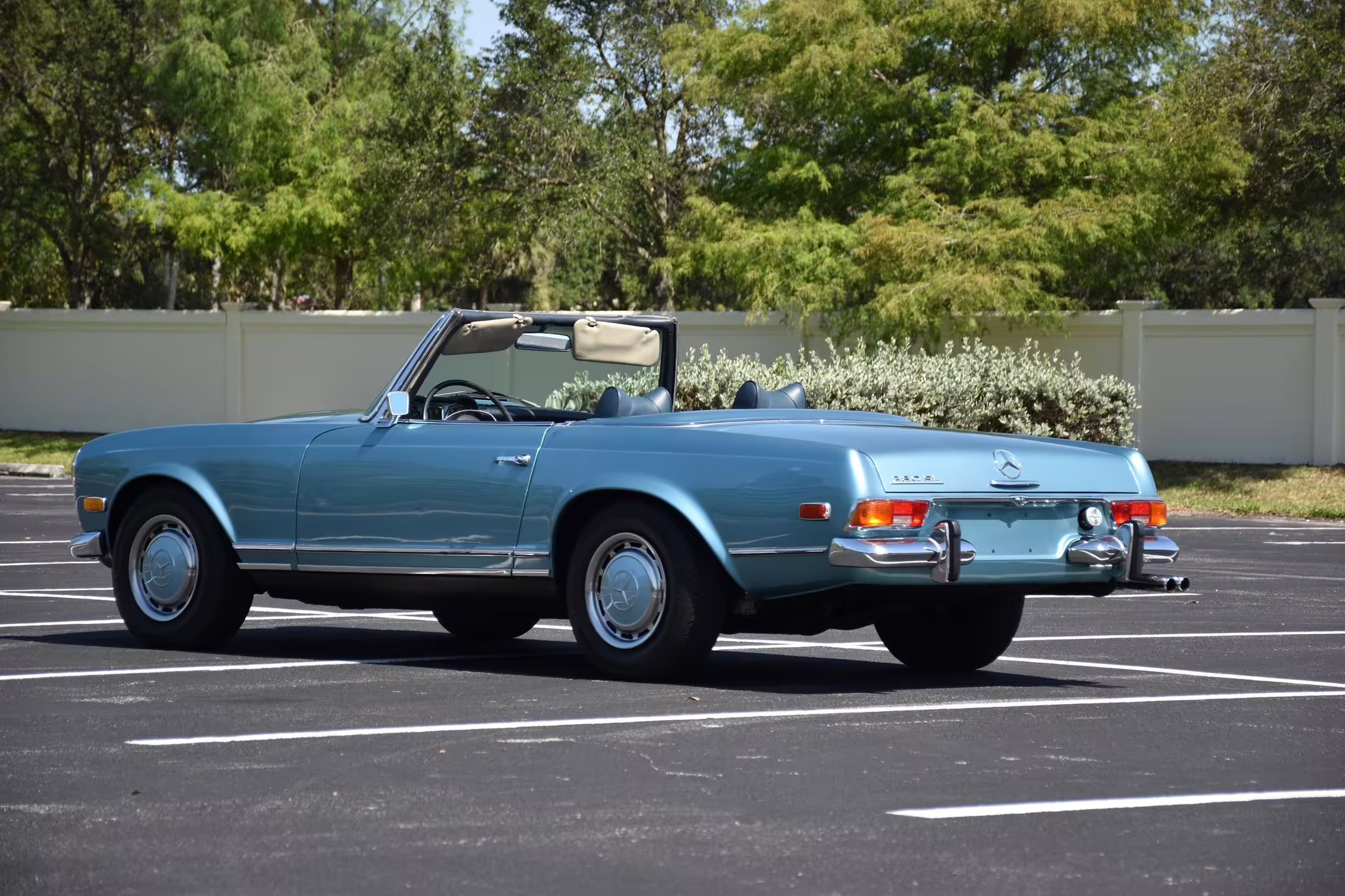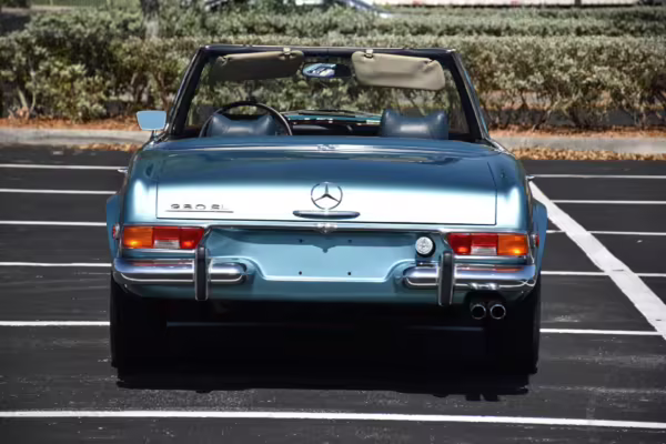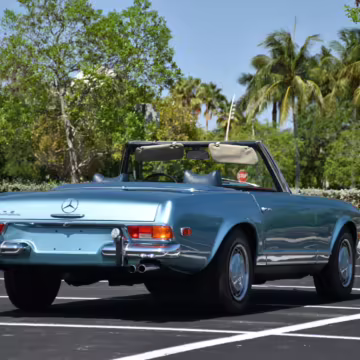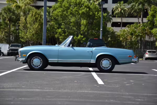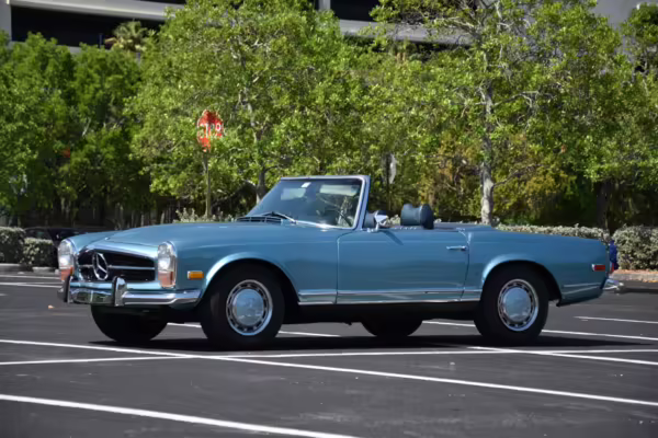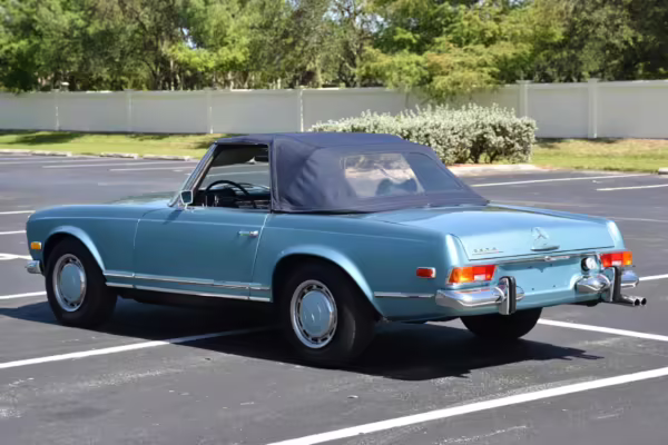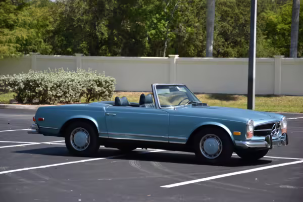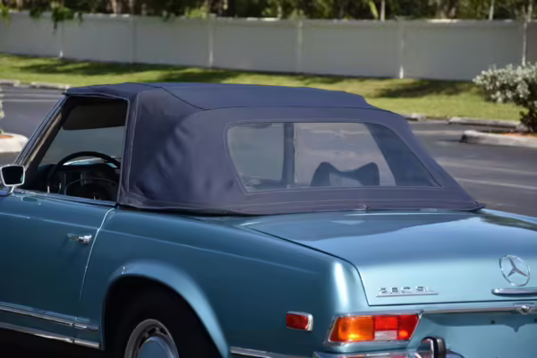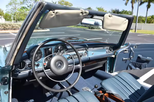 1971 Mercedes-Benz 280SL, finished in Horizon Blue with a body-colored hardtop, a dark blue soft top, and a blue interior.