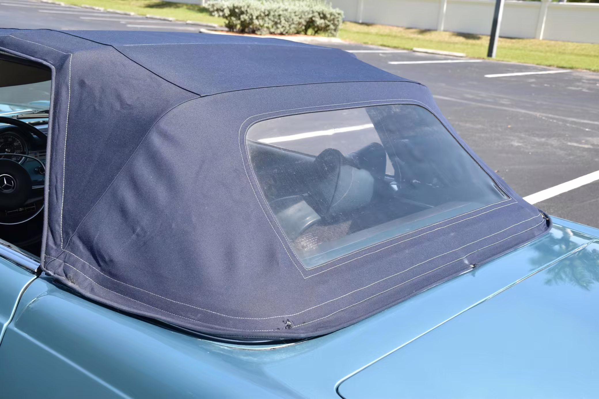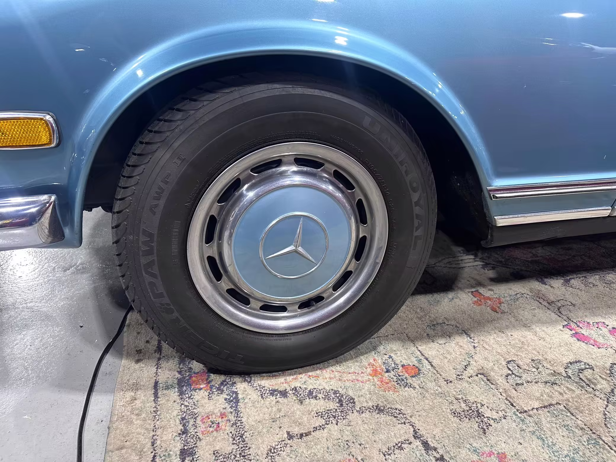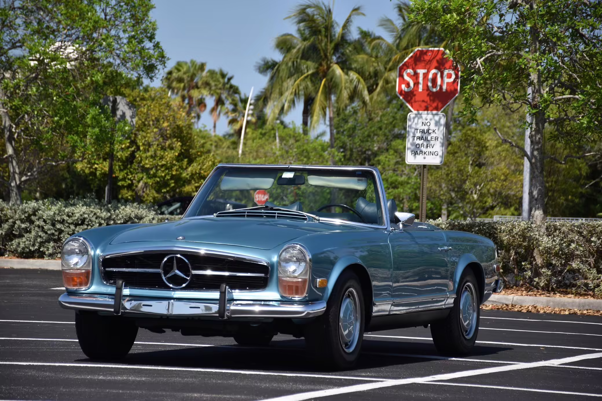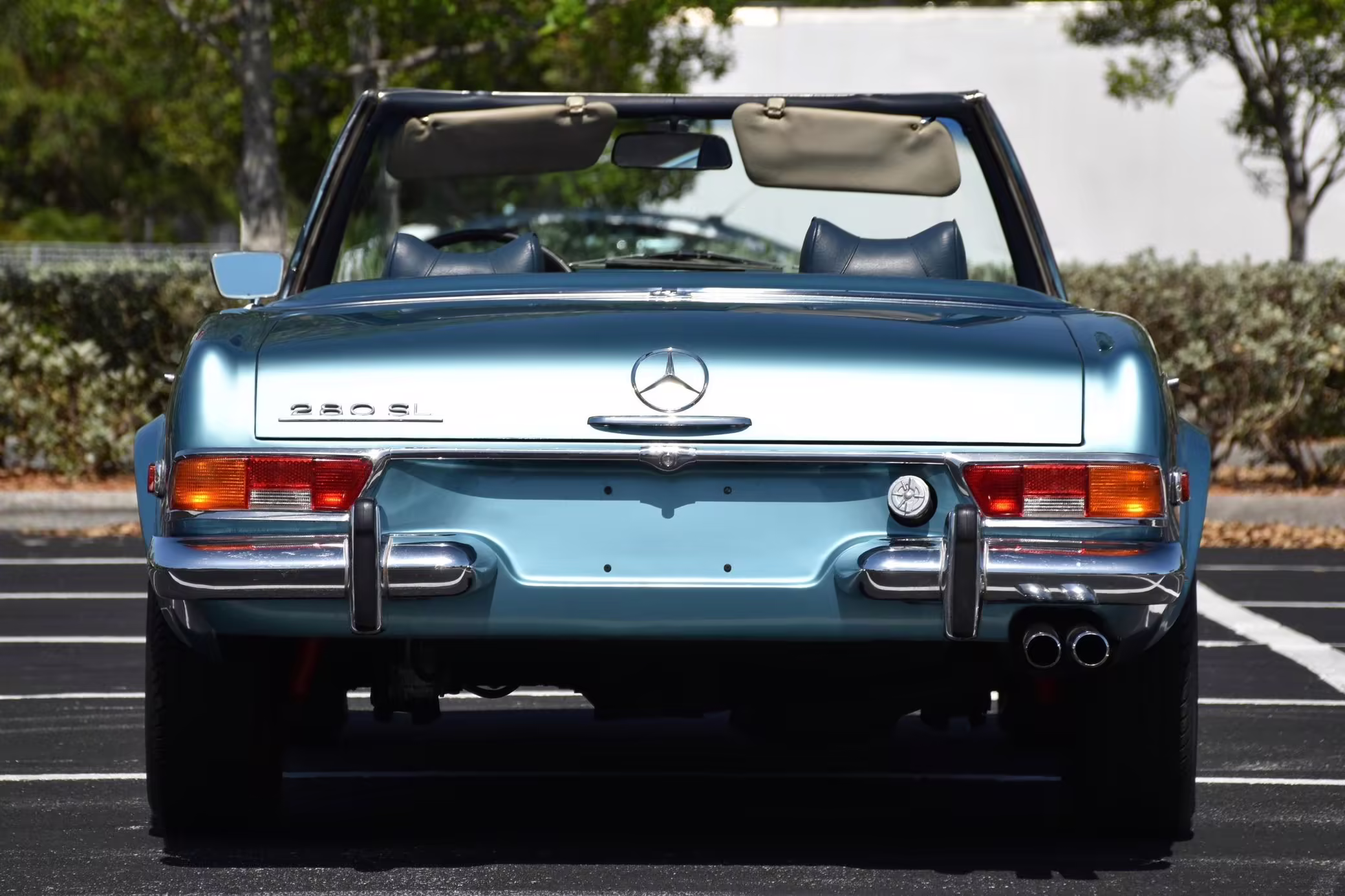 1971 Mercedes-Benz 280SL, finished in Horizon Blue with a body-colored hardtop, a dark blue soft top, and a blue interior.