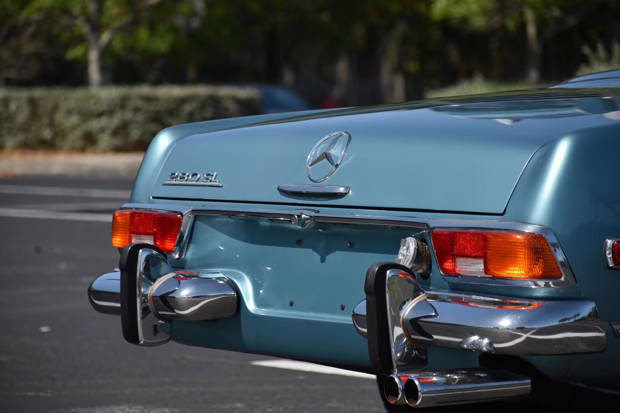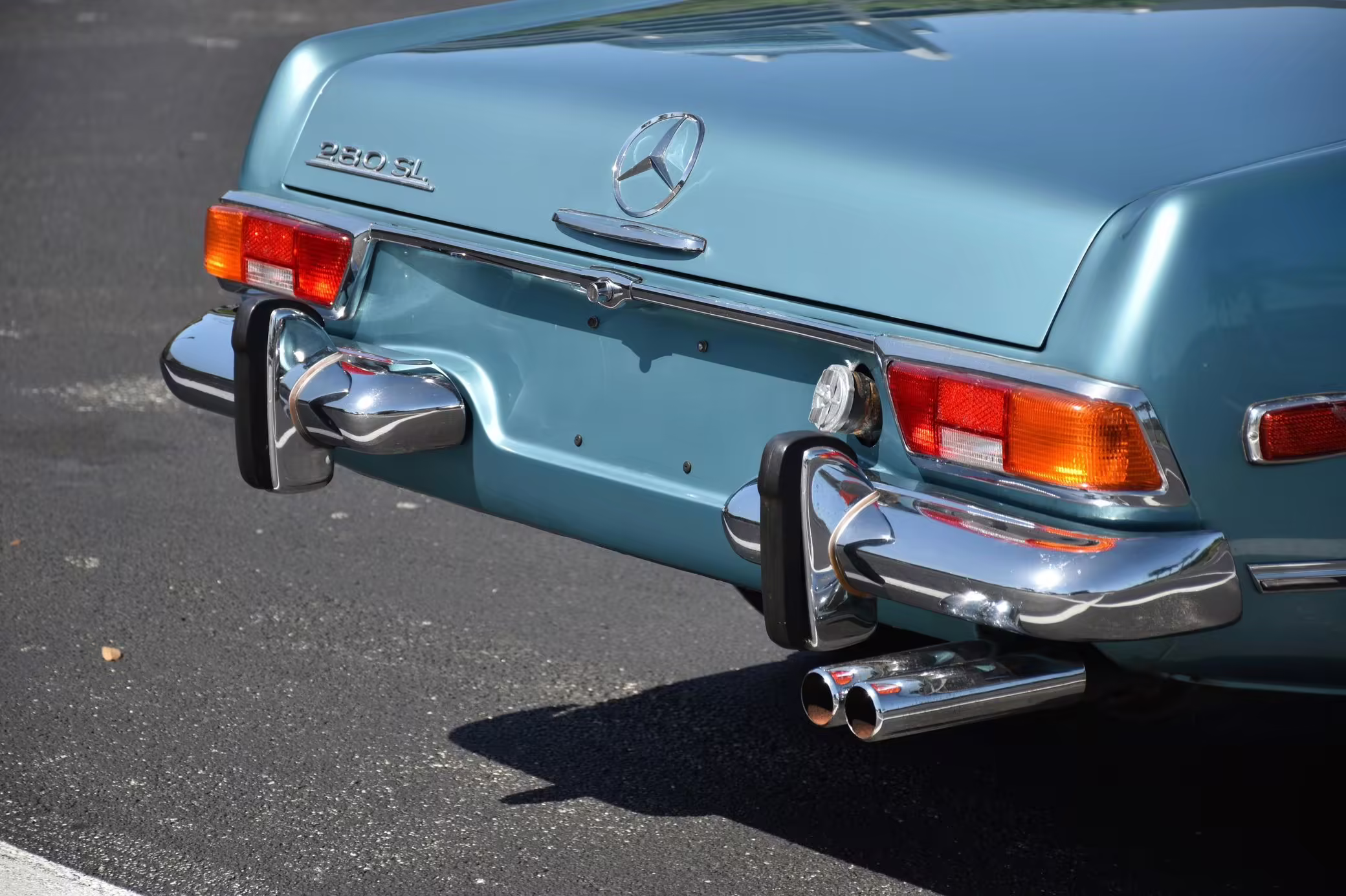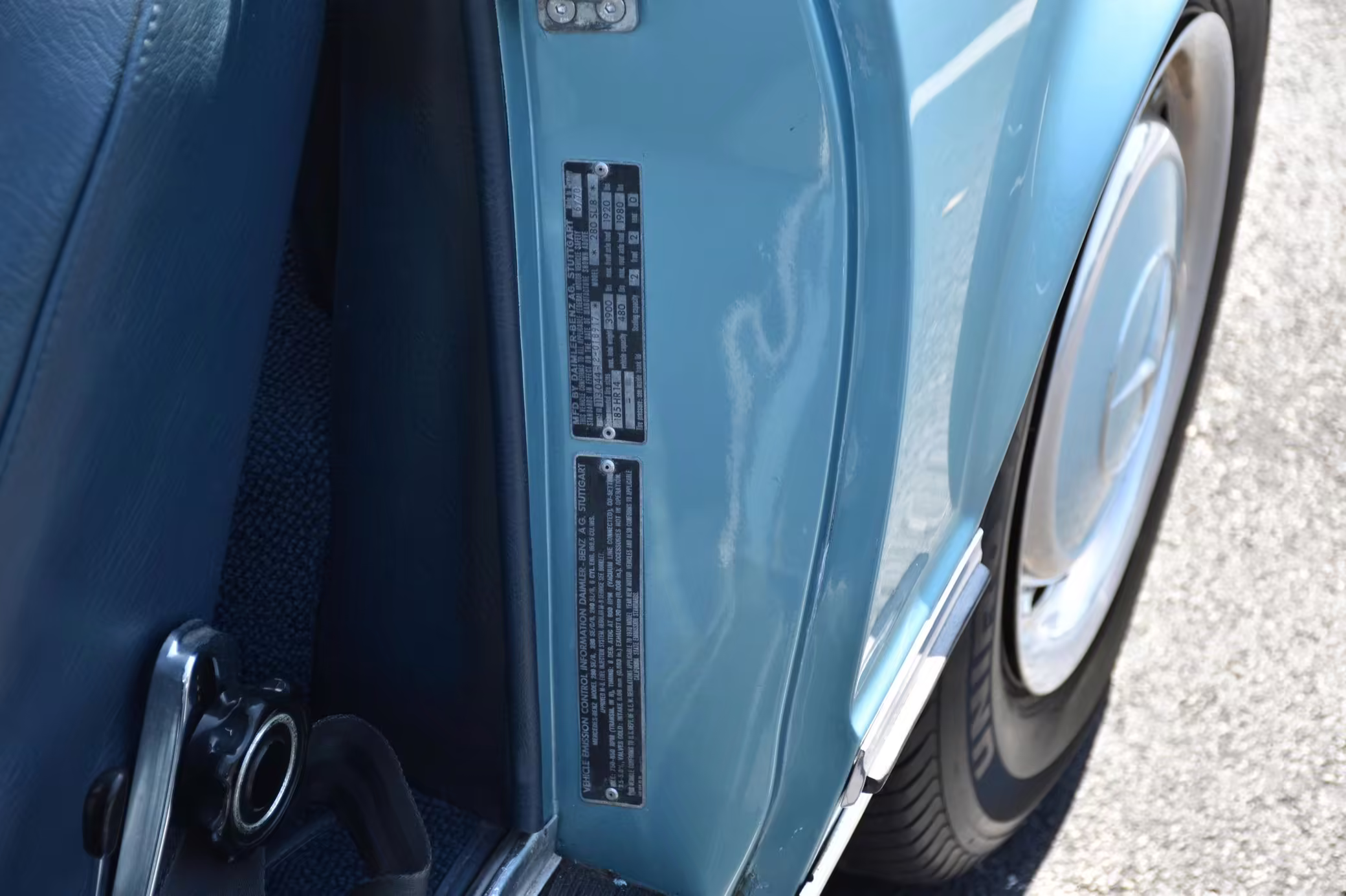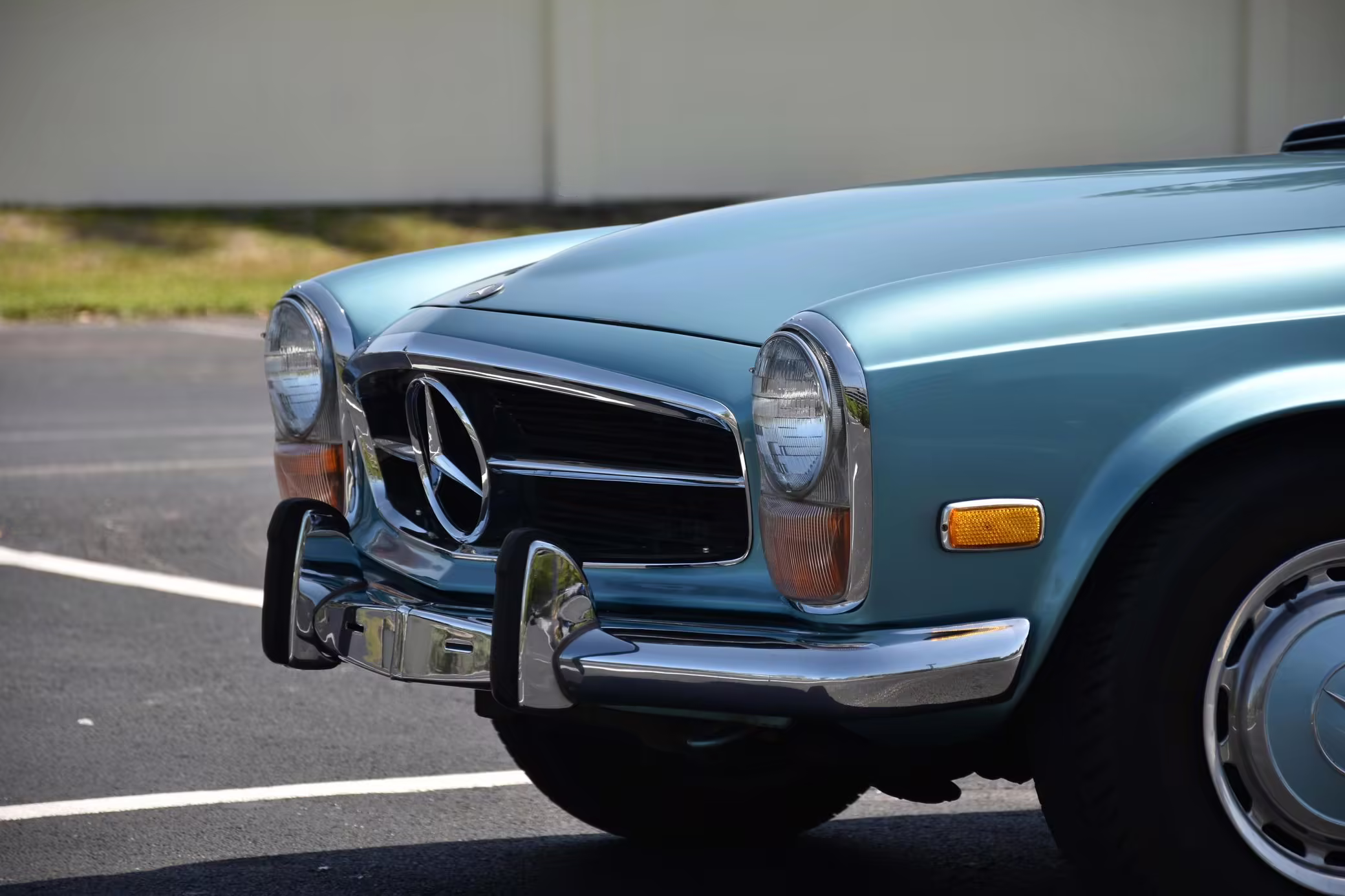 1971 Mercedes-Benz 280SL, finished in Horizon Blue with a body-colored hardtop, a dark blue soft top, and a blue interior.