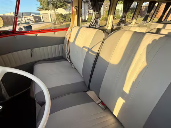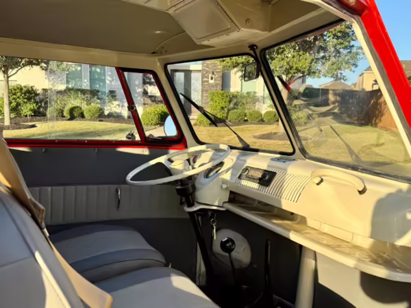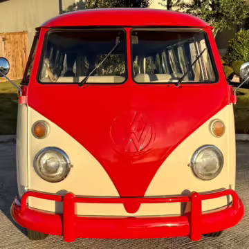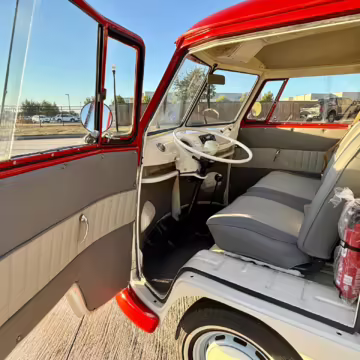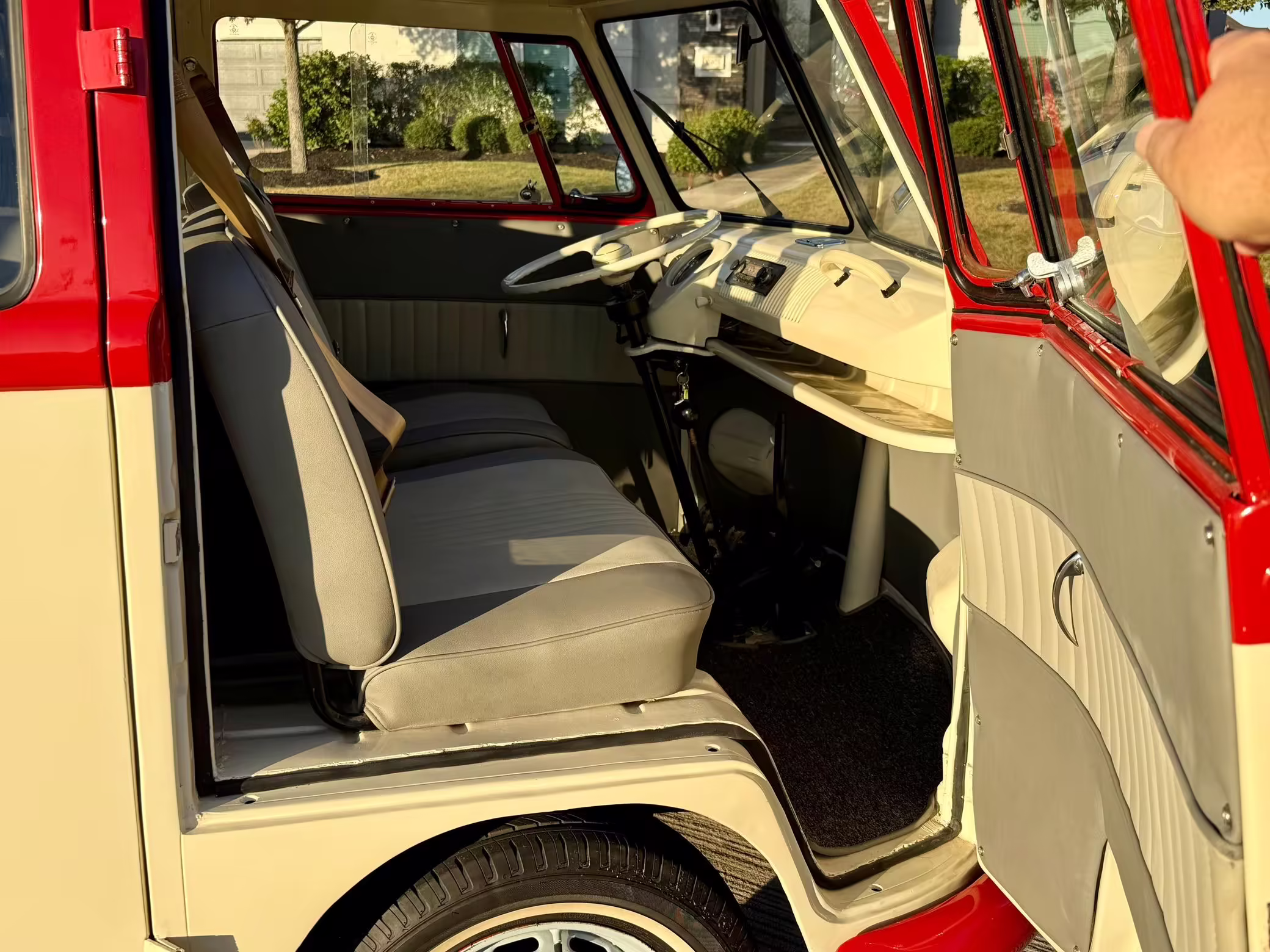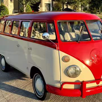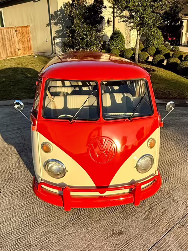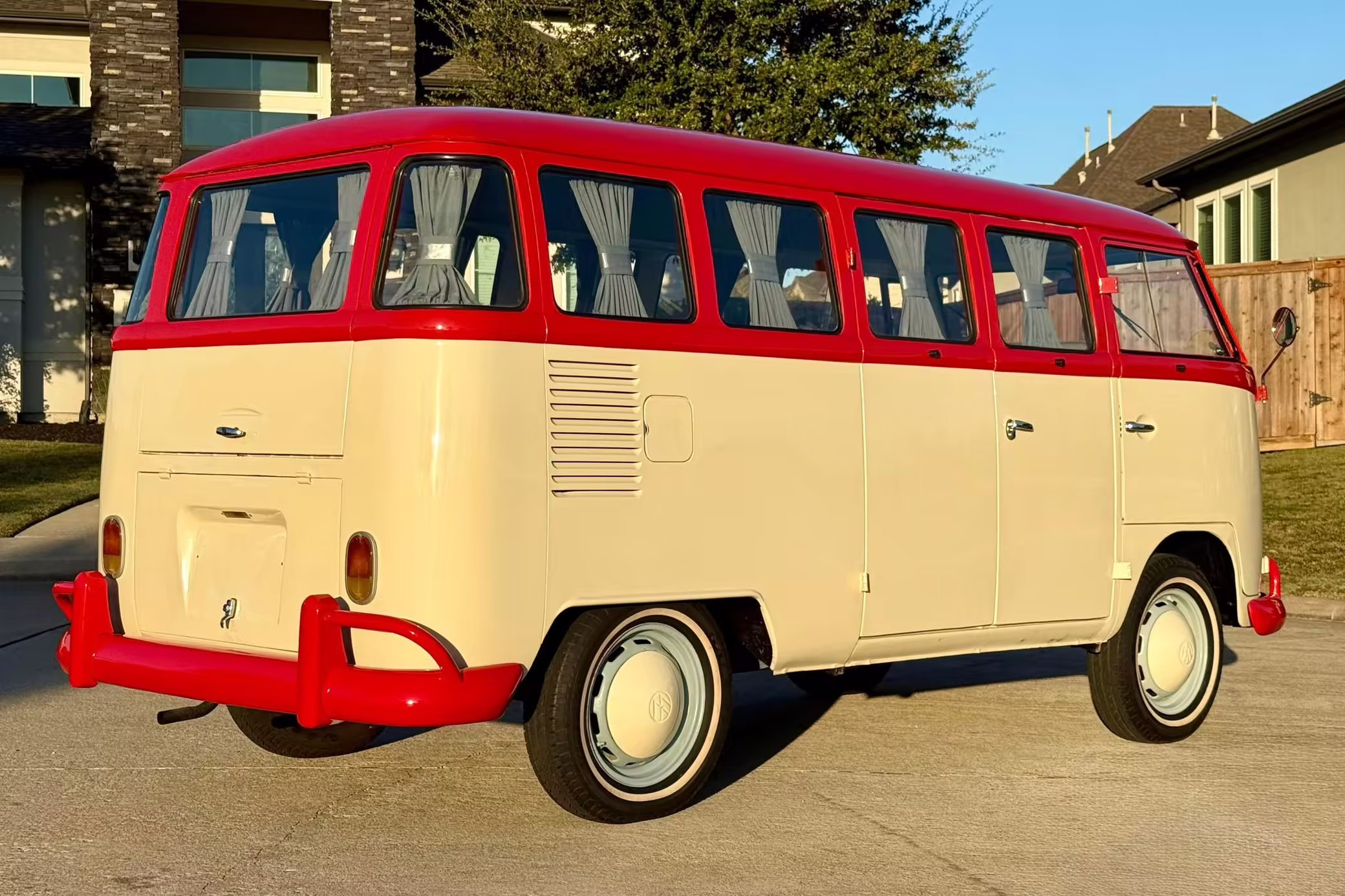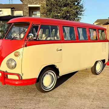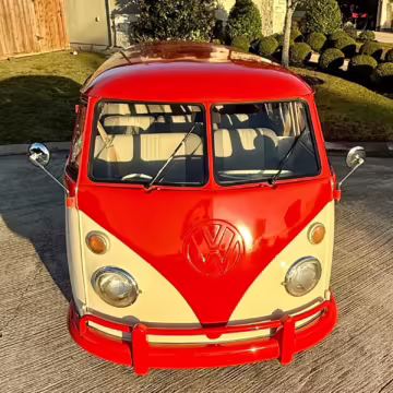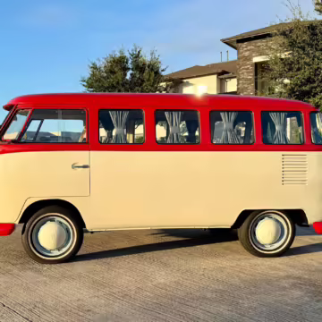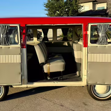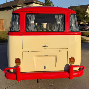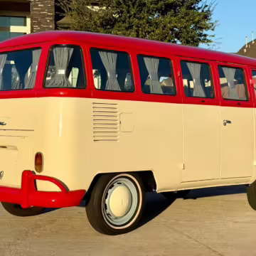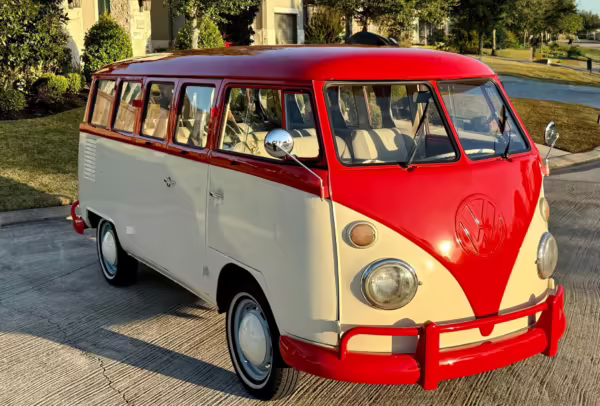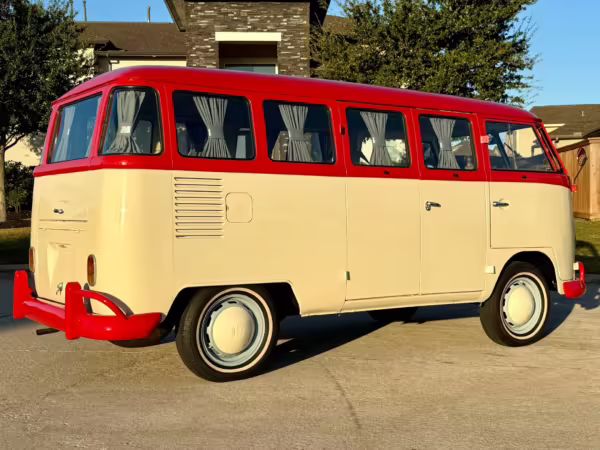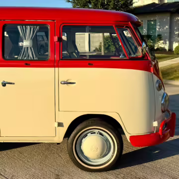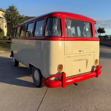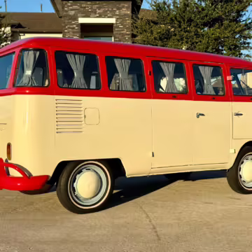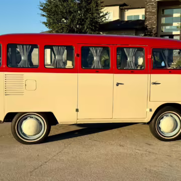 1975 Volkswagen Bus, finished in red and beige with a gray interior.