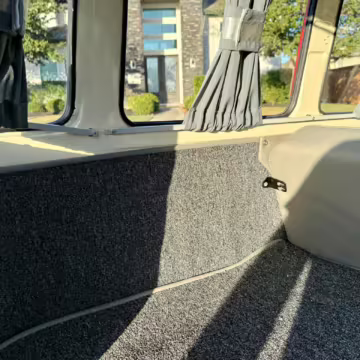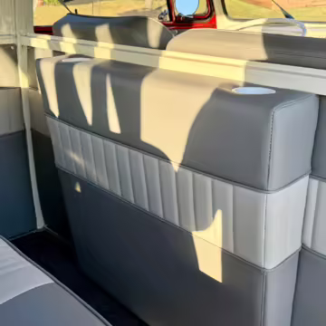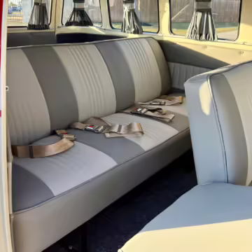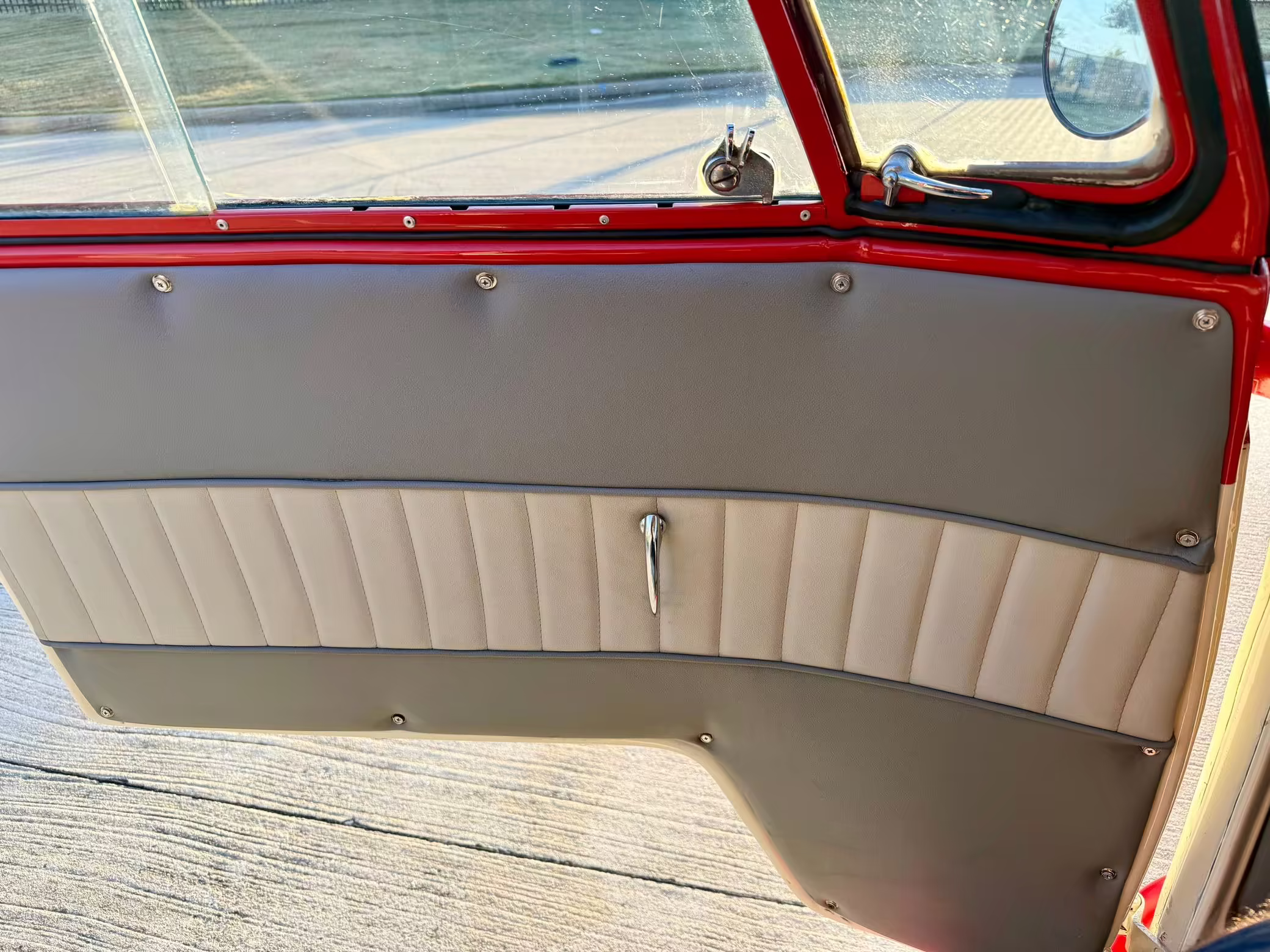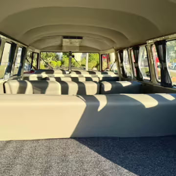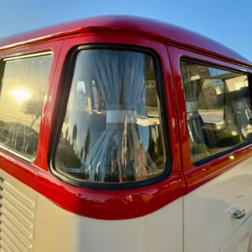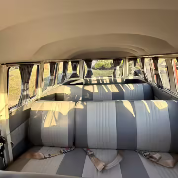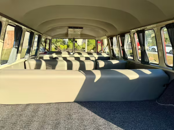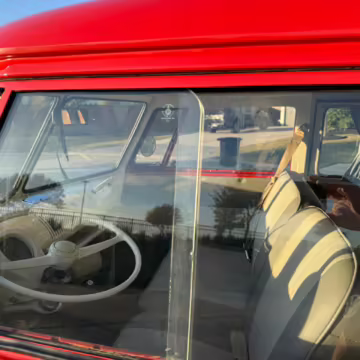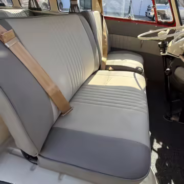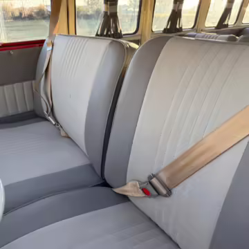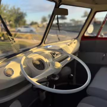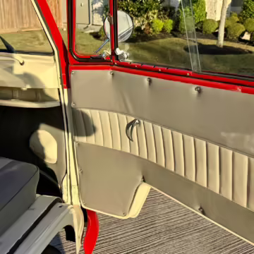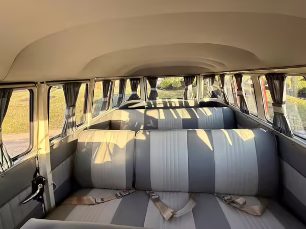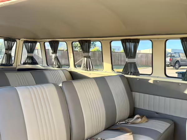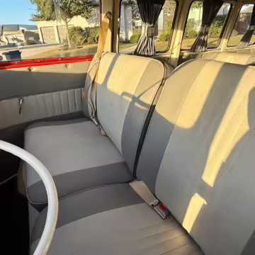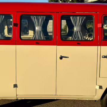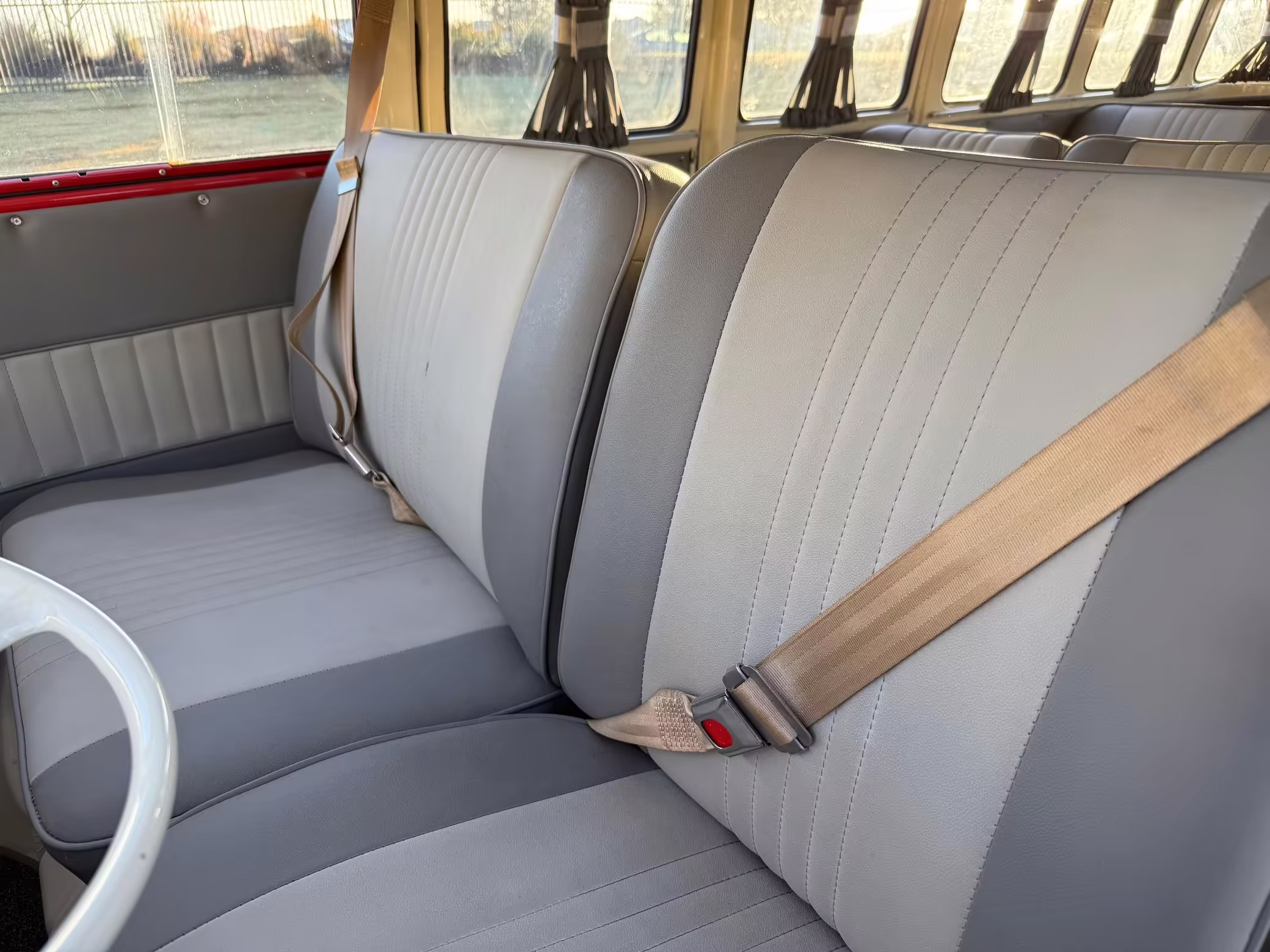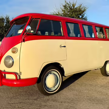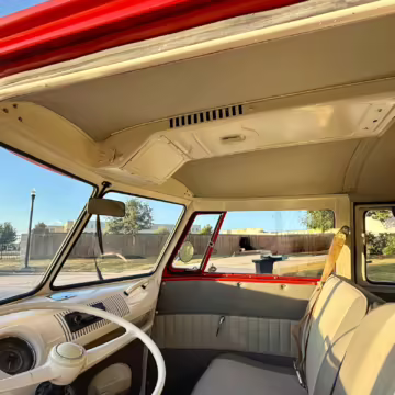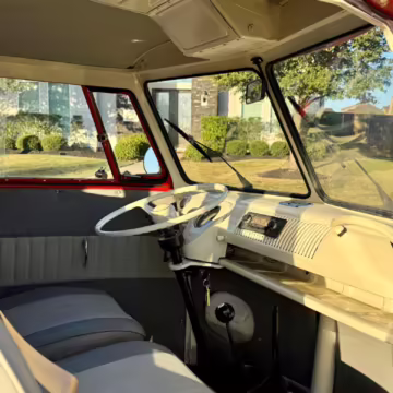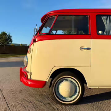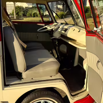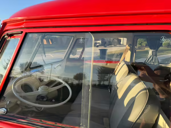 1975 Volkswagen Bus, finished in red and beige with a gray interior.