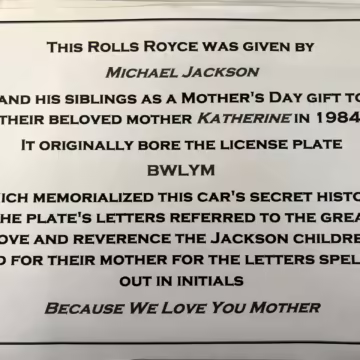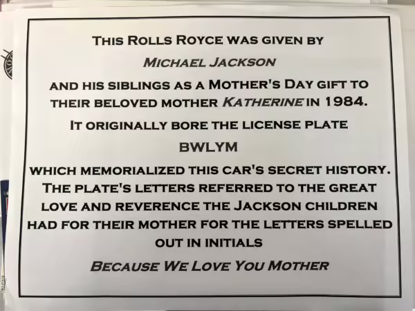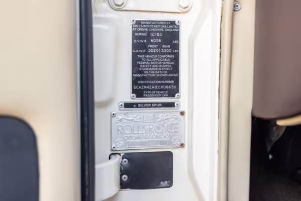 This Silver Spur was purchased new by Michael Jackson as a gift for his mother Katherine, according to the former owner. The California-issued “BWLYM” (“because we love you, mother”) license plate that this car reportedly wore during Jackson’s ownership is pictured in the gallery and included in the sale.