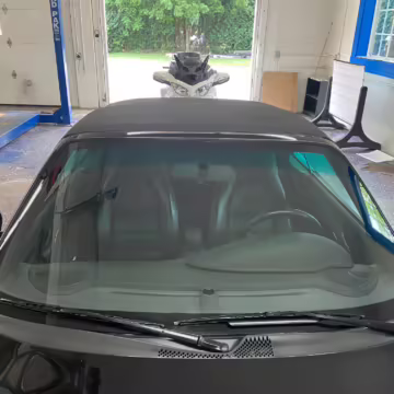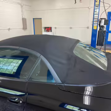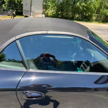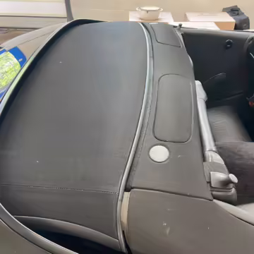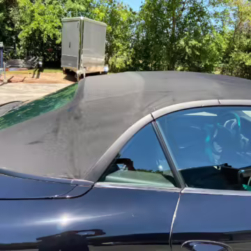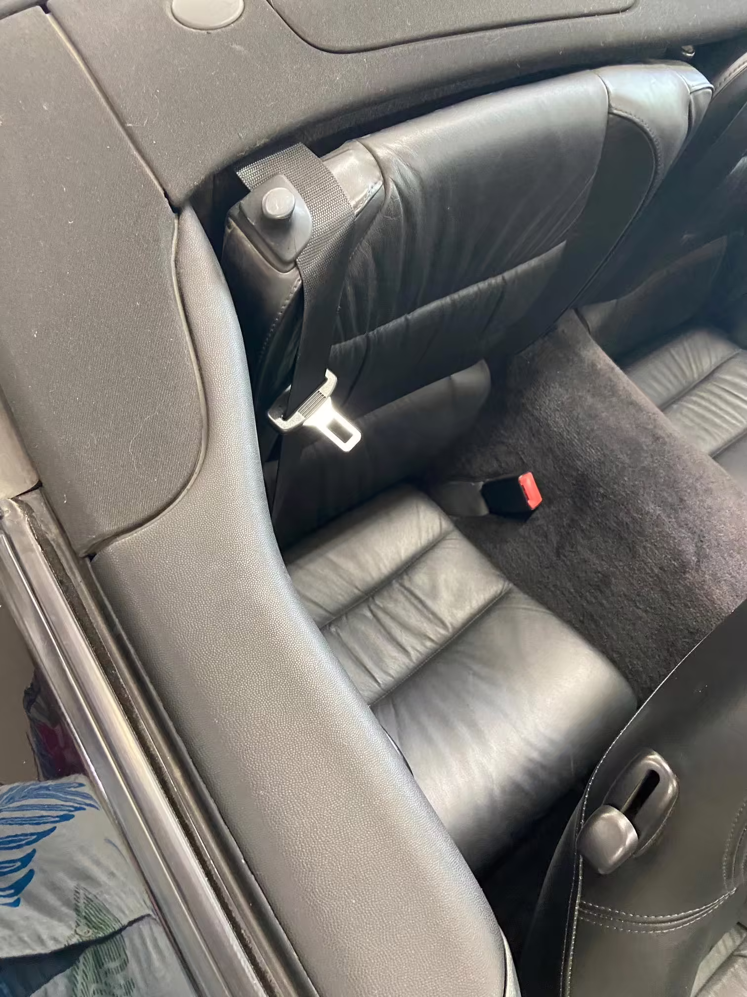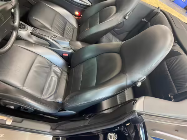 Equipment includes 18-inch Sport Design wheels, a power-operated soft top, limited slip differential, draped leather upholstery, and 8-way power seats. Modifications are limited to an aftermarket sport exhaust, clear side marker lights, and a Kenwood head unit.