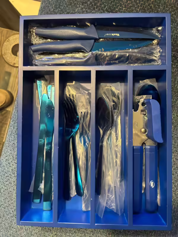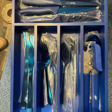 Accessories shown in the gallery (including forks, knifes, glasses, coffee machine, pillows, and sheets)
