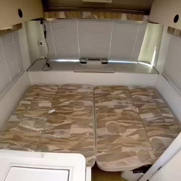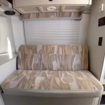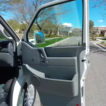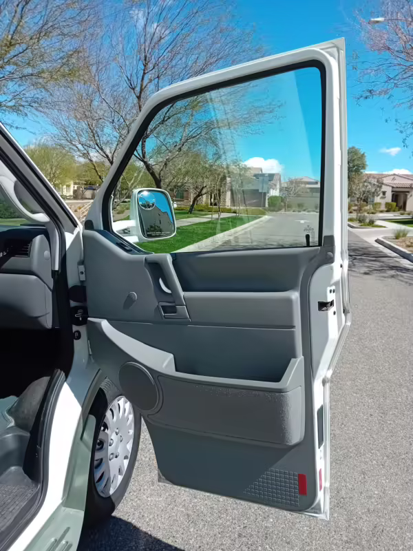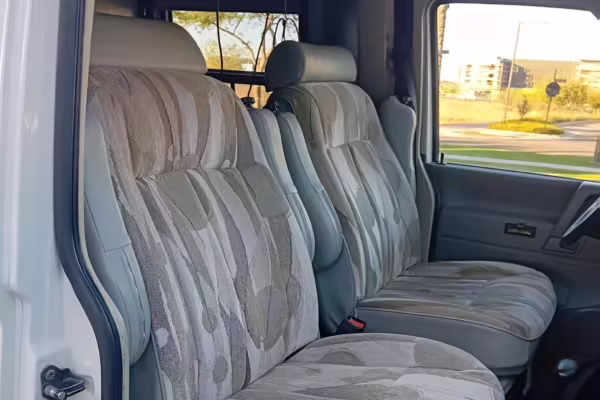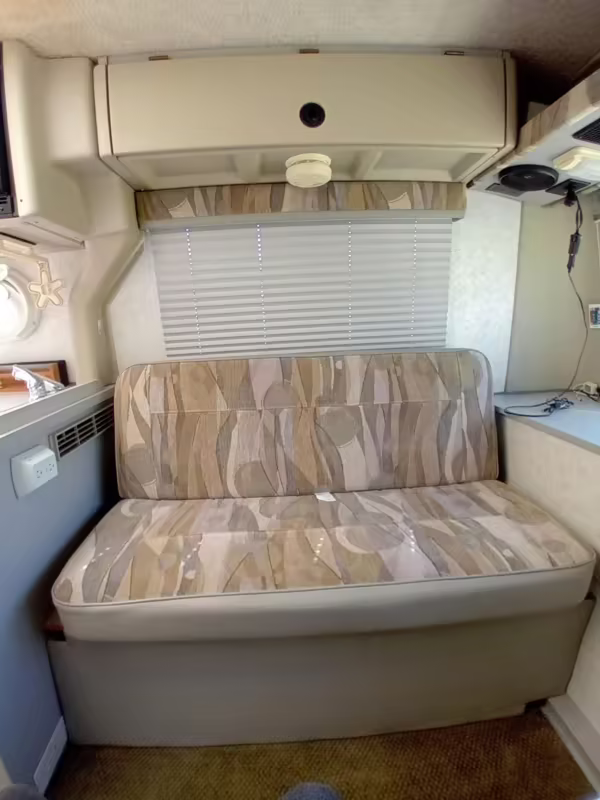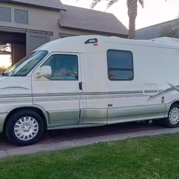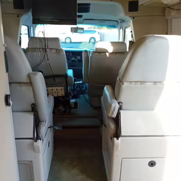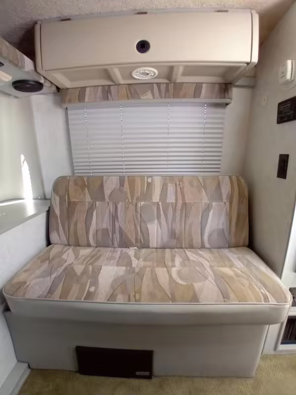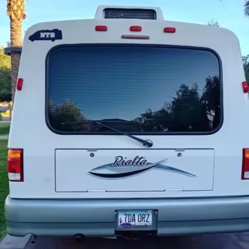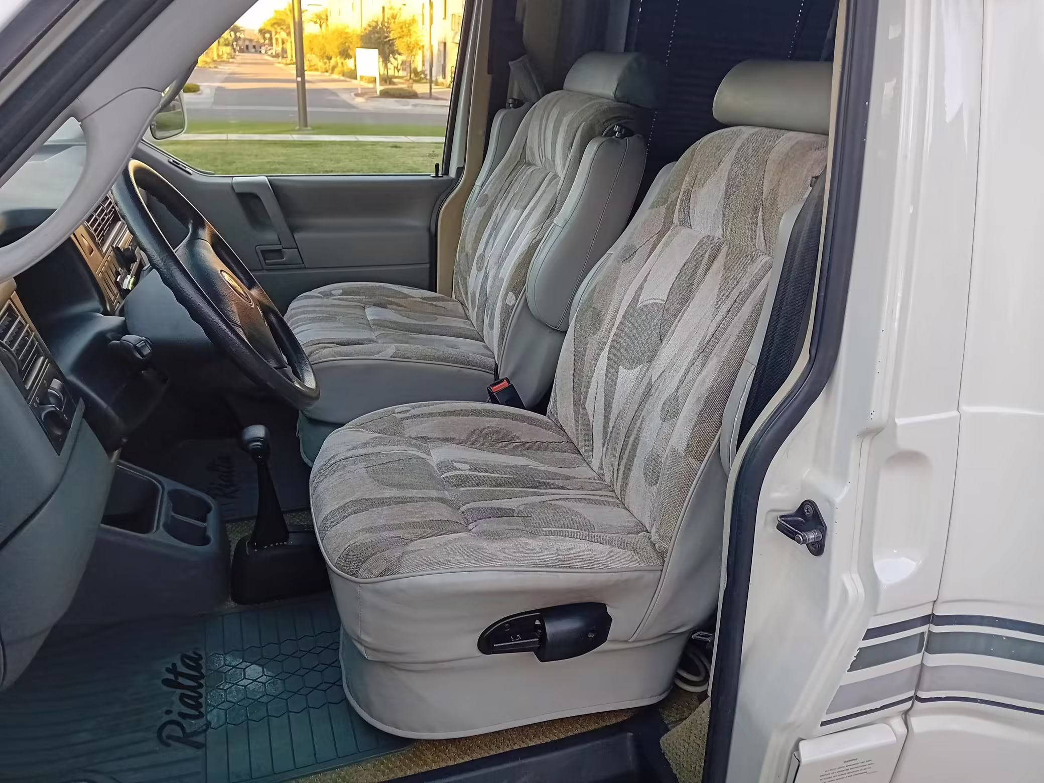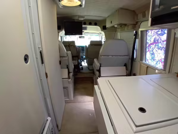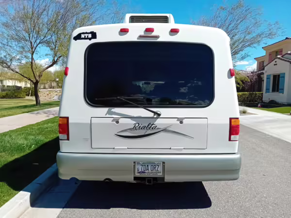 This van was converted into a Rialta camper by Winnebago. The conversion includes a custom body, rear air suspension, middle-row captain’s chairs, dual sofas, a shower with an extendable wall, a kitchen with an extendable countertop, a refrigerator, and more as listed below.