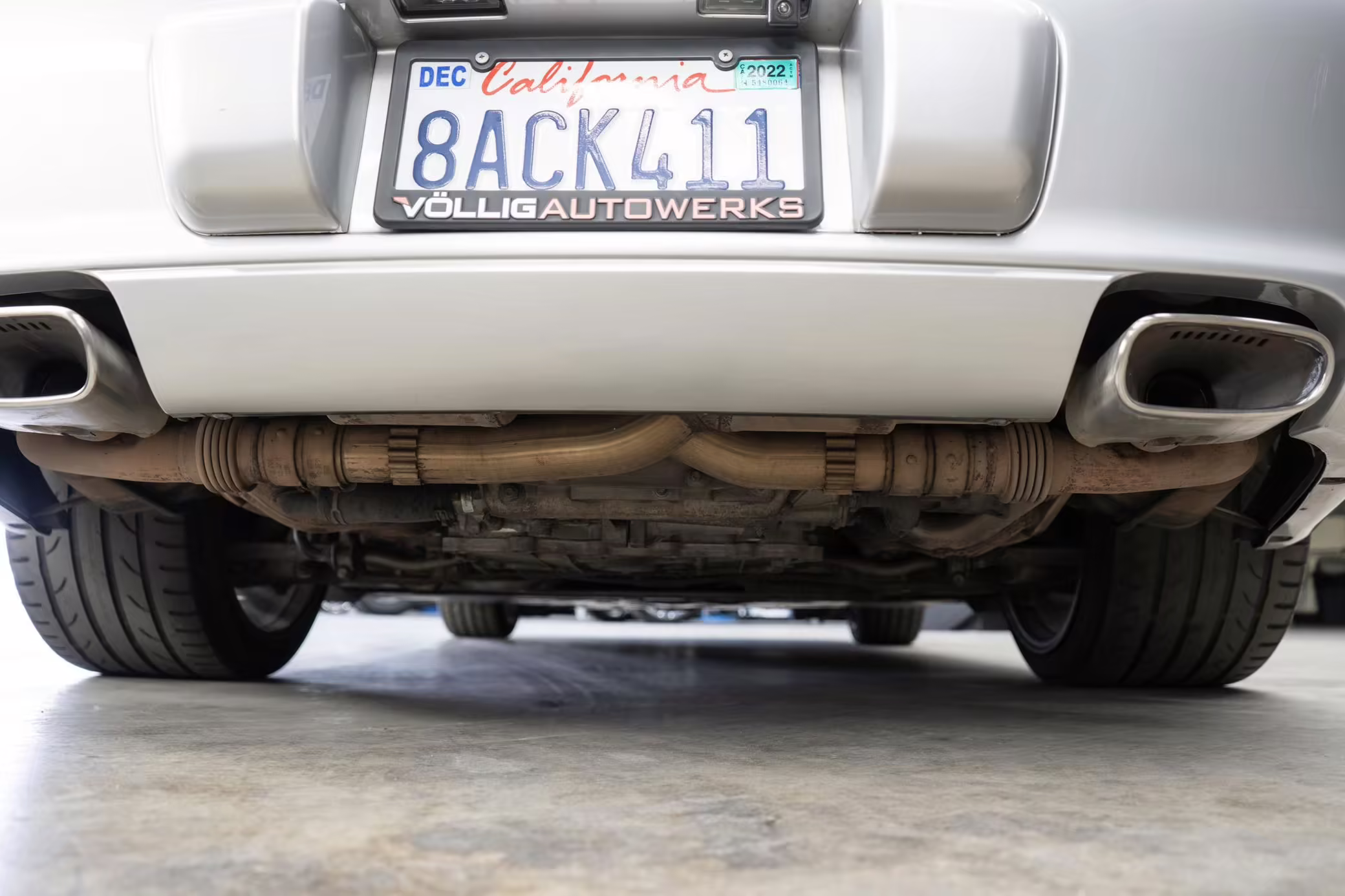 Modifications include a set of 19-inch 997 Turbo II wheels, tinted windows, clear side marker lights, and a Kenwood head unit.