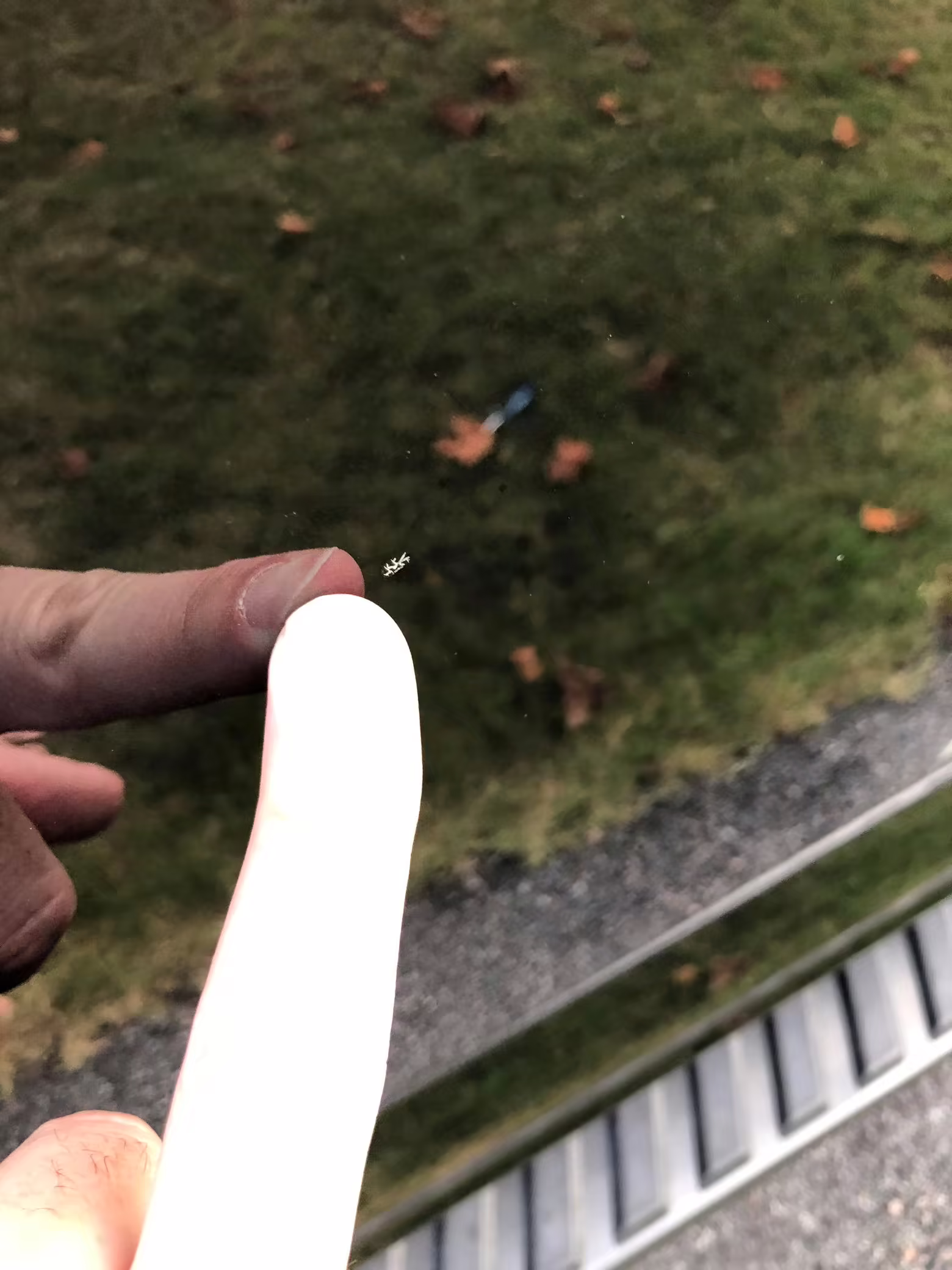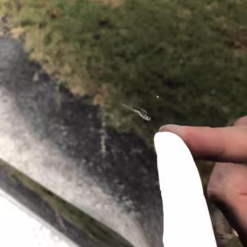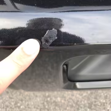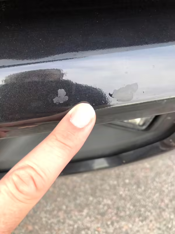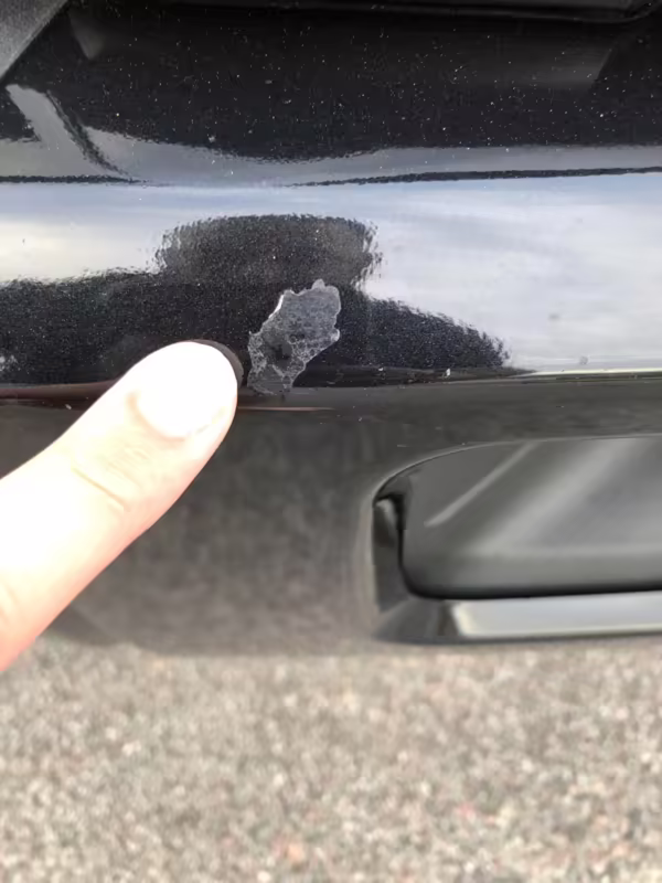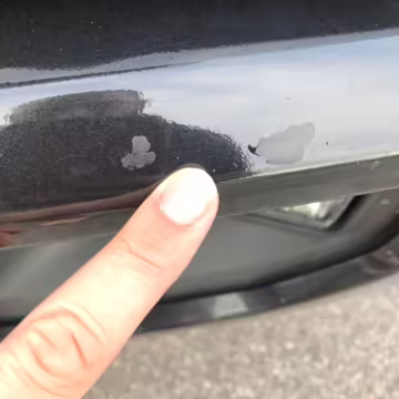 Chipped clearcoat in three spots on front bumper