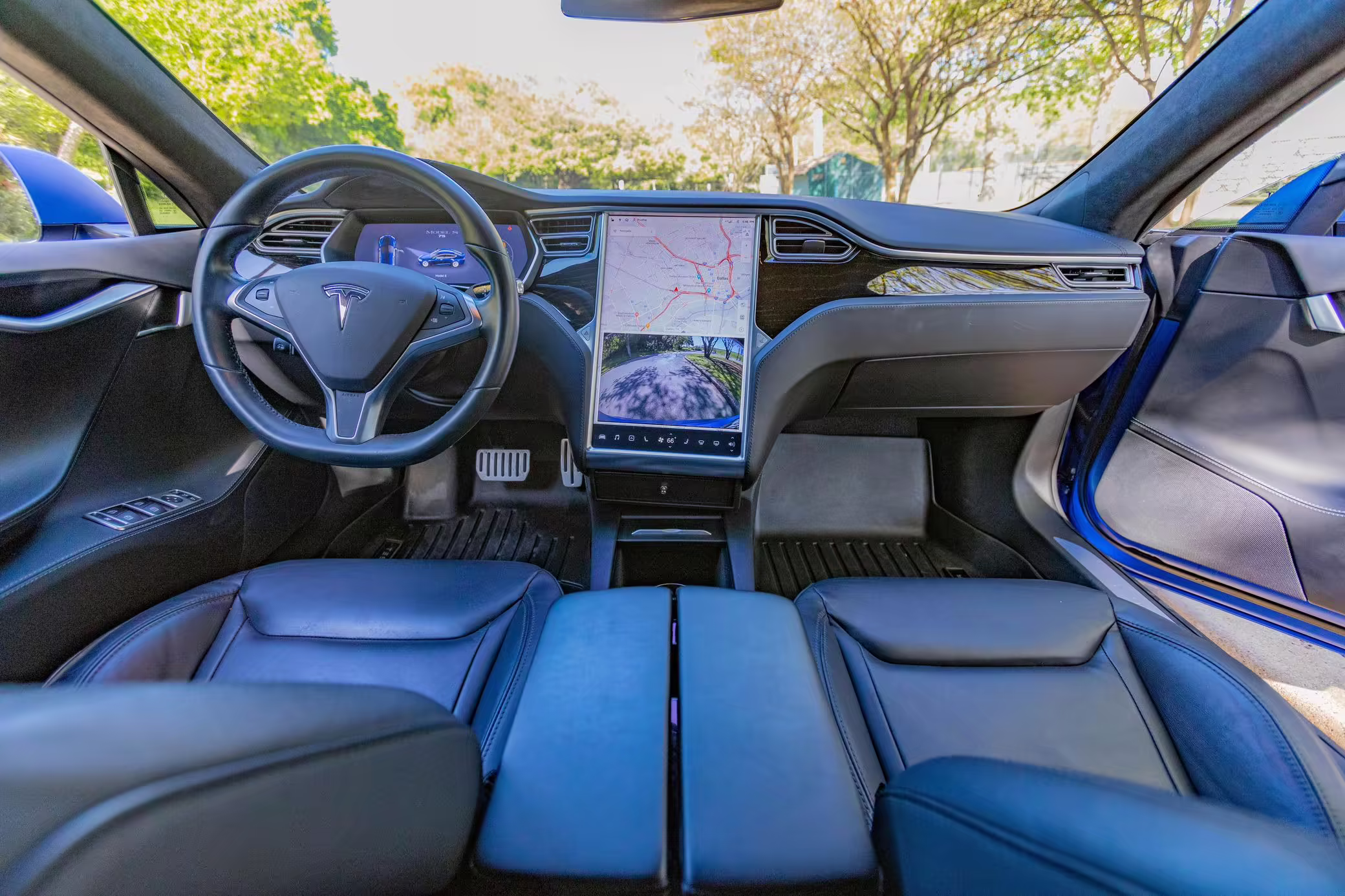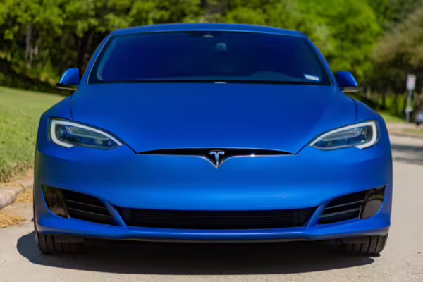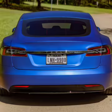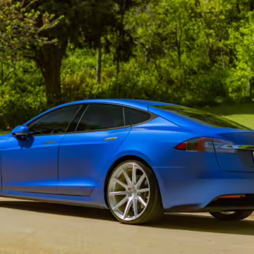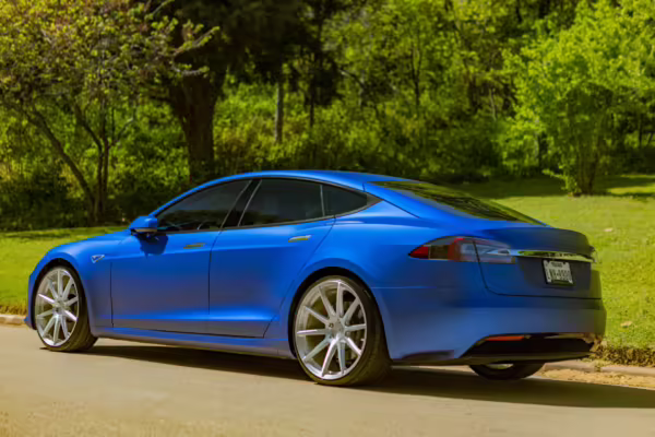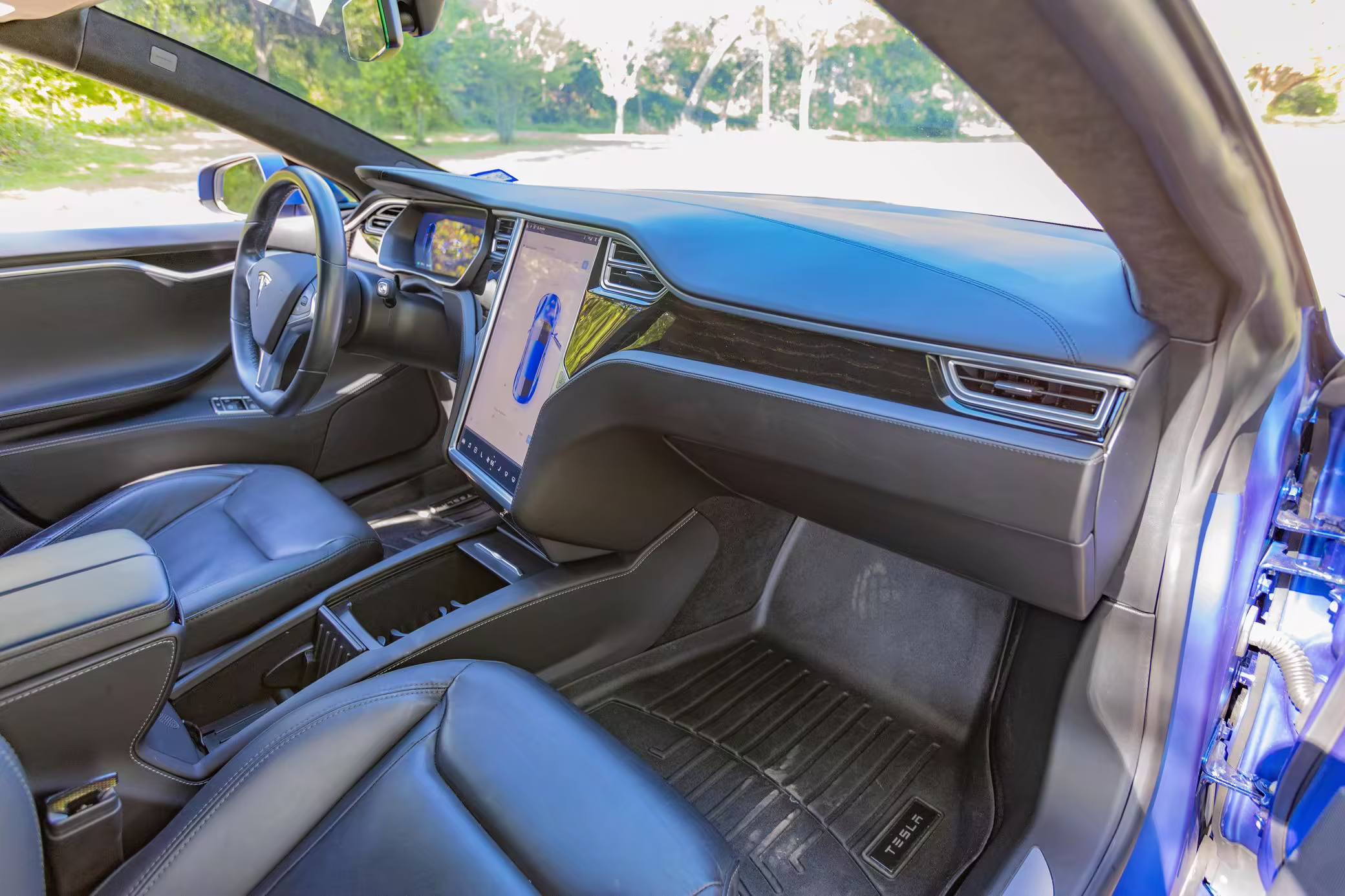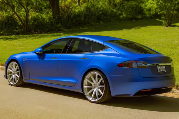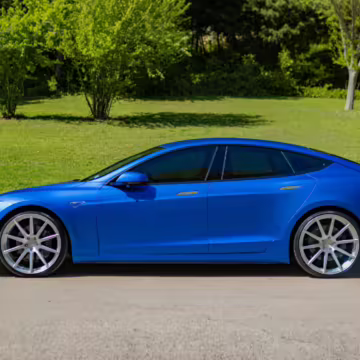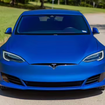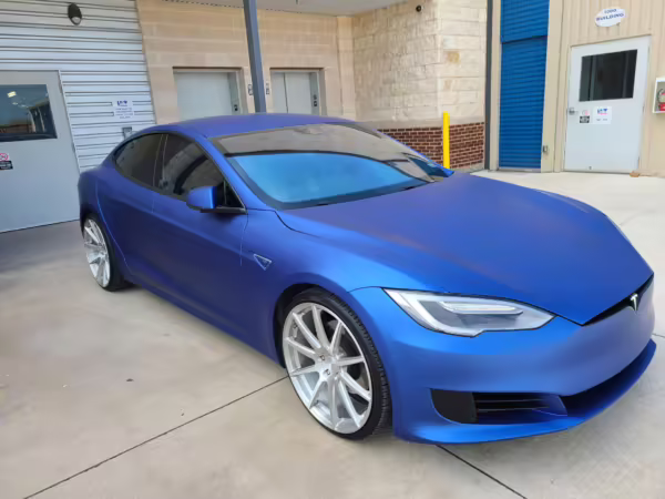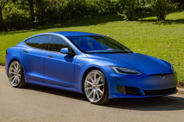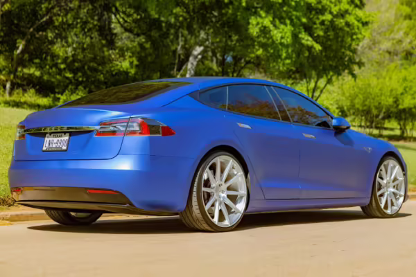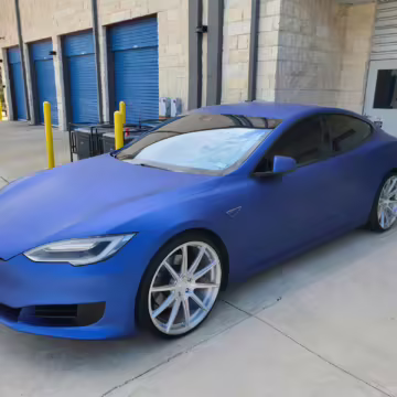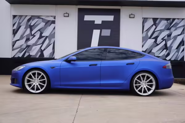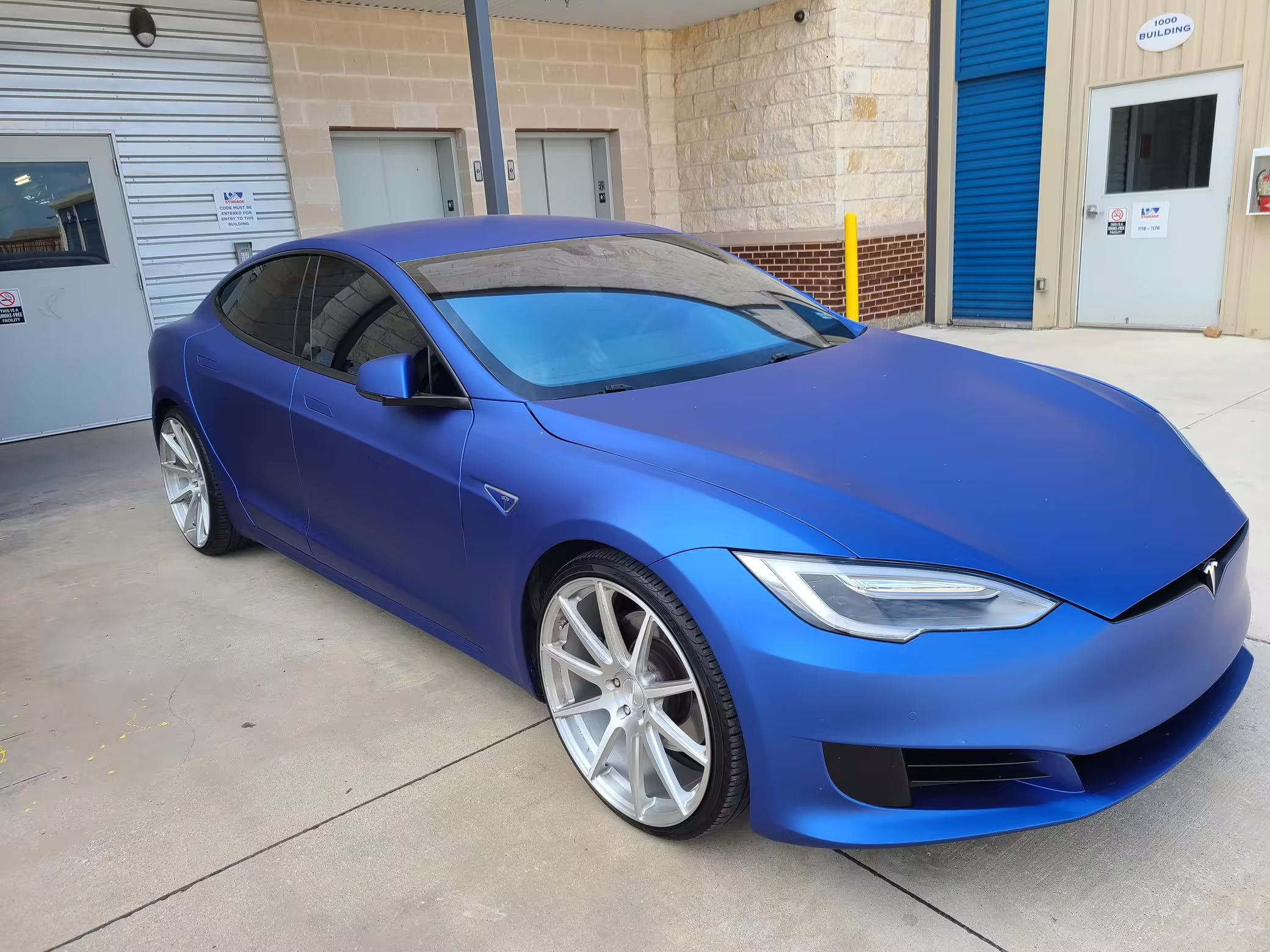 2016 Tesla Model S 75, finished in blue with an Avery Intelligent Blue wrap and a black leather interior.