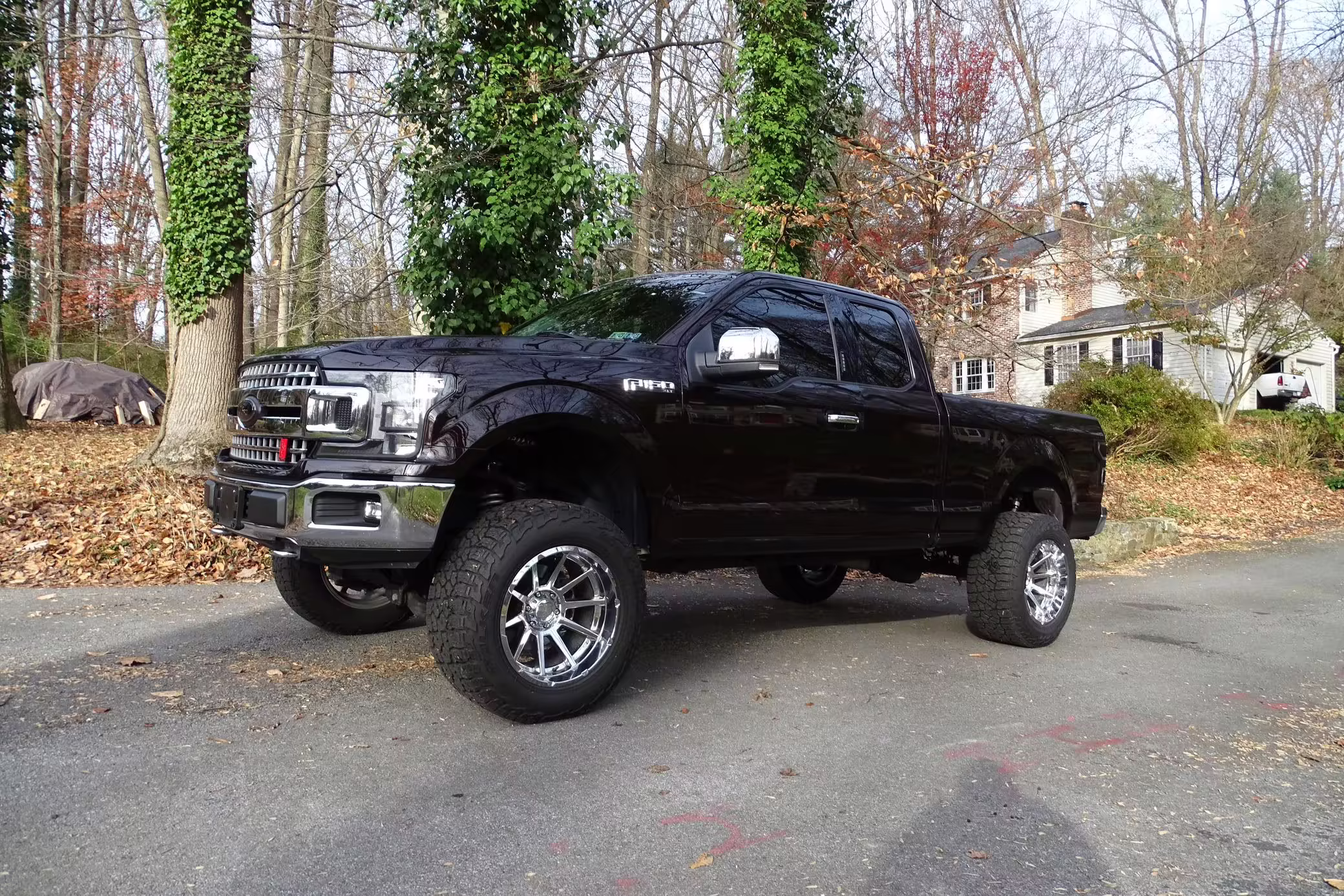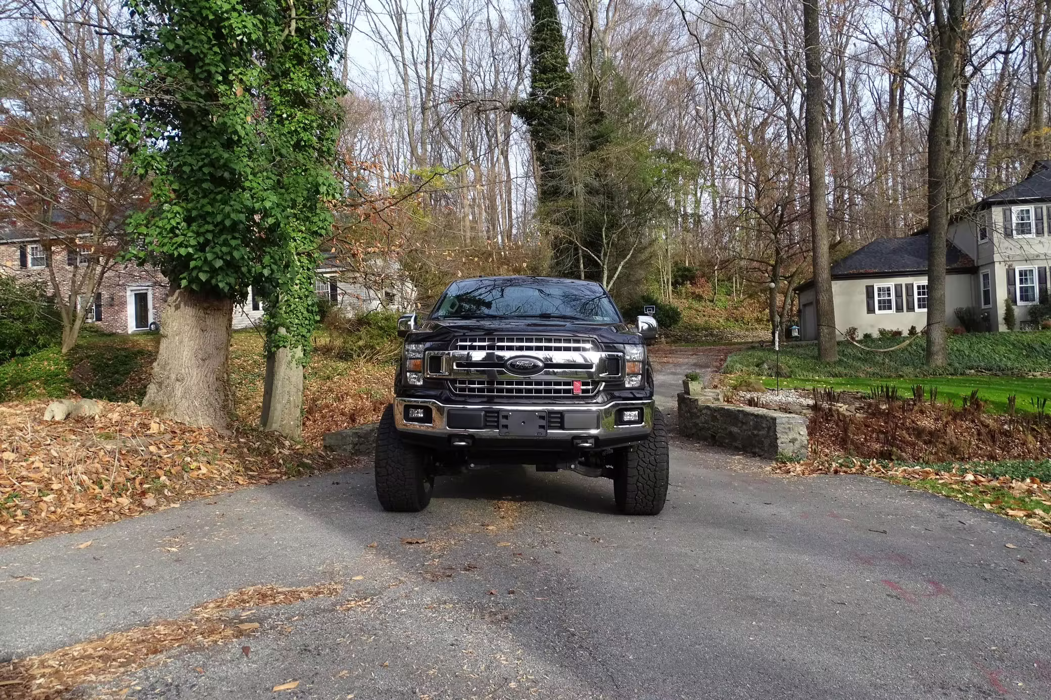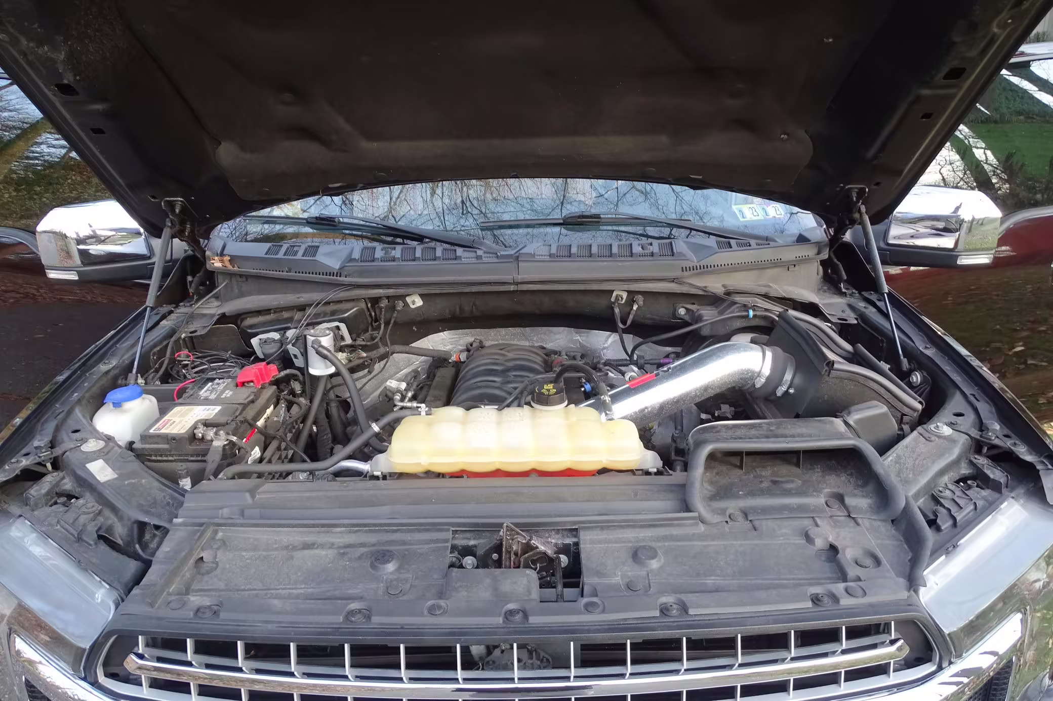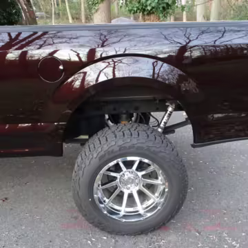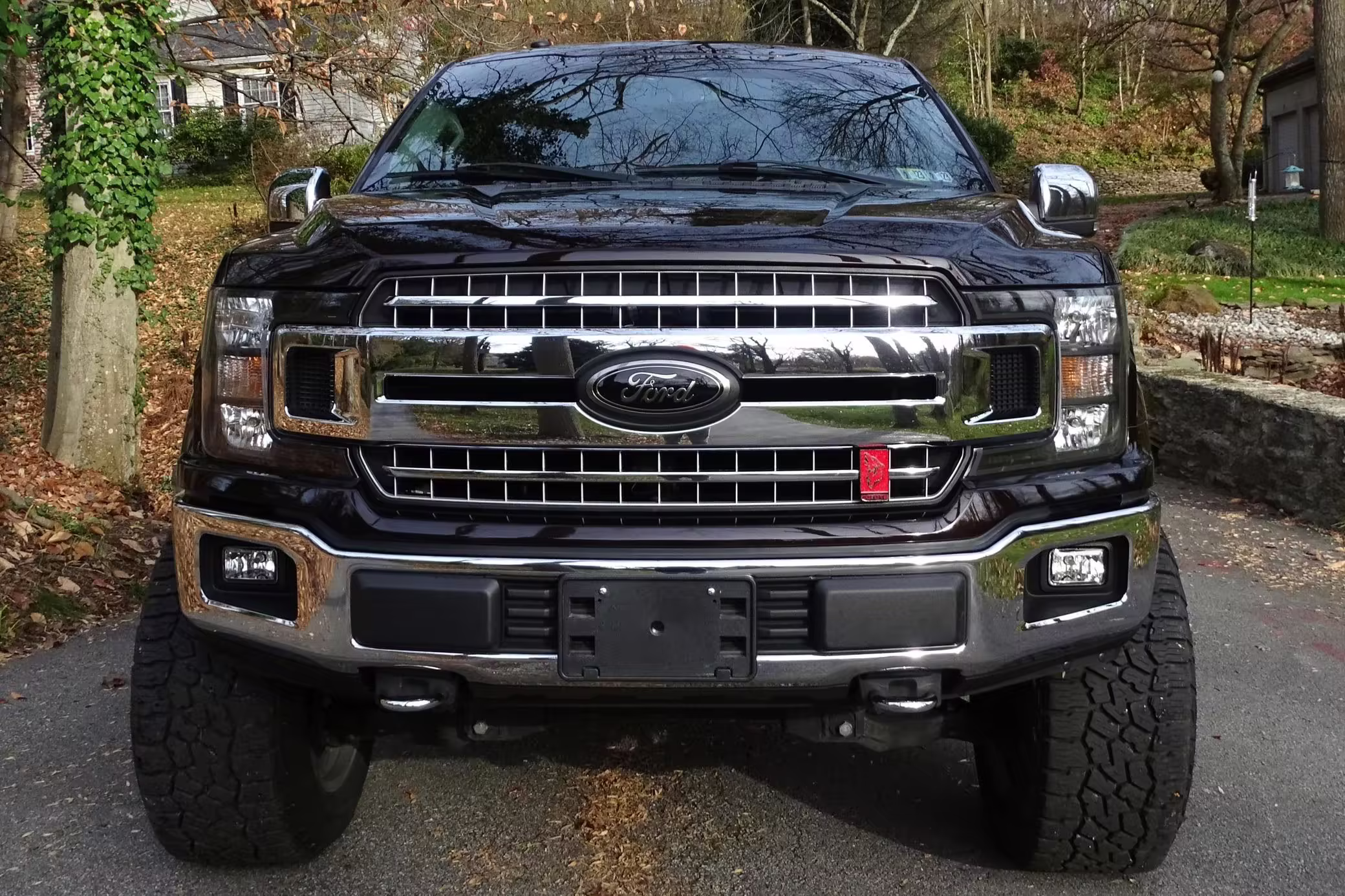 Factory suspension parts, headlights, intake with air filter, front air dam, spare tire, running boards, and “Ford” badges