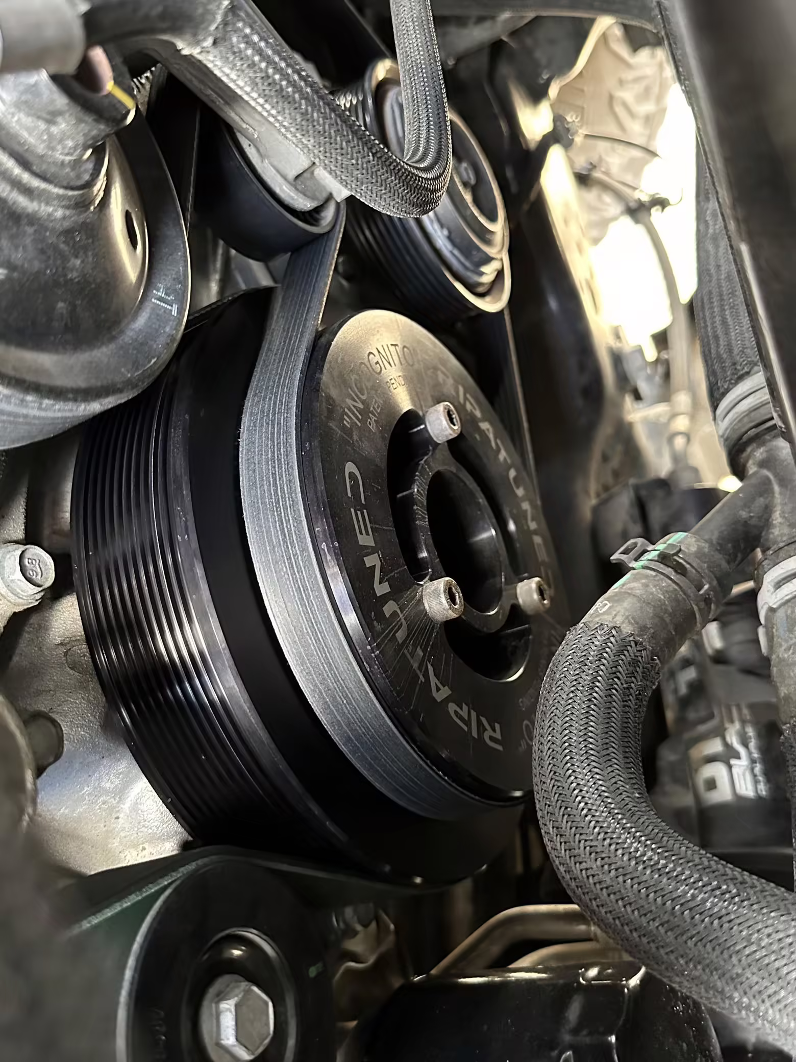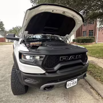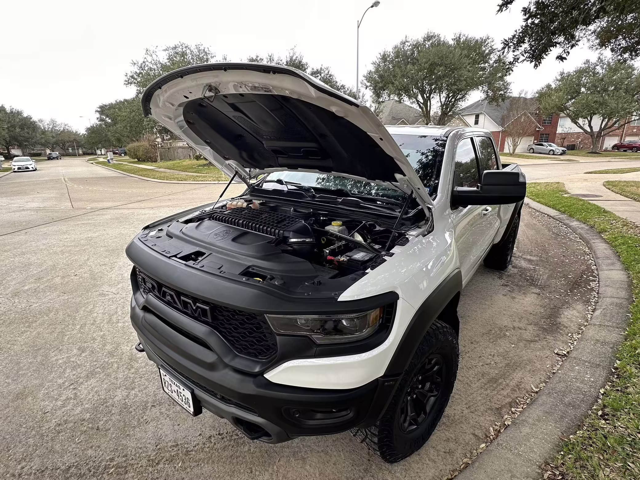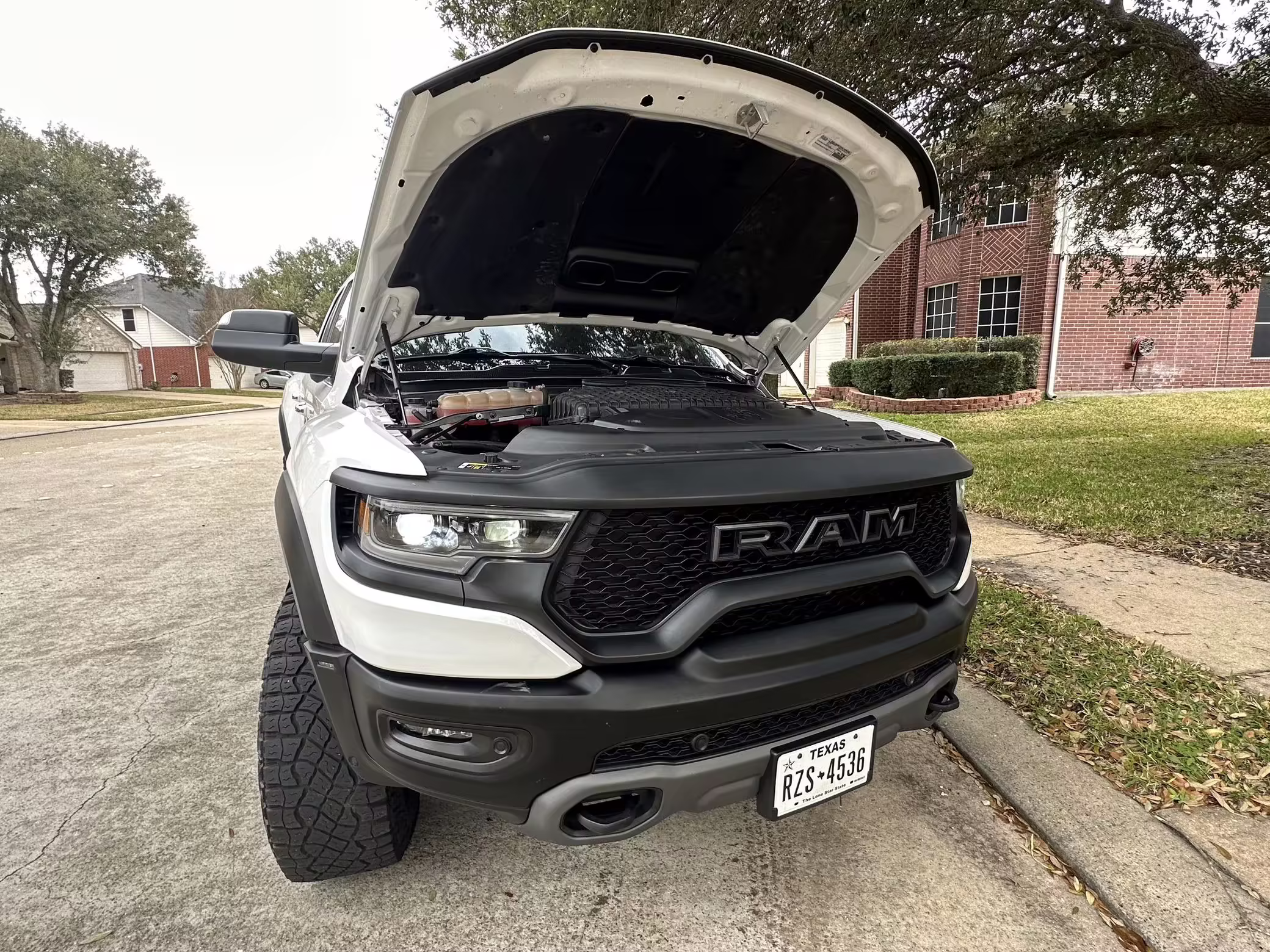 Modifications to this Ram are extensive, and the full list is detailed below. Highlights include the powertrain, suspension system, exterior body parts, and interior from a 2021 Ram 1500 TRX, a Ripatuned Incognito lower damper sleeve, a custom tune, a JLT catch can, and AMP Research power running boards.