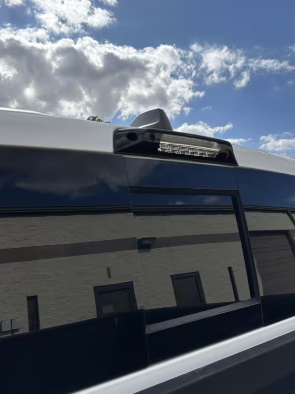 A window sticker is provided in the photo gallery showing an MSRP of $54,910 when new. Notable equipment includes a rear power sliding window, adjustable cargo tie-down hooks, LED bed lighting, a spray-in bedliner, remote tailgate release, power-adjustable pedals with memory, dual-zone automatic climate control, remote start, blind-spot monitoring, and ParkSense.