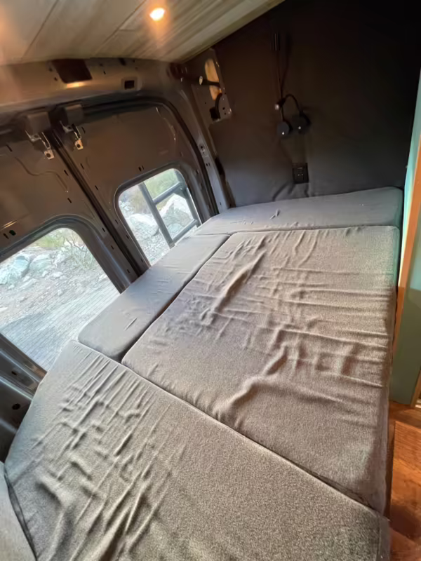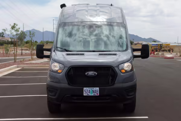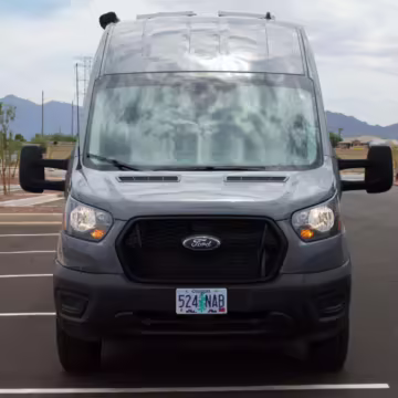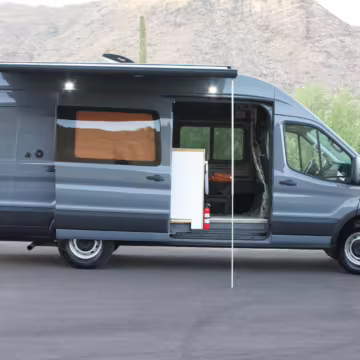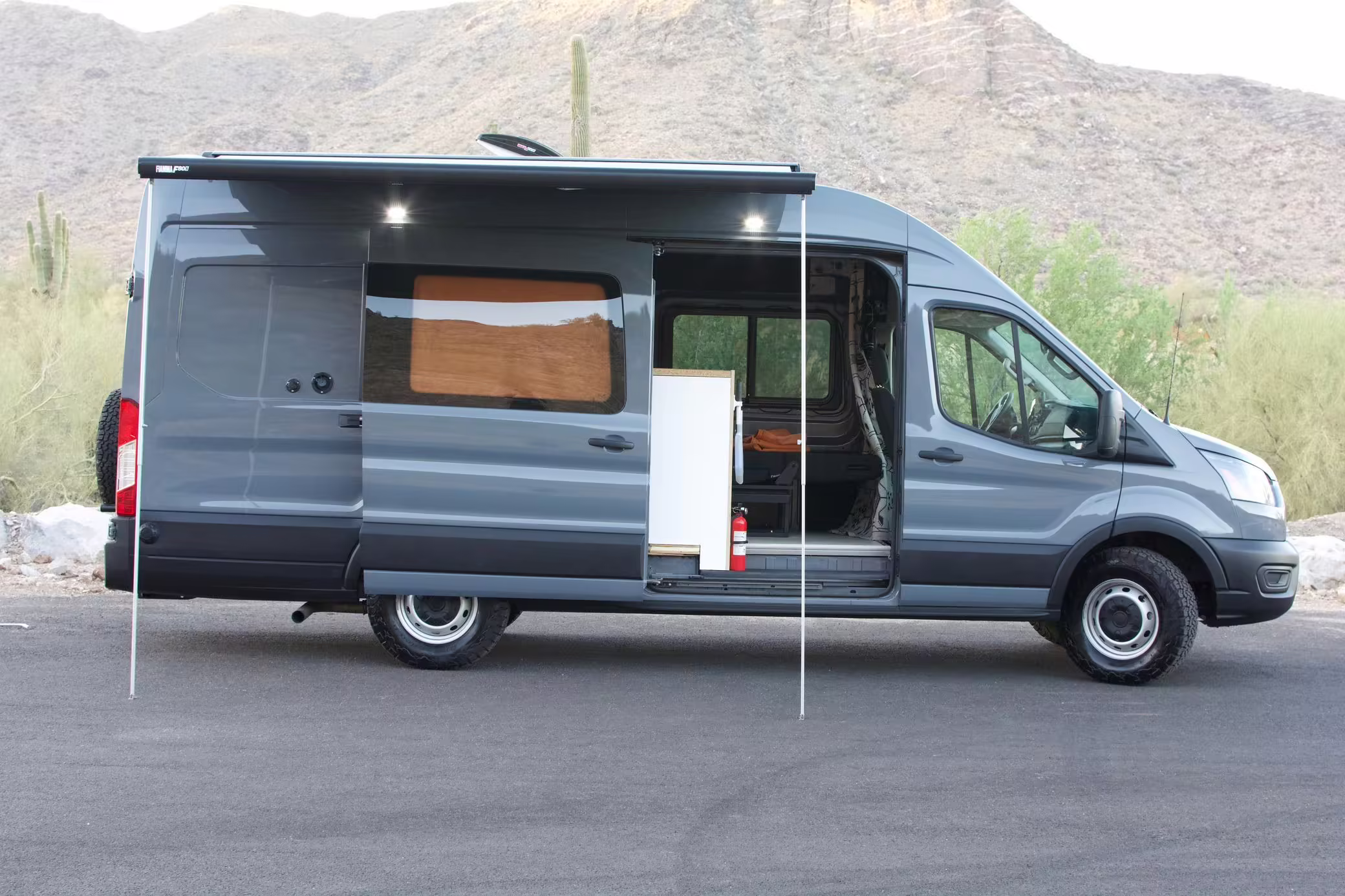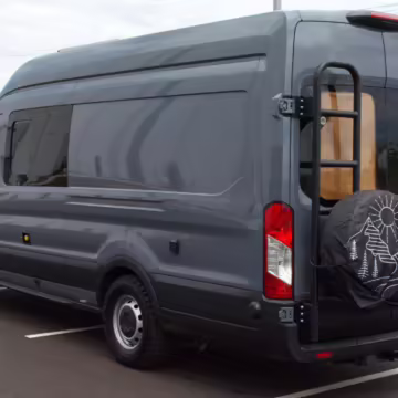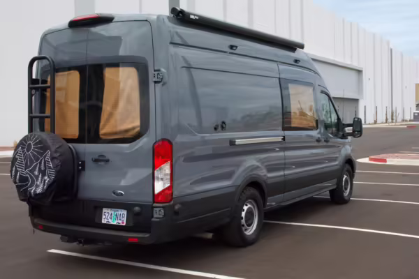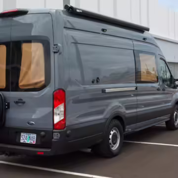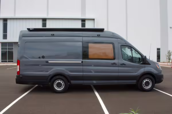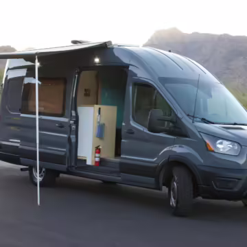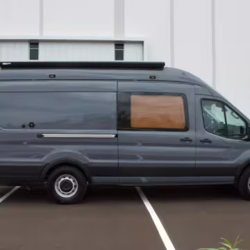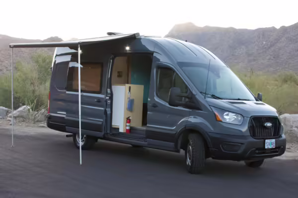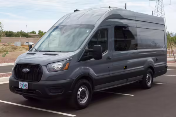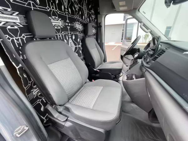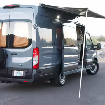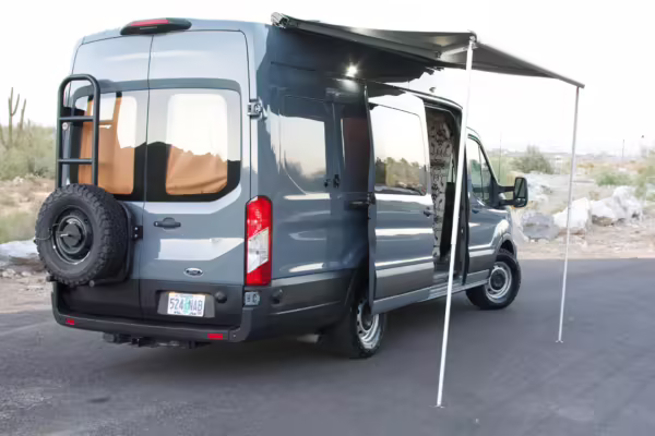 This Transit has been converted to a custom camper van. Modifications reported by the seller include 2 100-watt solar panels, a 12.5-foot wide and 7-foot extending Fiamma F80s awning, a rear sleeping and dining area with convertible 6-foot queen-size bed, a 6-drawer kitchen galley with hold-down straps, a CAN Campervan two-burner propane cooktop with sink, and more as detailed below.