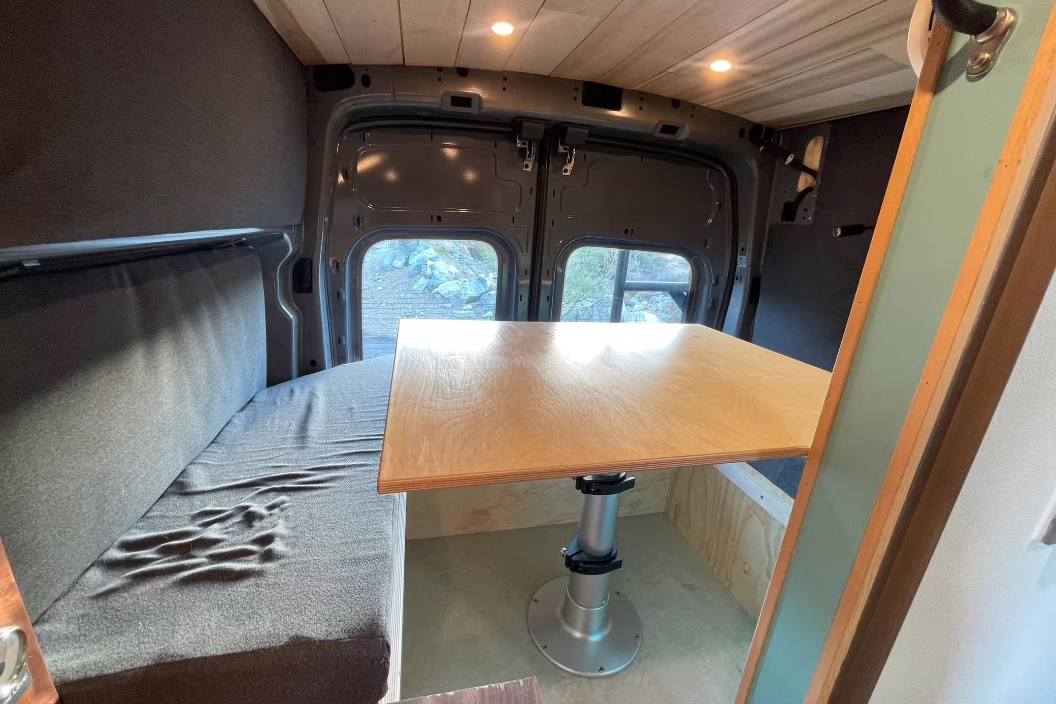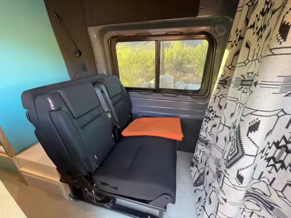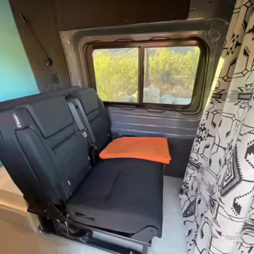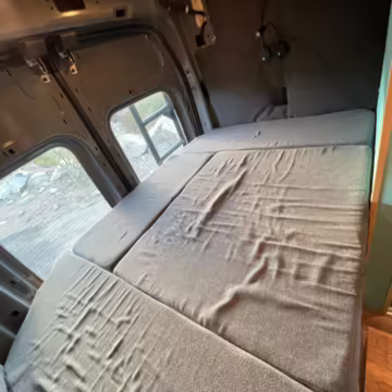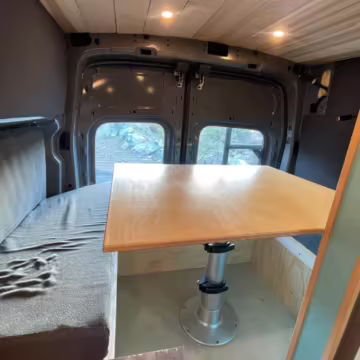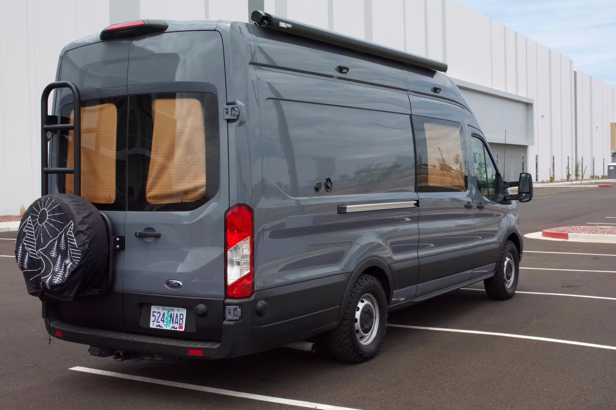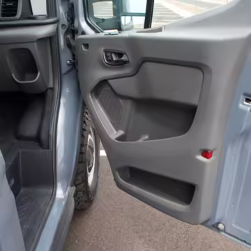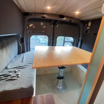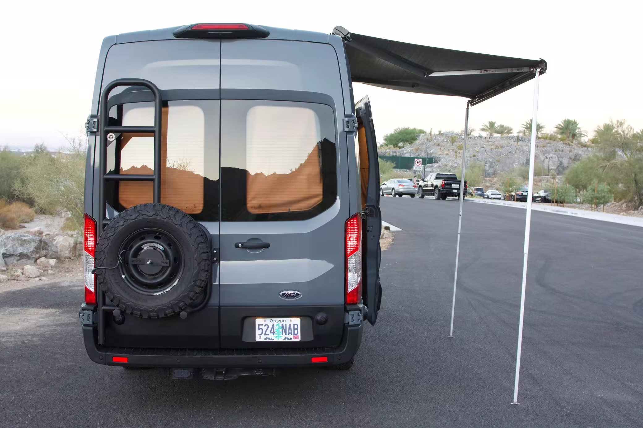 This Transit has been converted to a custom camper van. Modifications reported by the seller include 2 100-watt solar panels, a 12.5-foot wide and 7-foot extending Fiamma F80s awning, a rear sleeping and dining area with convertible 6-foot queen-size bed, a 6-drawer kitchen galley with hold-down straps, a CAN Campervan two-burner propane cooktop with sink, and more as detailed below.
