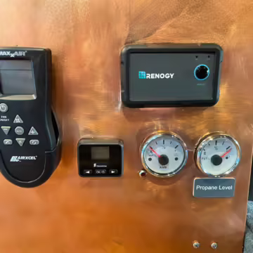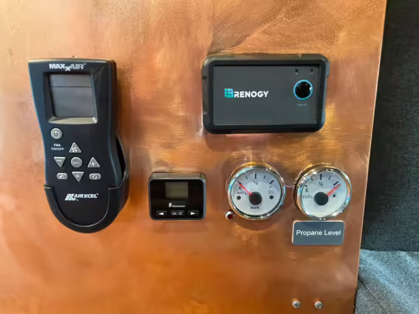 Command center with gauges for fresh water and propane levels, gray water 80% capacity warning light