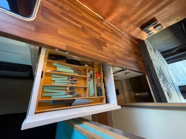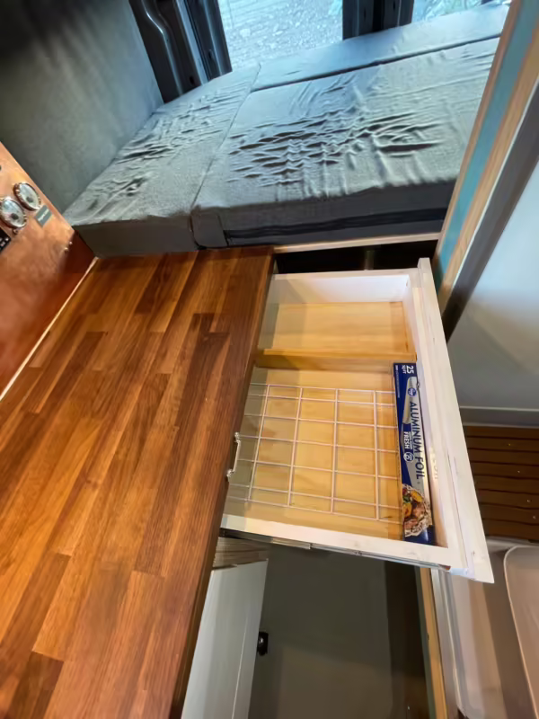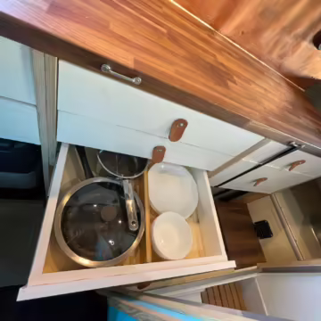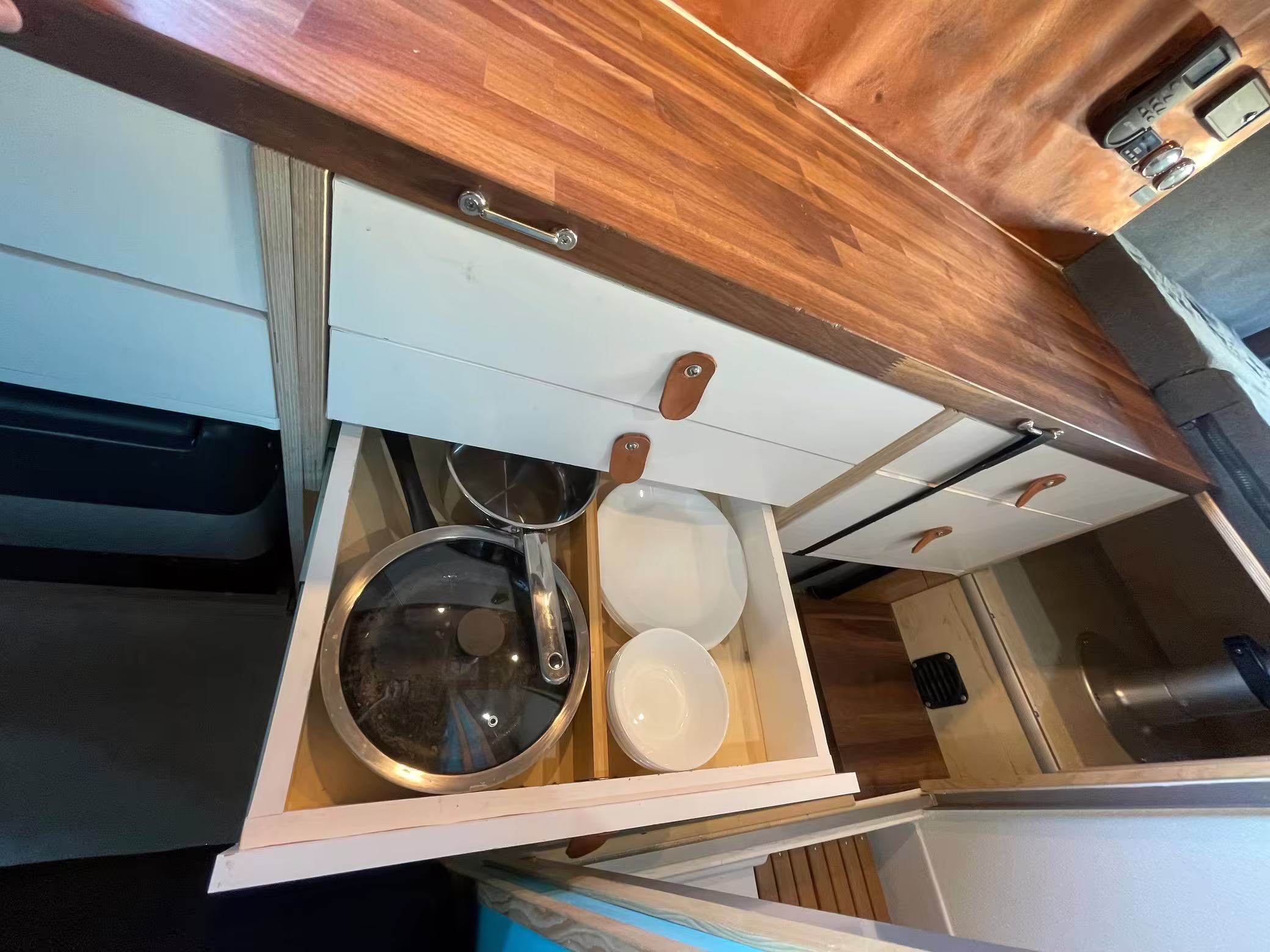 6-drawer kitchen galley with hold-down straps