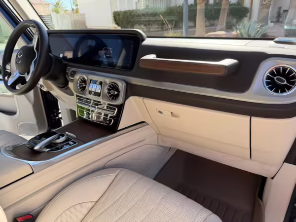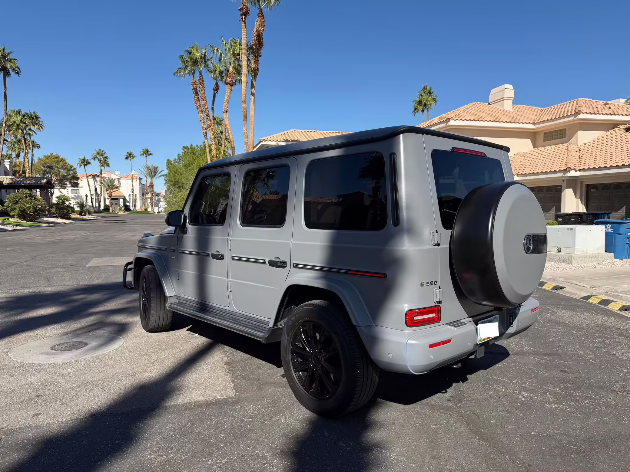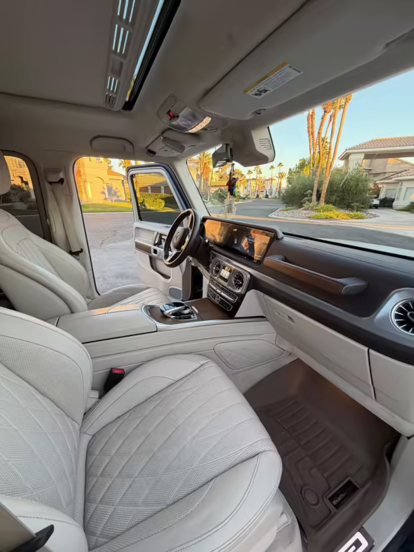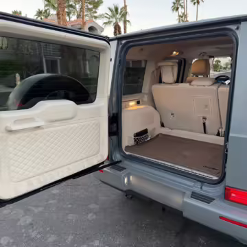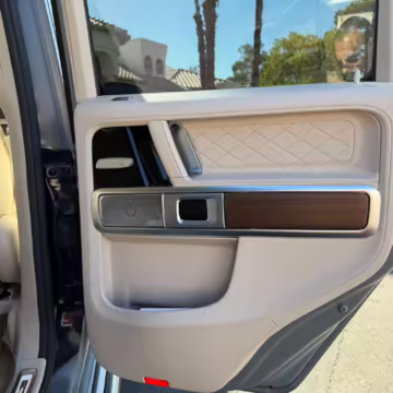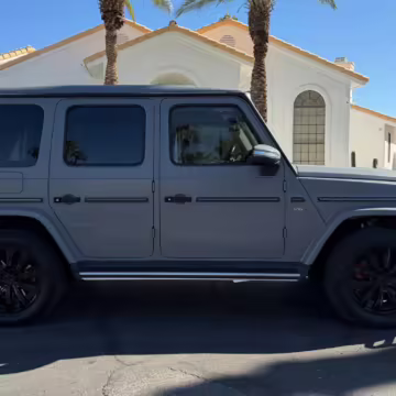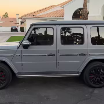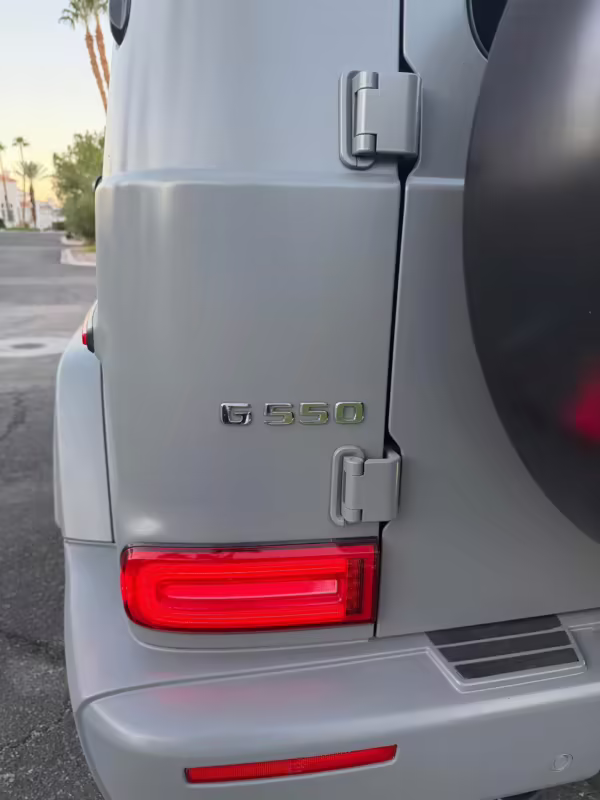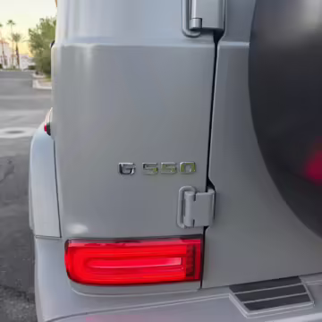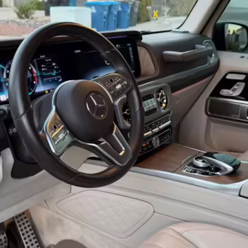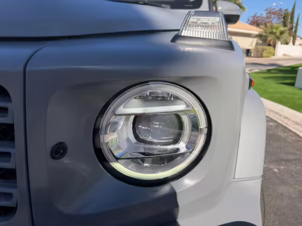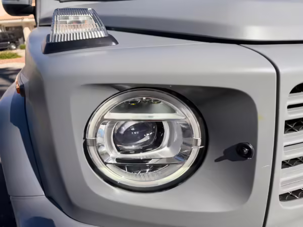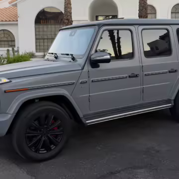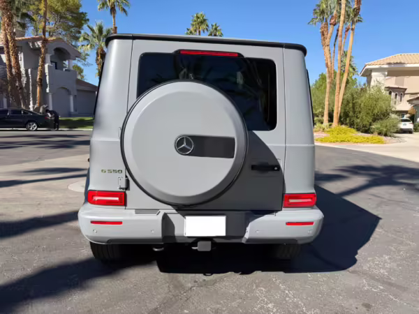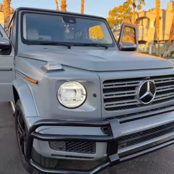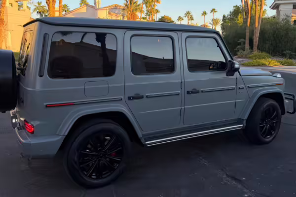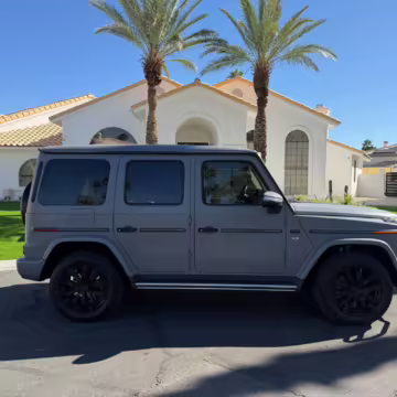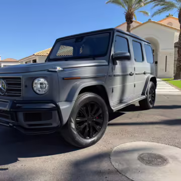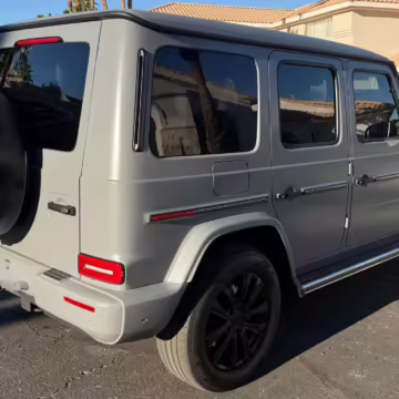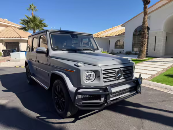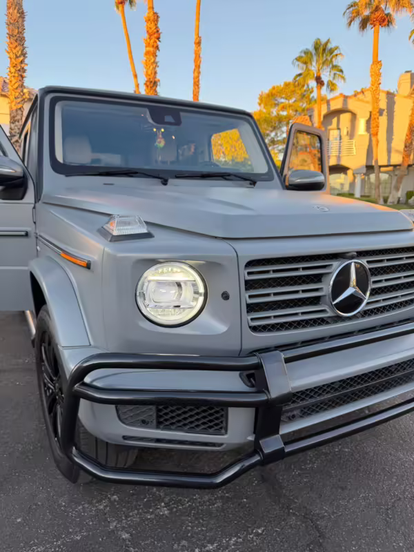 2021 Mercedes-Benz G550, finished in Lunar Blue with a gray Plasti-Dip wrap and a Designo Machiatto Beige and Espresso Brown interior.