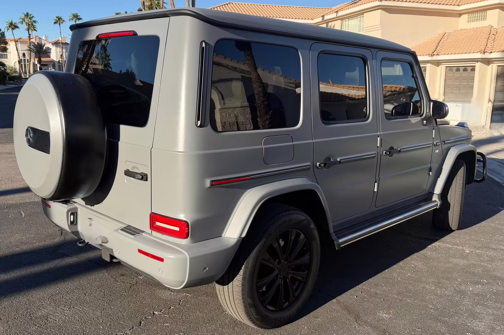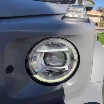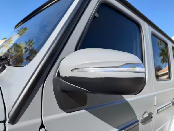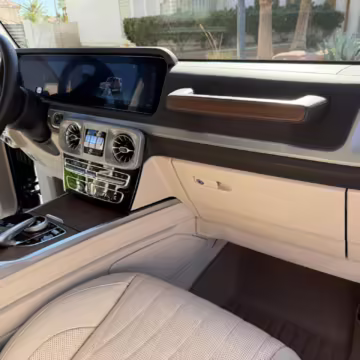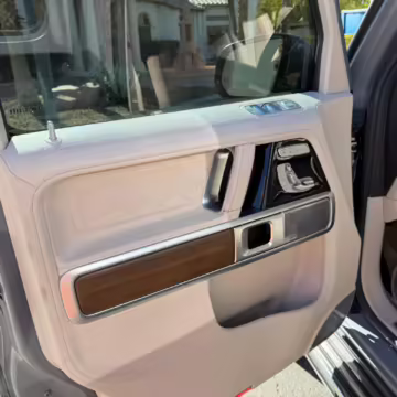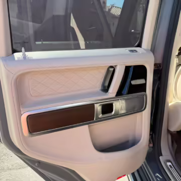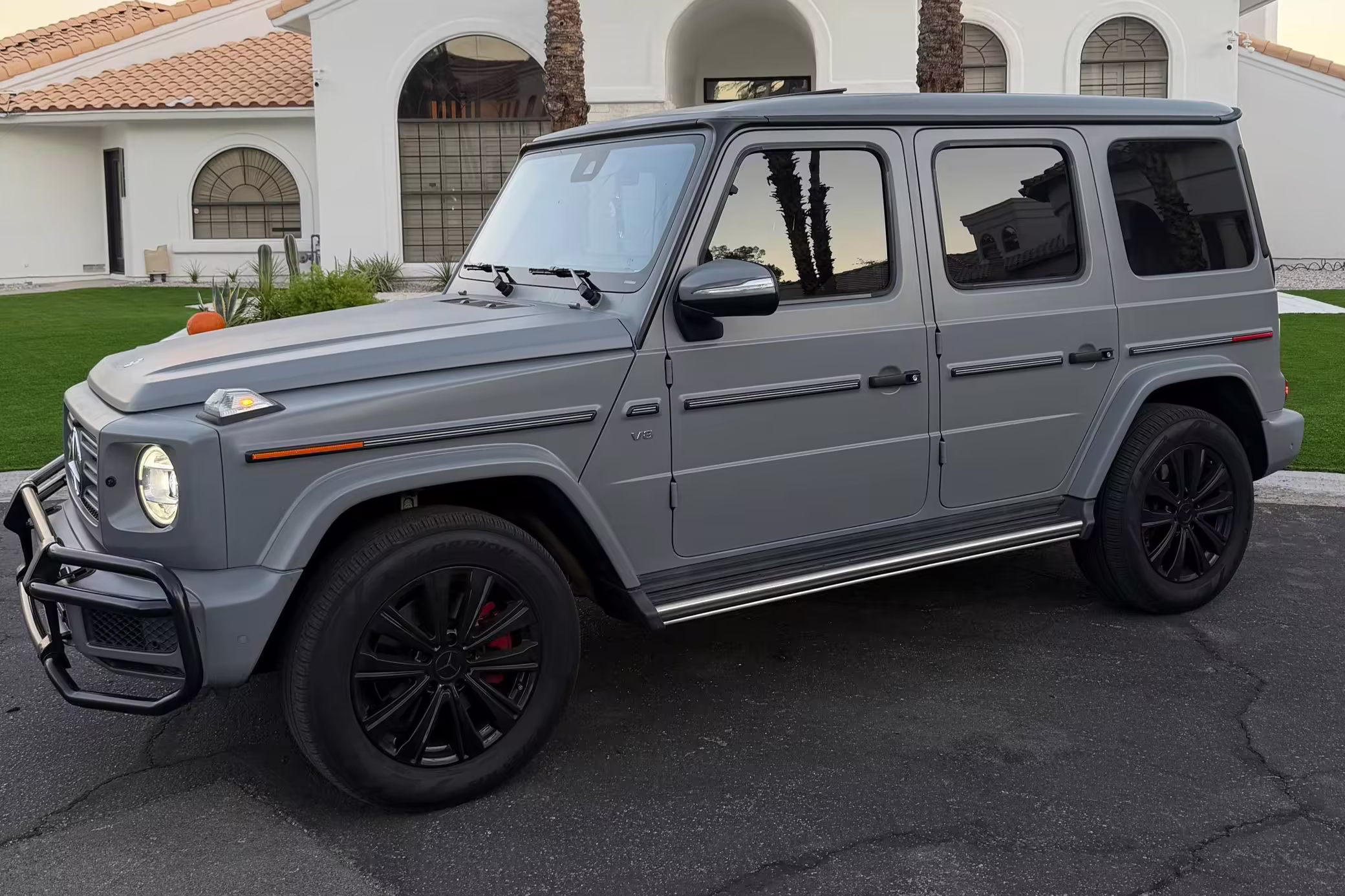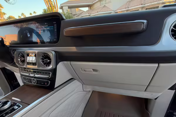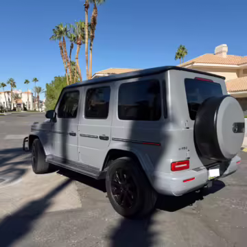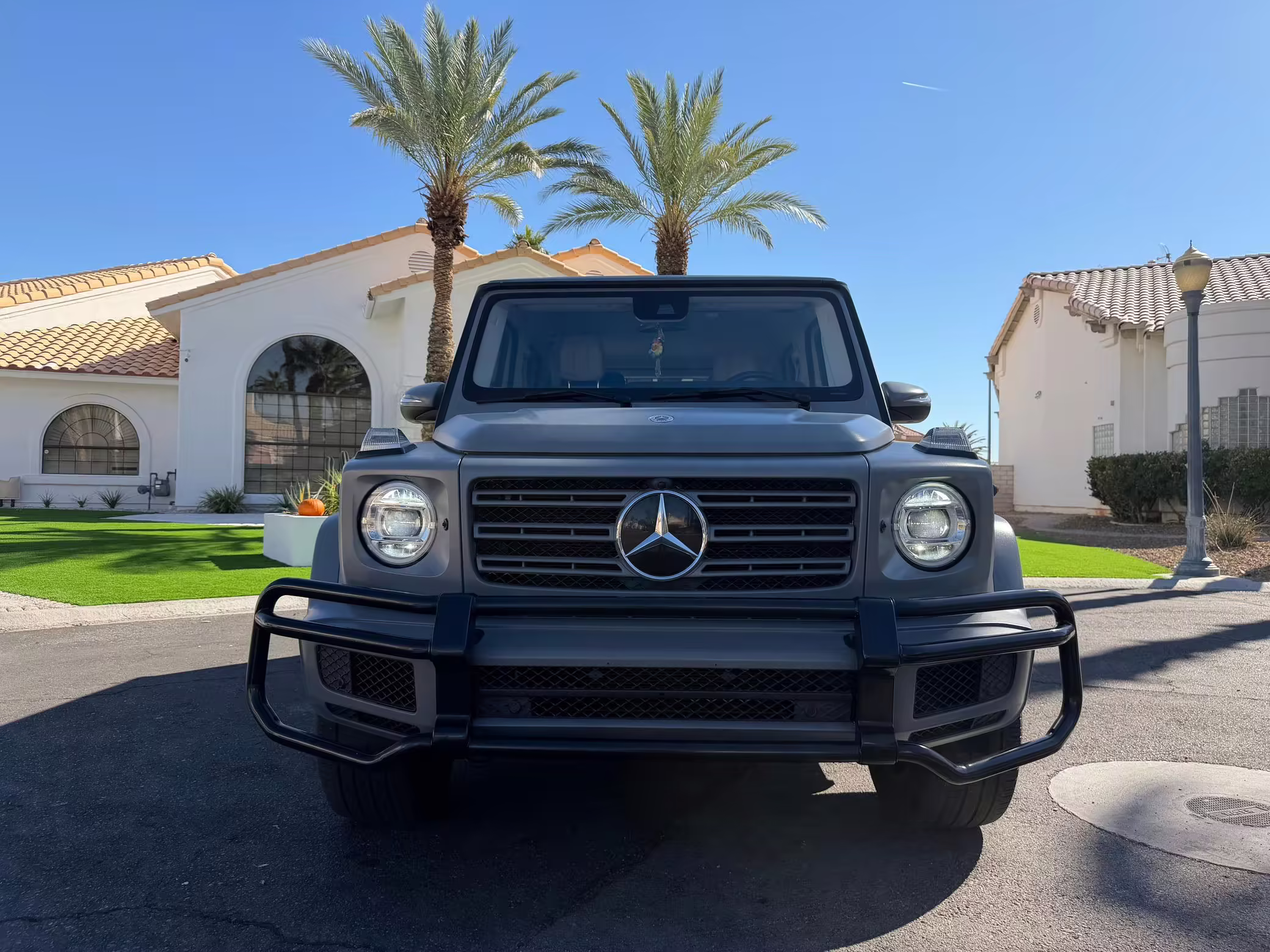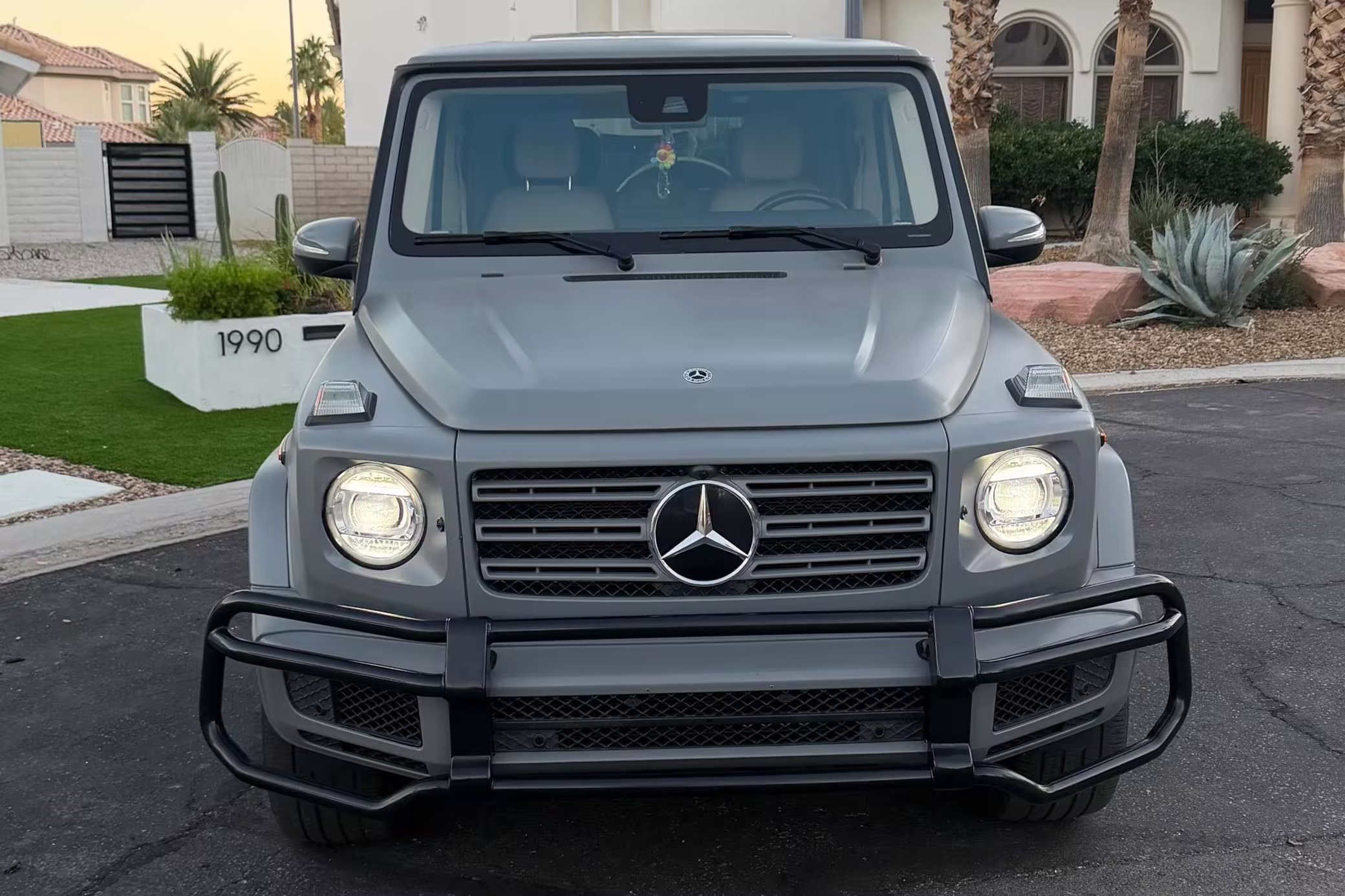 2021 Mercedes-Benz G550, finished in Lunar Blue with a gray Plasti-Dip wrap and a Designo Machiatto Beige and Espresso Brown interior.