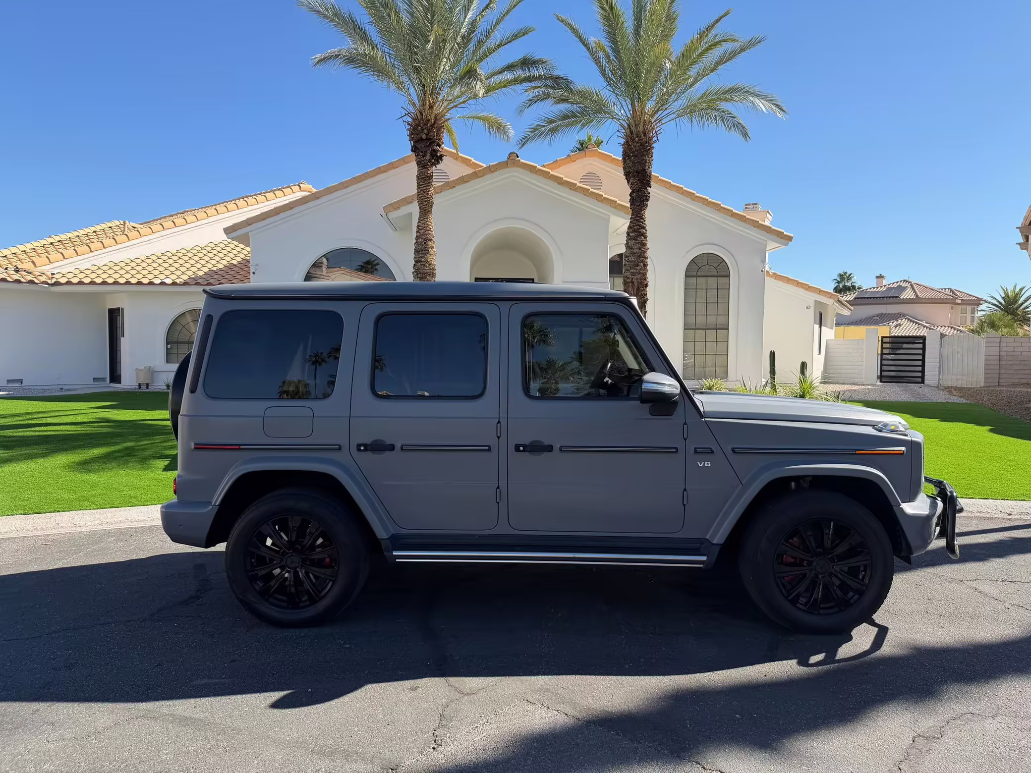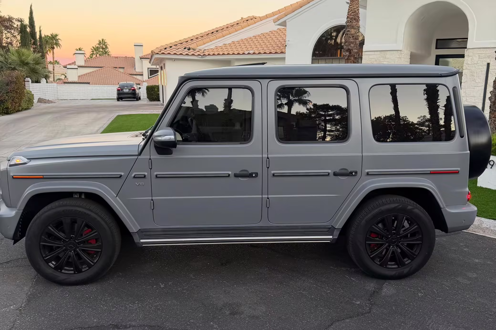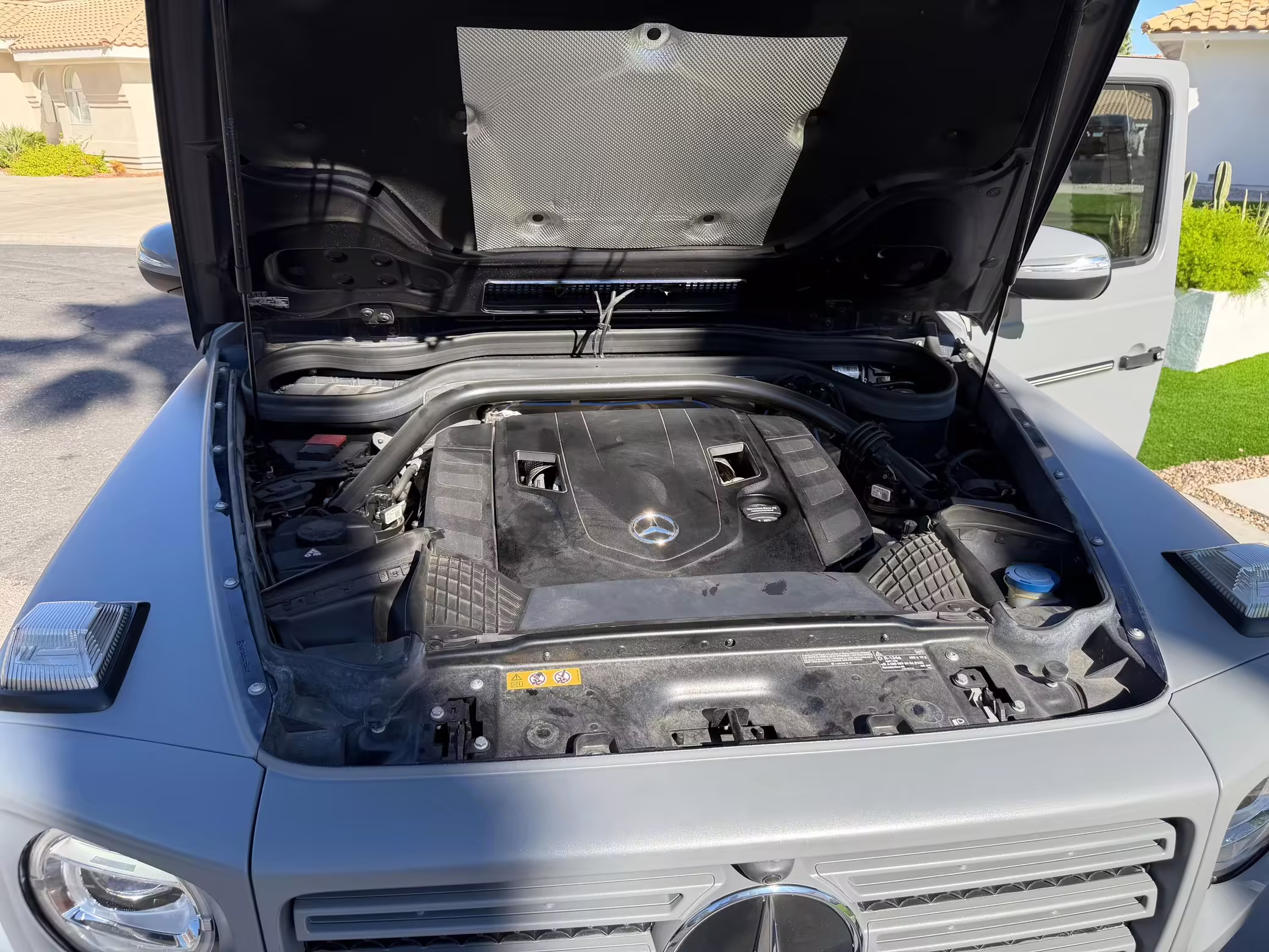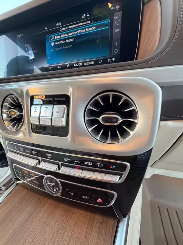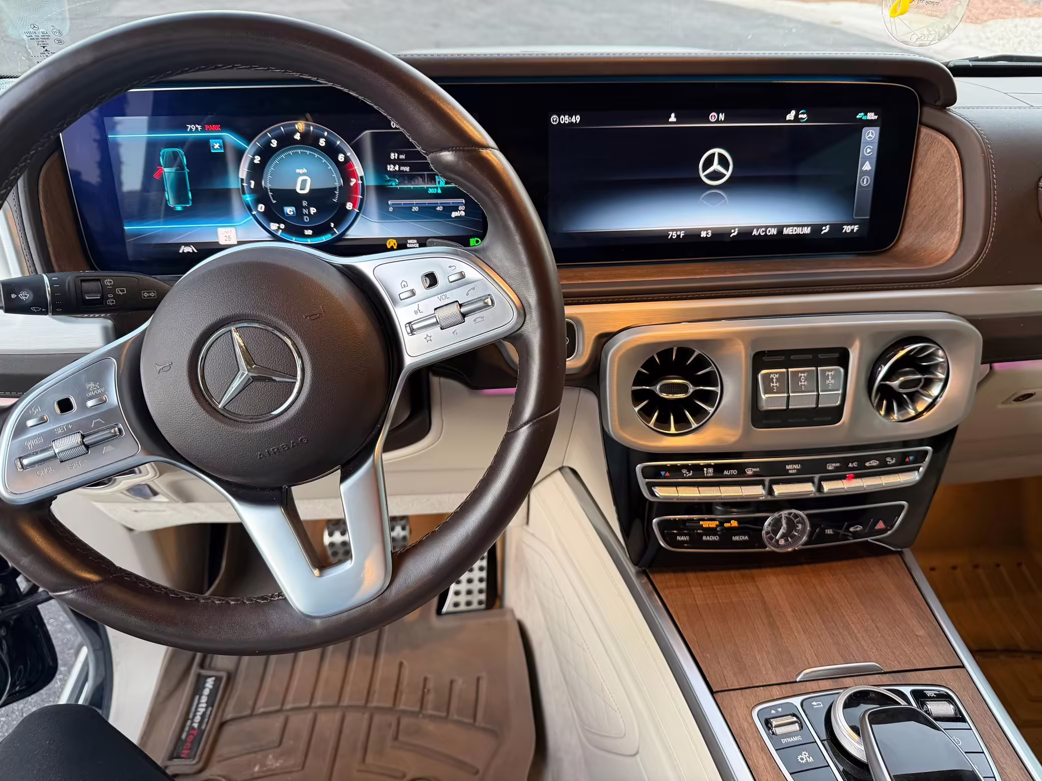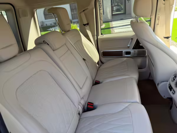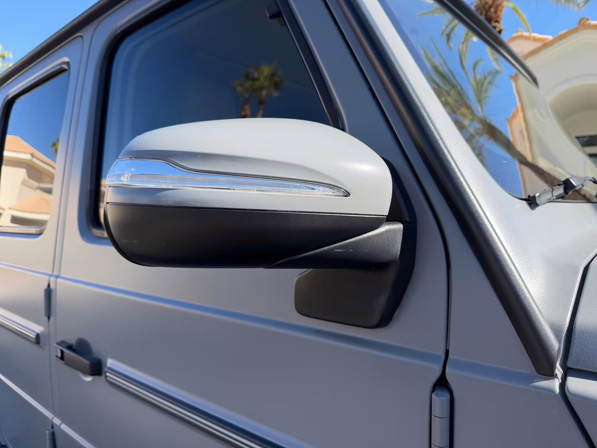 2021 Mercedes-Benz G550, finished in Lunar Blue with a gray Plasti-Dip wrap and a Designo Machiatto Beige and Espresso Brown interior.