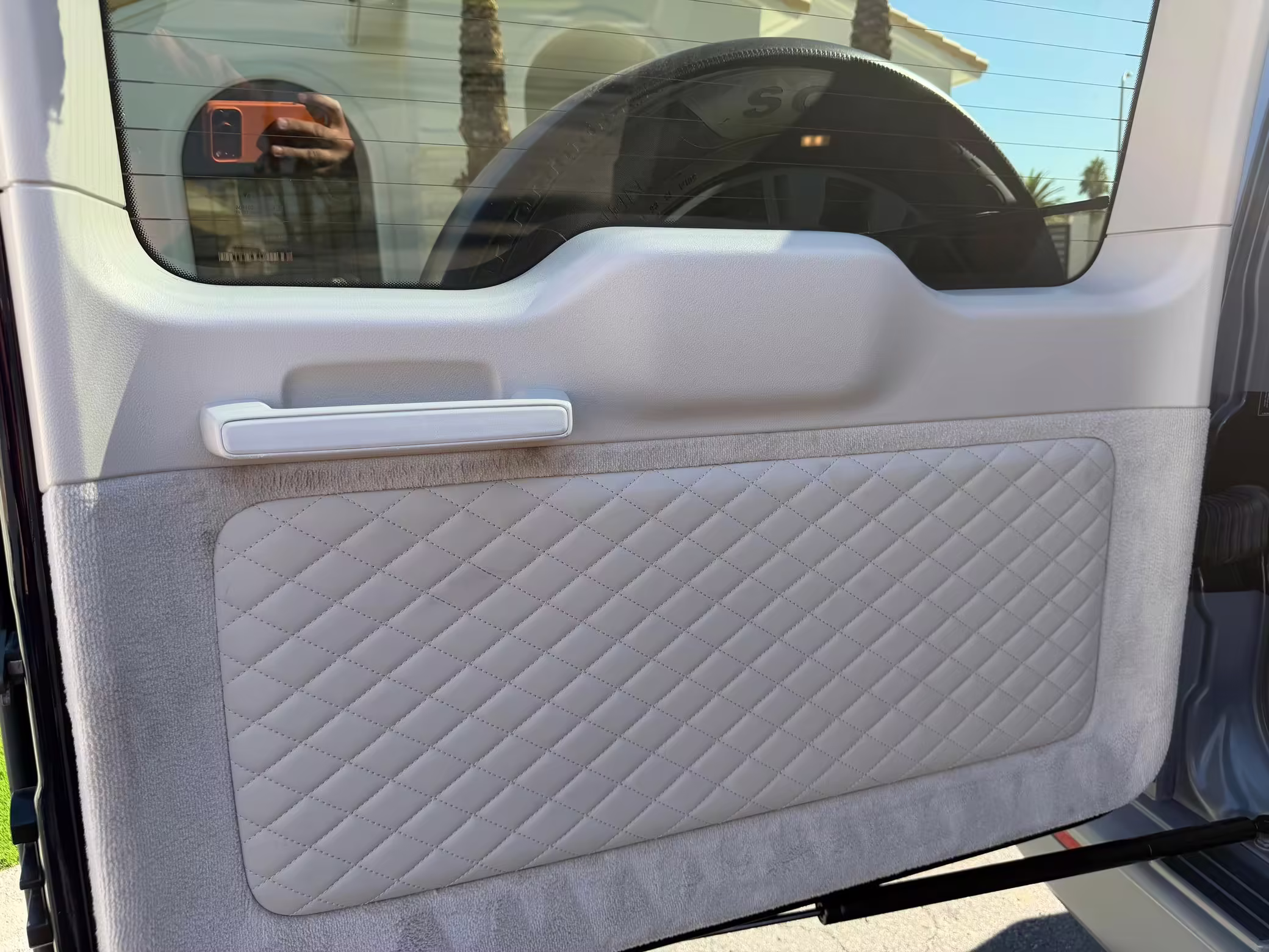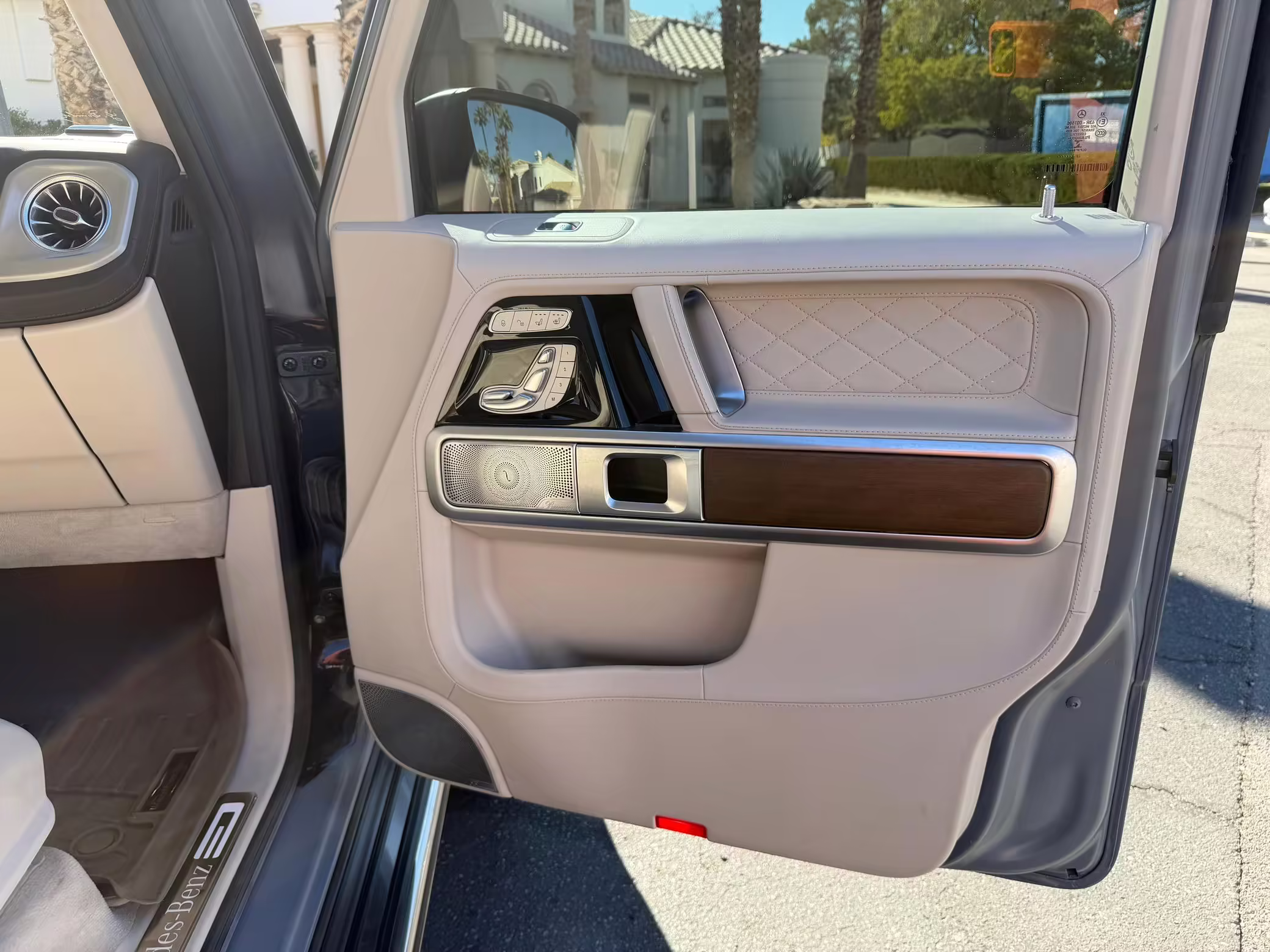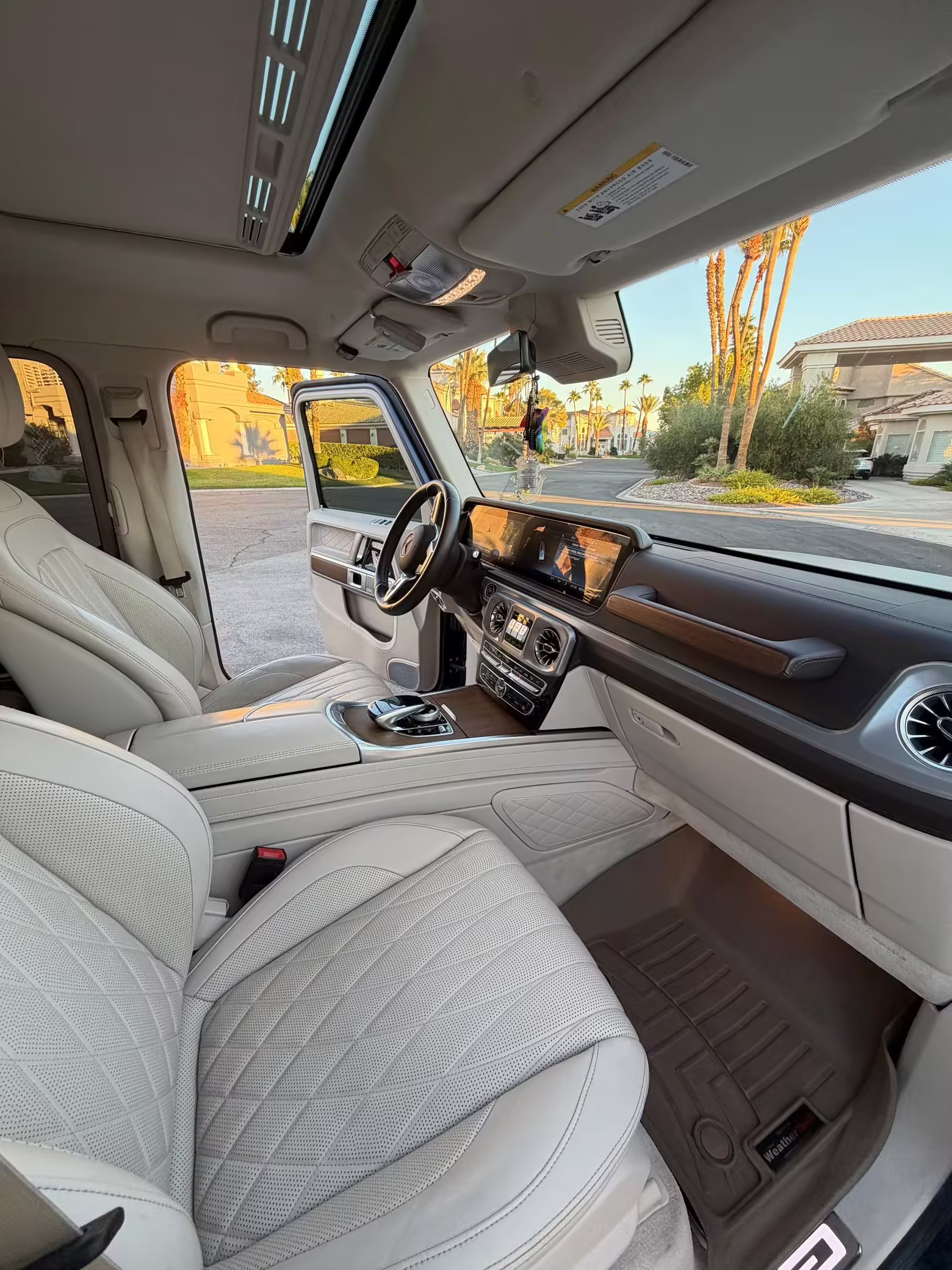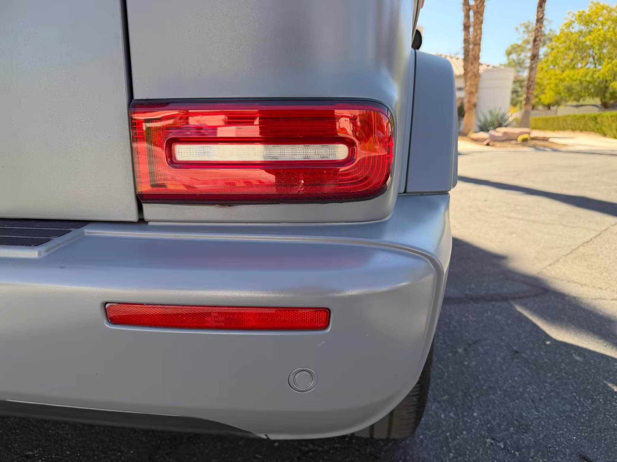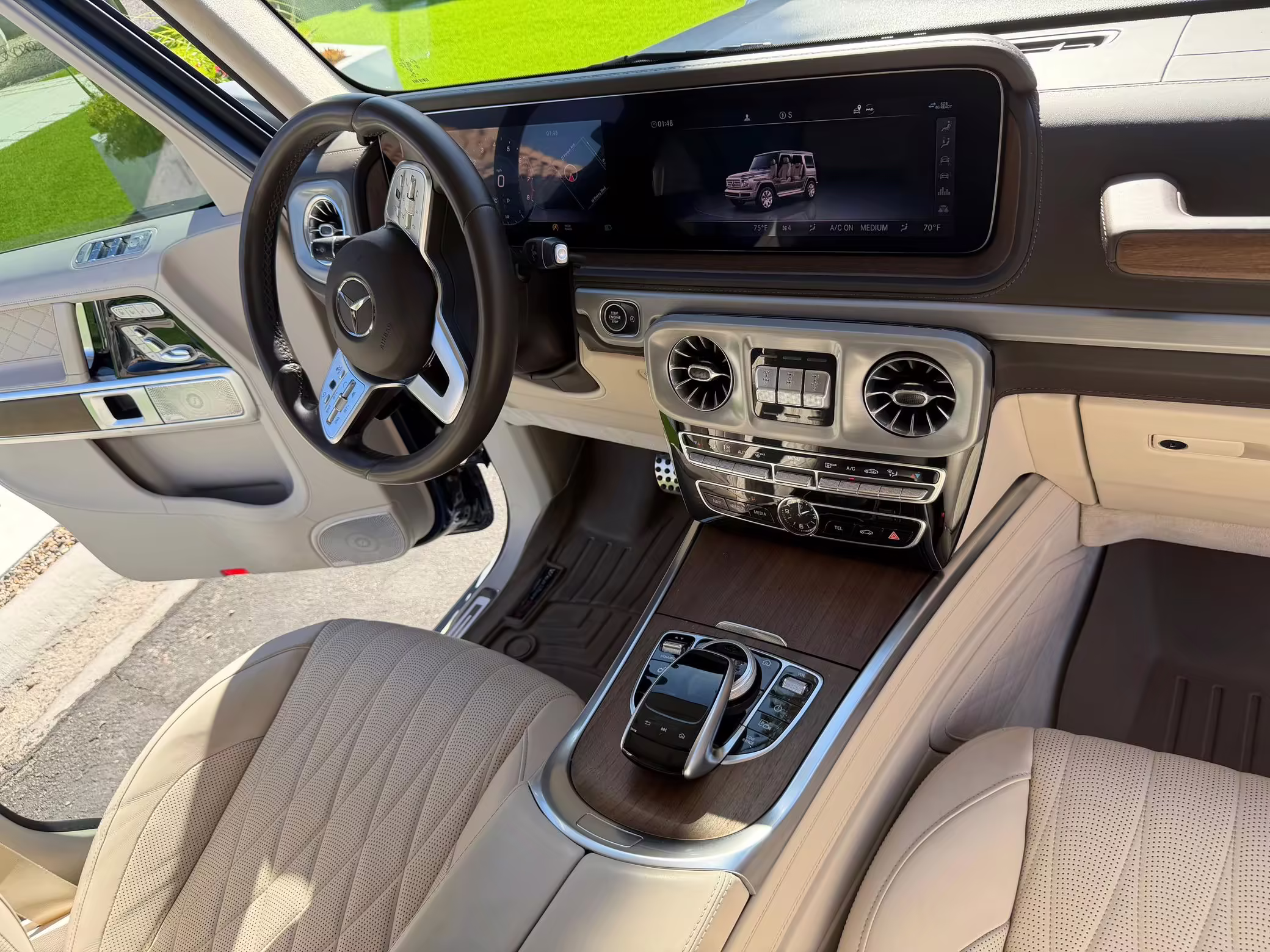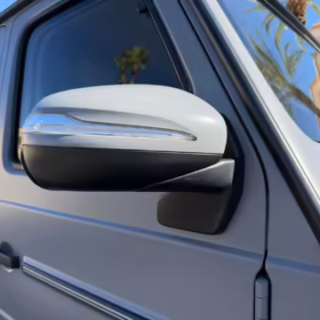 2021 Mercedes-Benz G550, finished in Lunar Blue with a gray Plasti-Dip wrap and a Designo Machiatto Beige and Espresso Brown interior.
