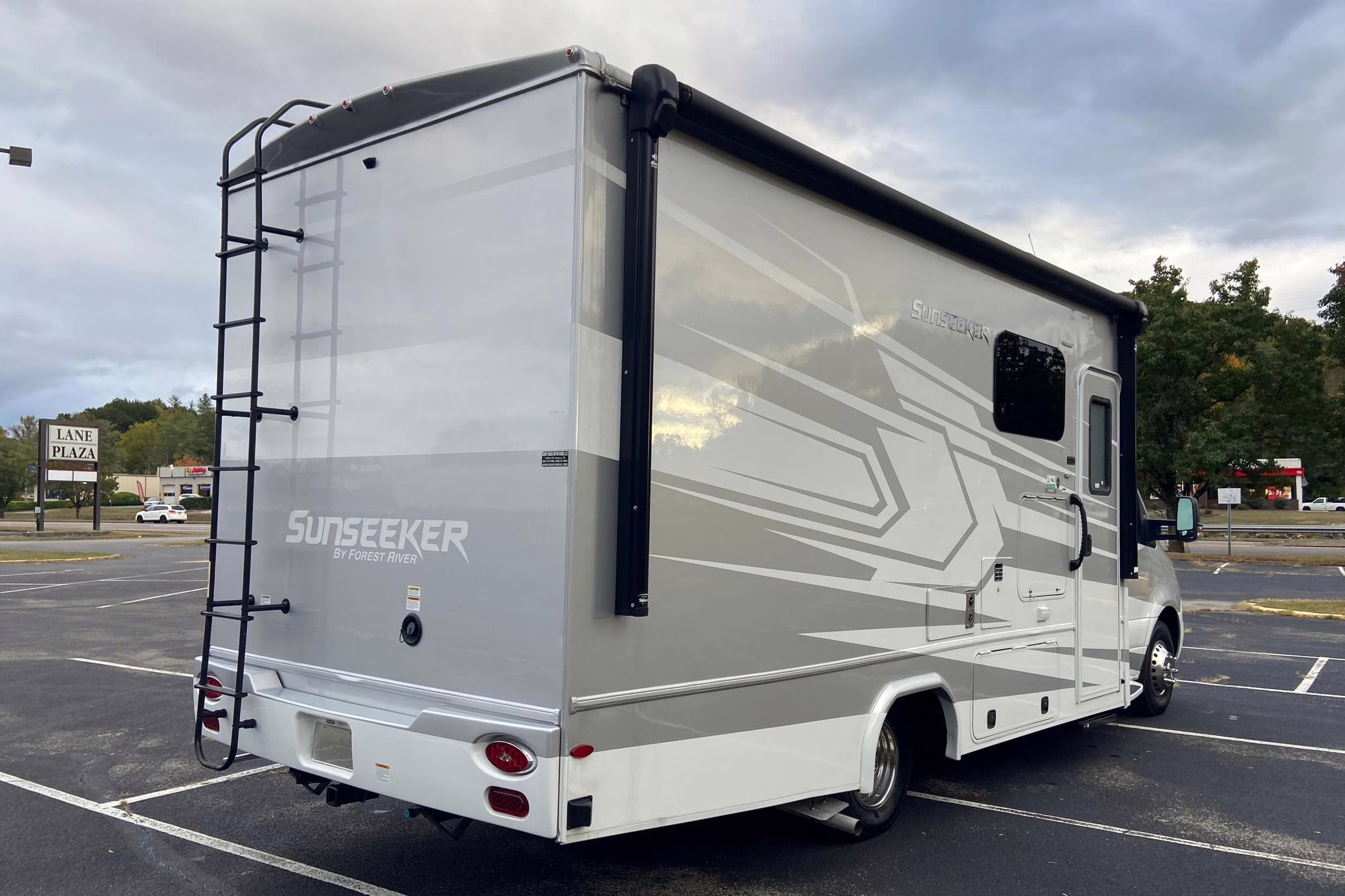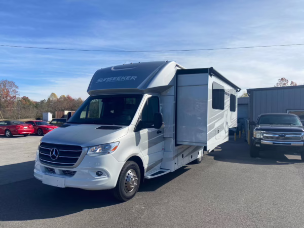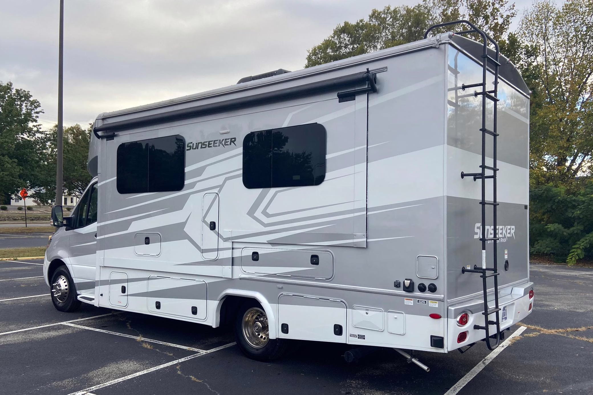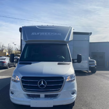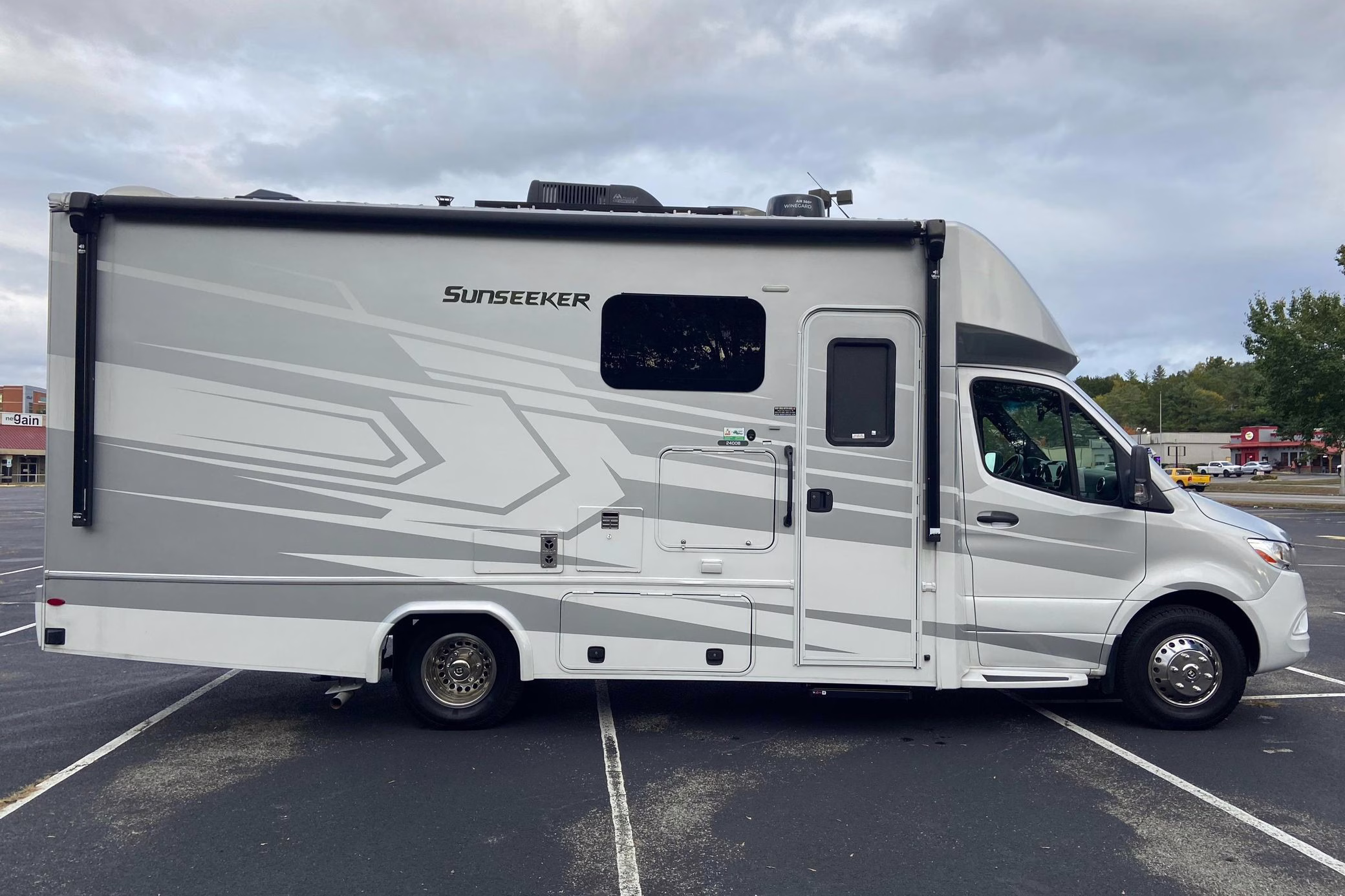 2021 Mercedes-Benz Sprinter 3500XD Sunseeker, finished in white and silver with a black and beige interior.