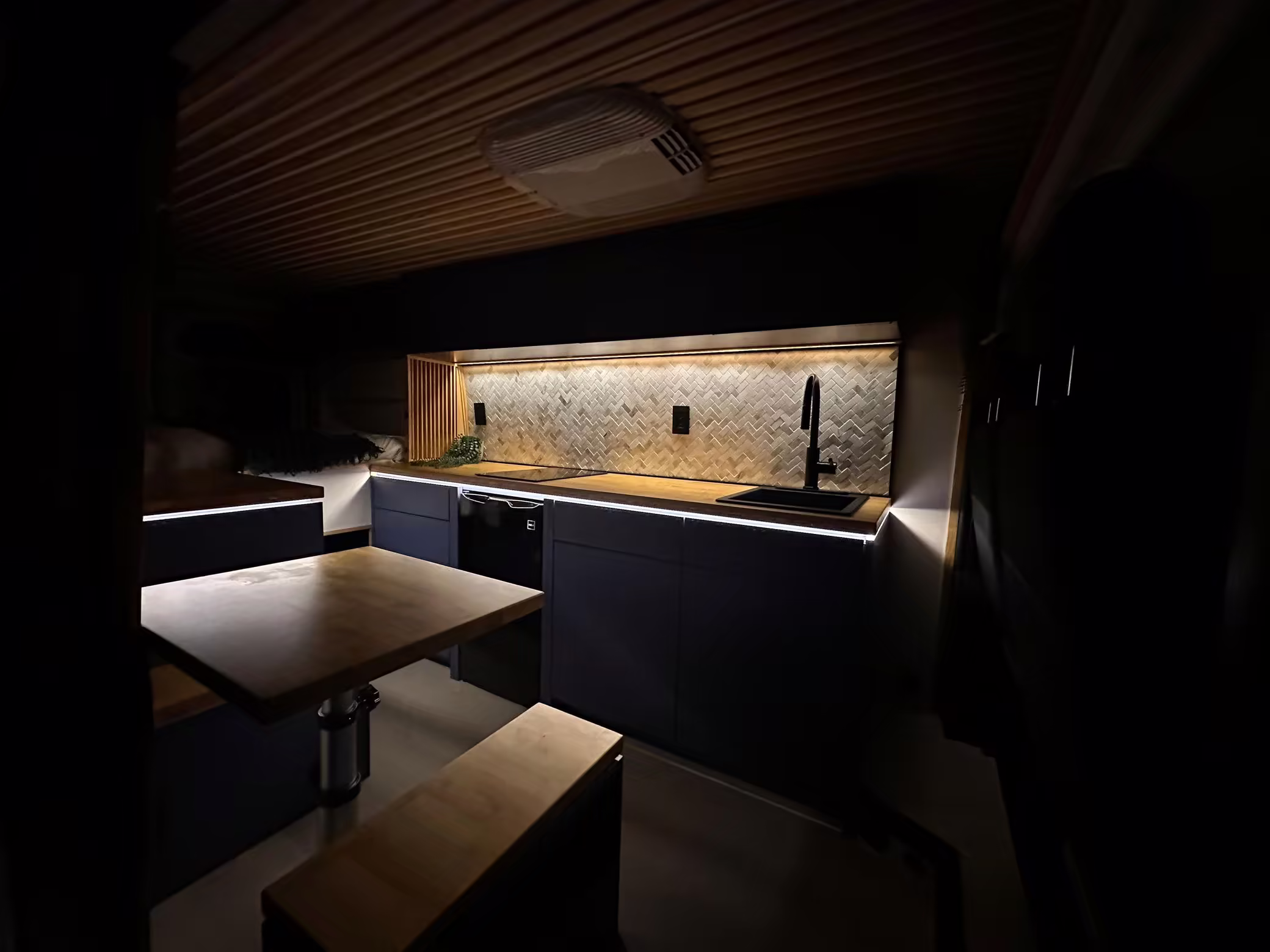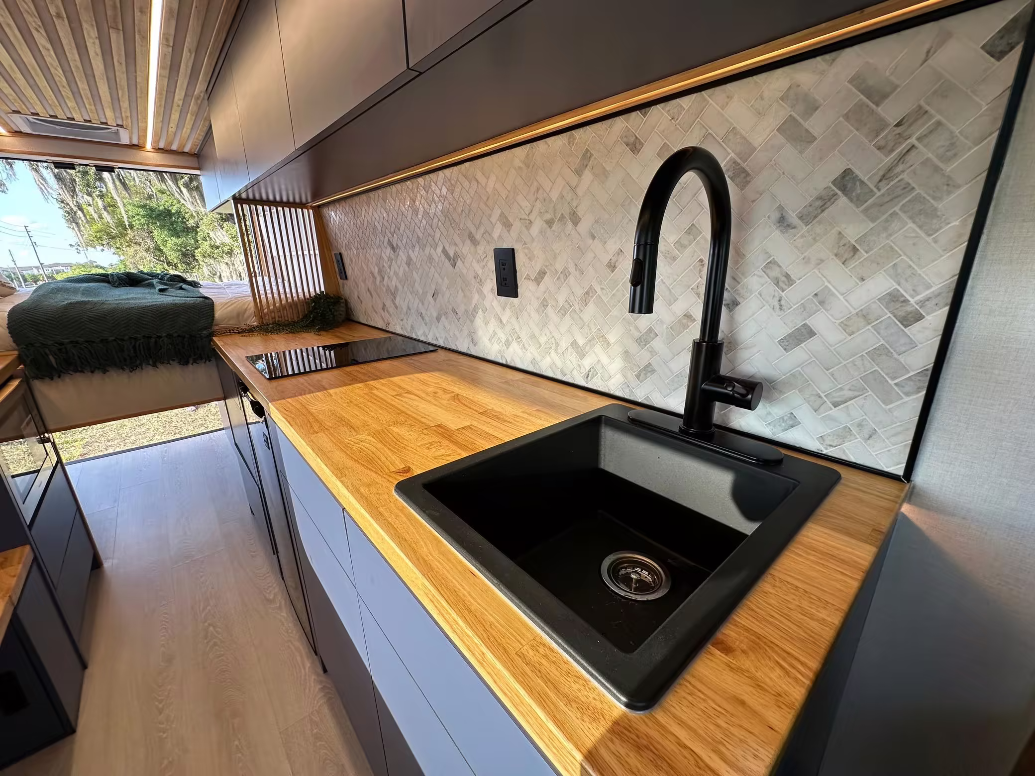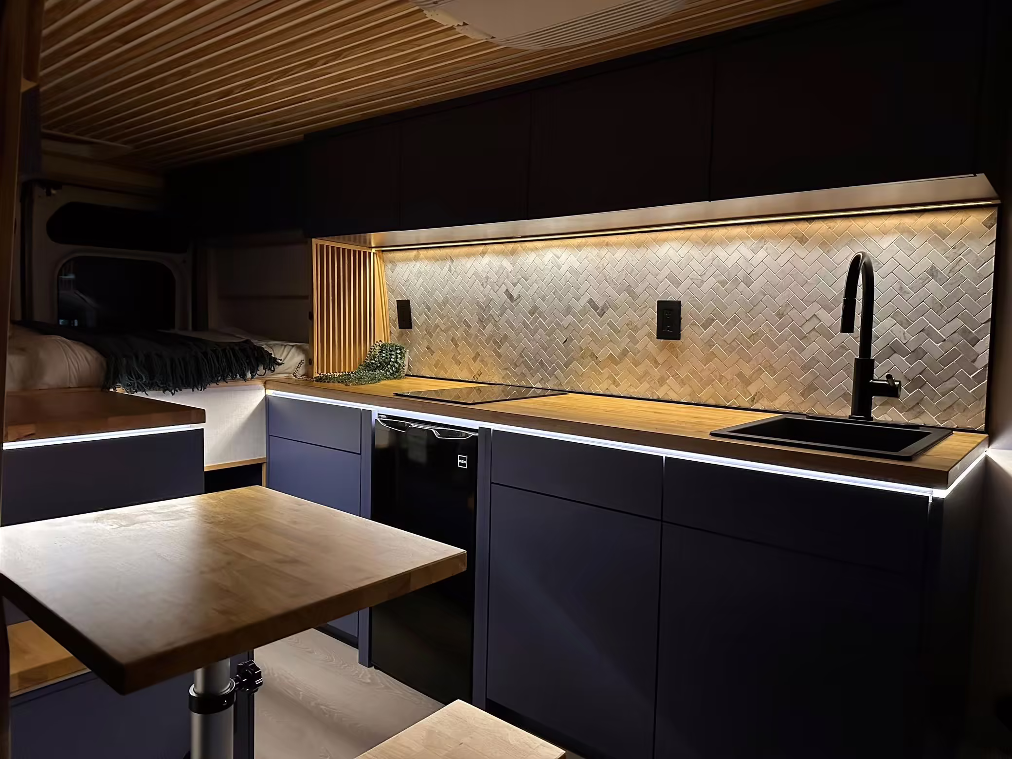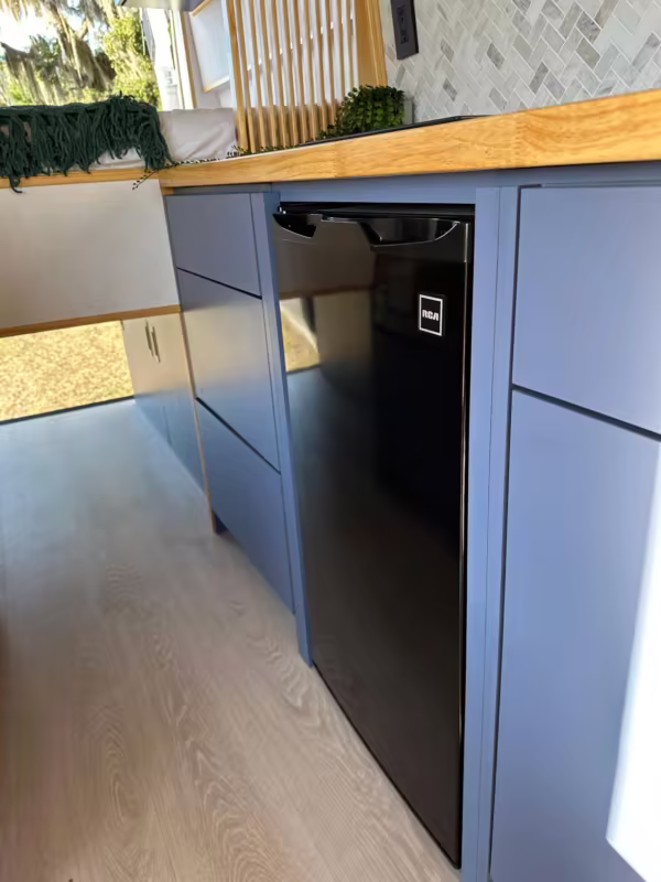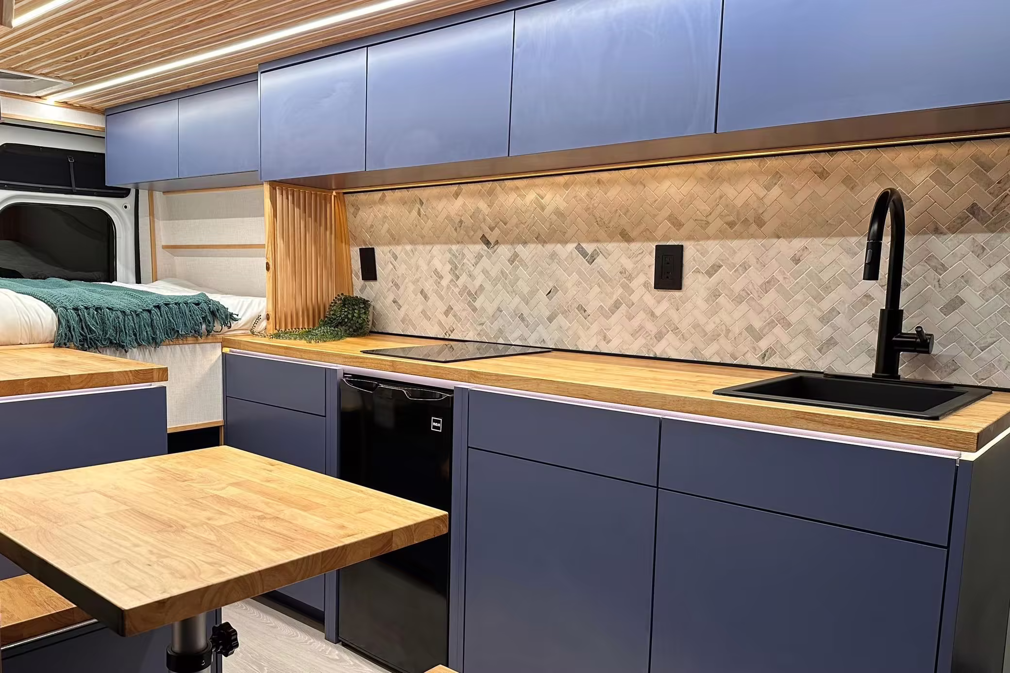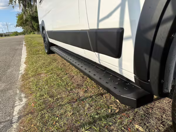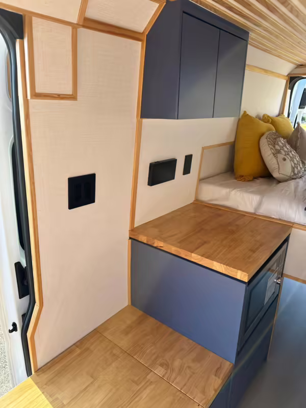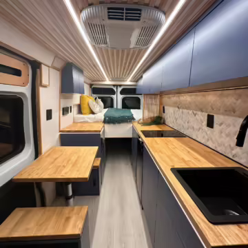 It’s a spacious 3500 Extended High Roof model, and it has been outfitted with almost everything you’d need on your next road trip adventure – including a fridge, a sink, cabinets, 25-gallon water tanks, an EcoFlow solar panel, and much more.