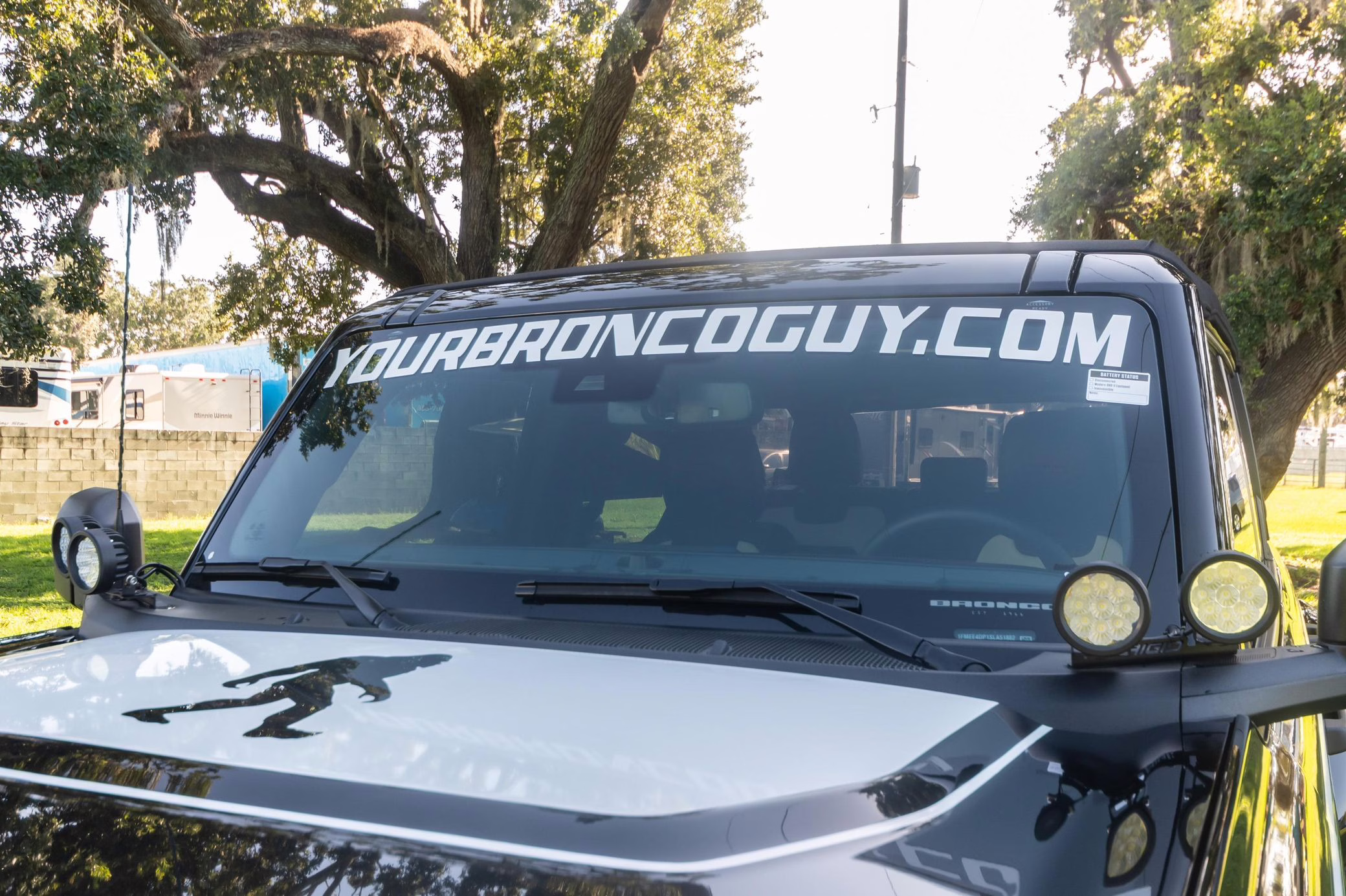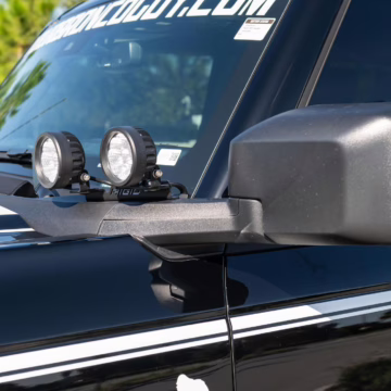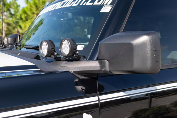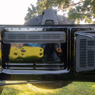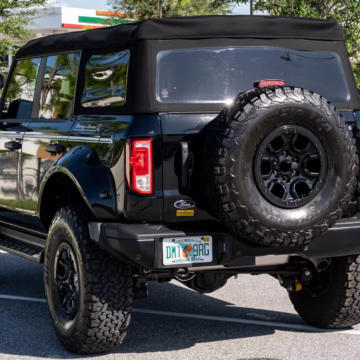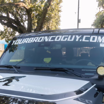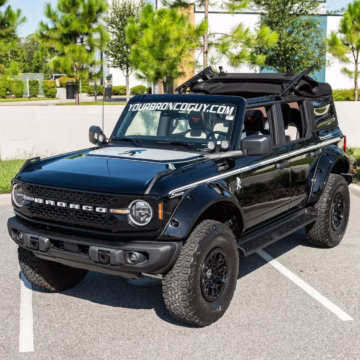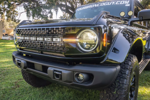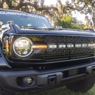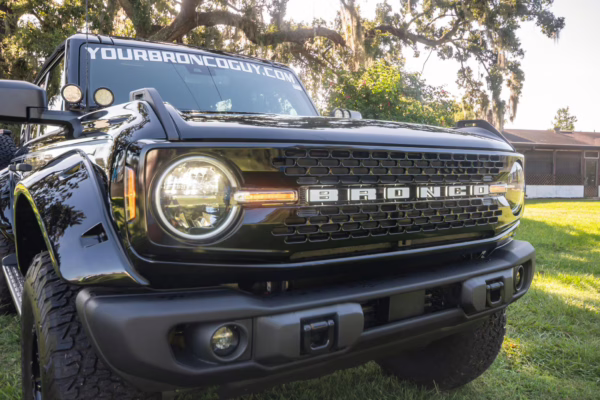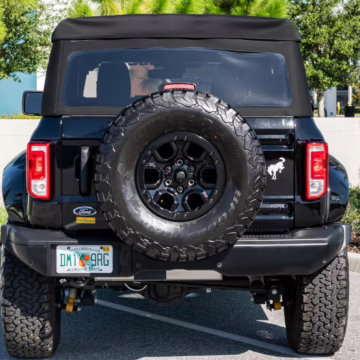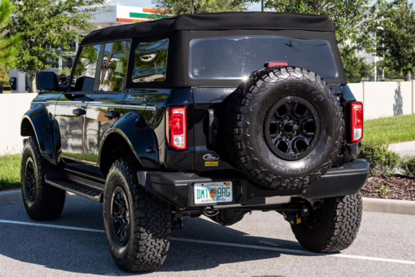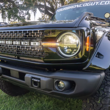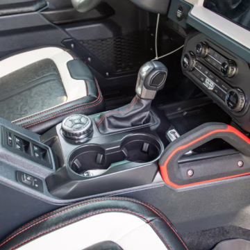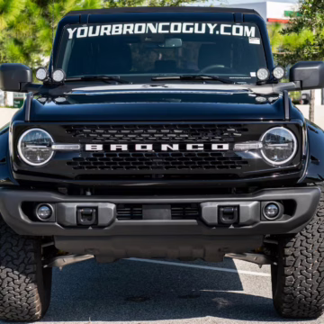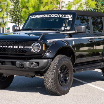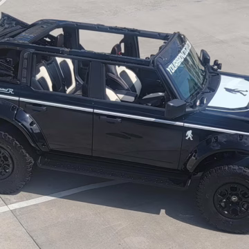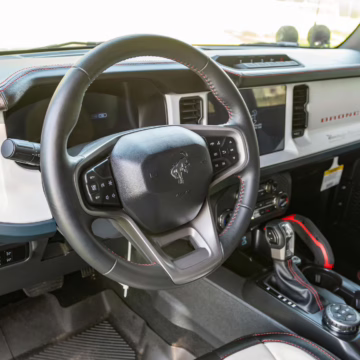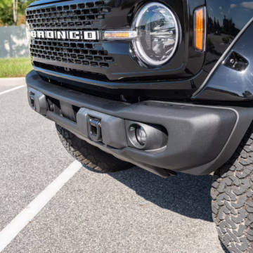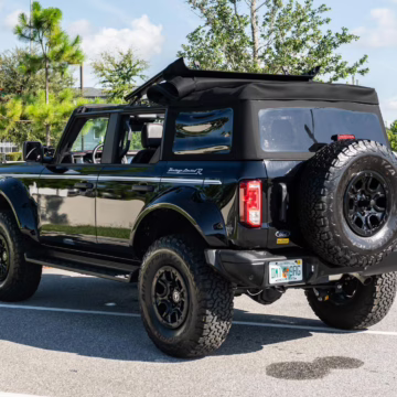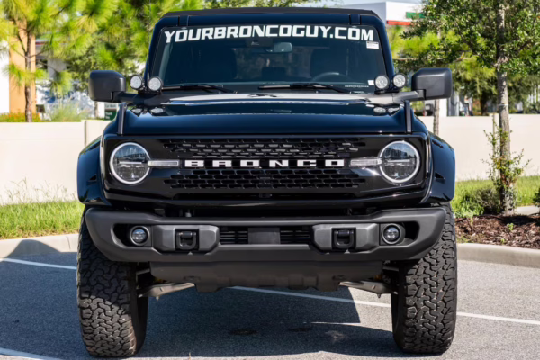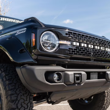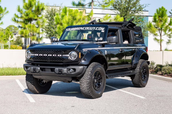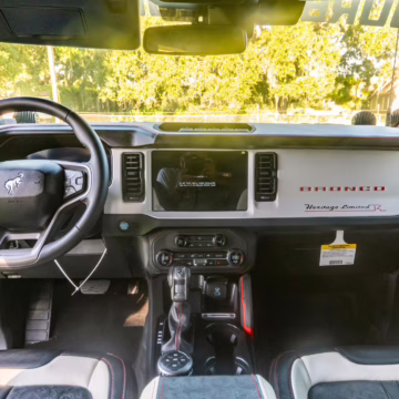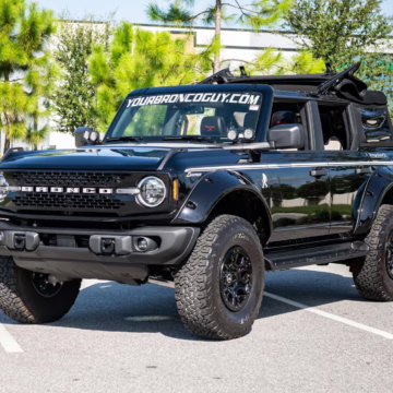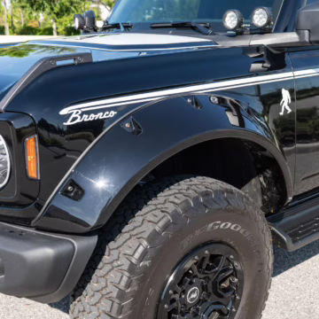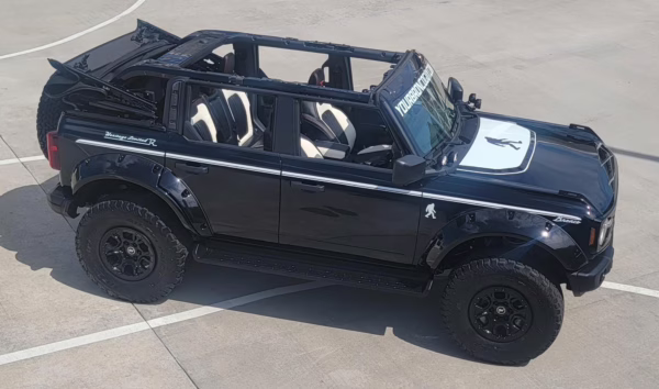 This particular Bronco features a rare Heritage Limited R Package that includes the Ford Wide Body Package, Custom Paint Package, Black Out Trim Package, an upgraded Ford convertible top, Rigid light pods, 17-inch multi-spoke alloy wheels, a 4-inch lift kit, and hand-tooled leather upholstery. It also touts the more powerful EcoBoost V6, and it looks great in Shadow Black.