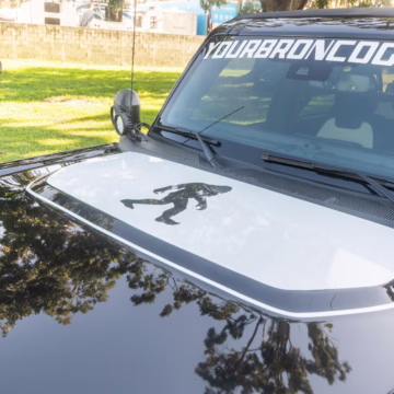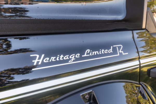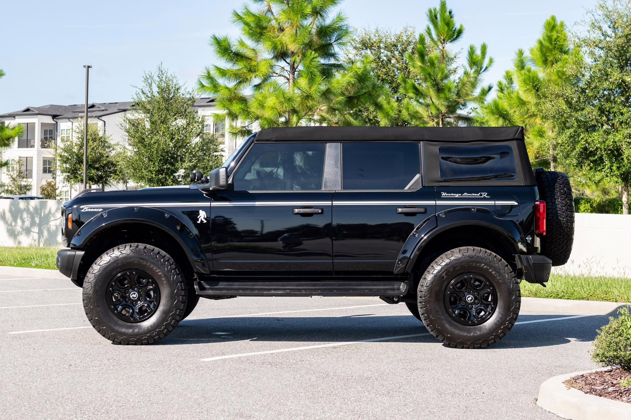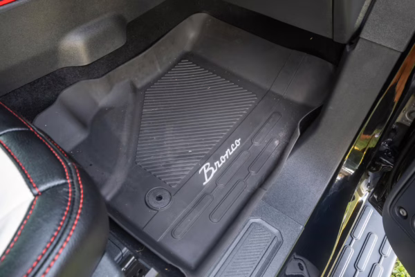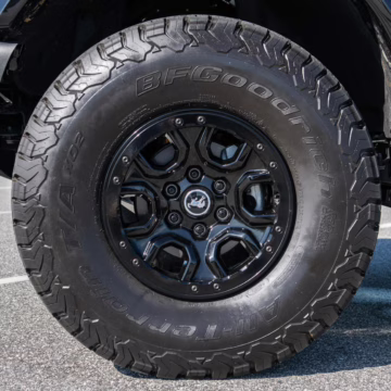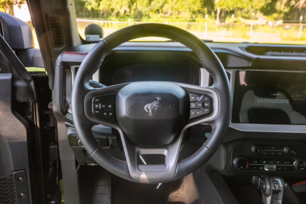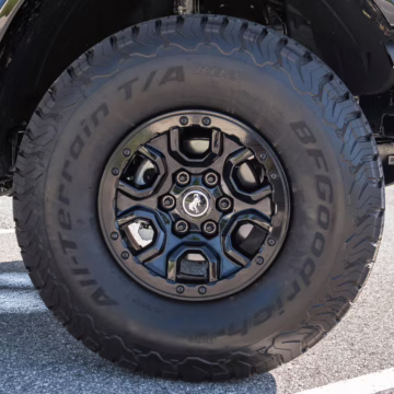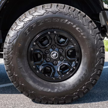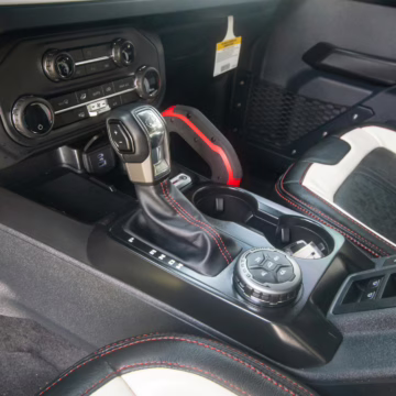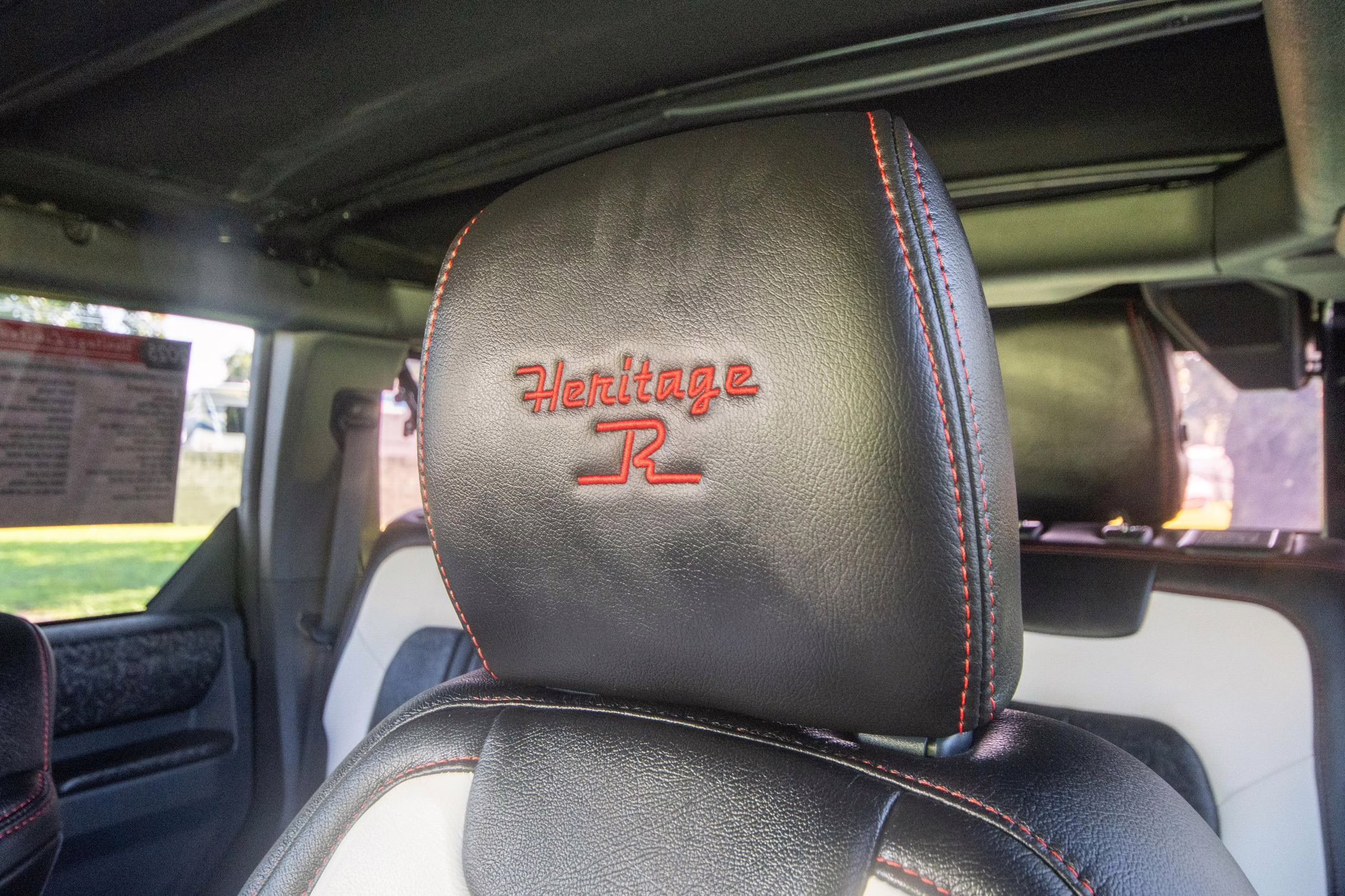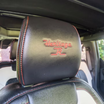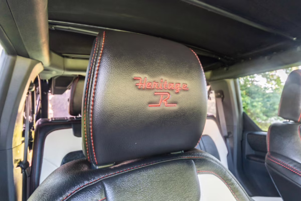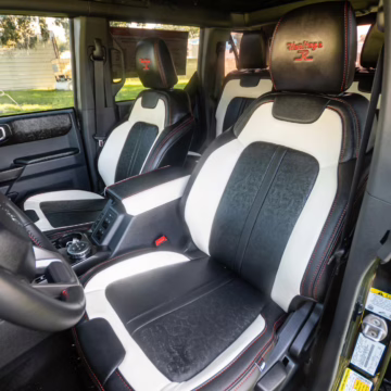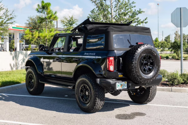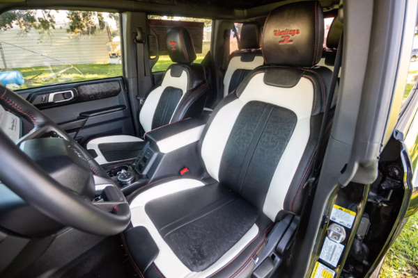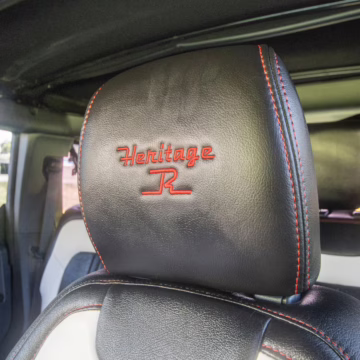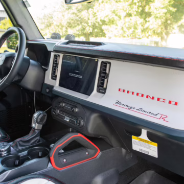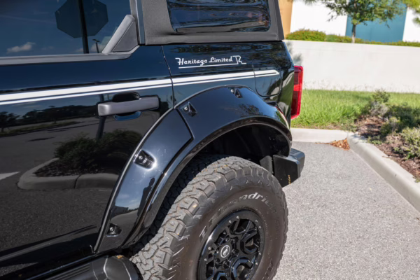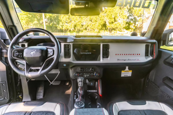 • Heritage Limited R Package (Ford Wide Body Package, Custom Paint Package, Black Out Trim Package, upgraded Ford convertible top, high output exterior pod lights, Ford Performance Rigid Quad Mounting Package, 17-inch multi-spoke black alloy wheels, 4-inch lift kit, R Graphics Package, Katzkin leather upholstery, heated front seats, red stiching, black-out grille, illuminated grille, Bronco emblems and hood graphics, Heritage Limited R logos, Sasquatch logos)