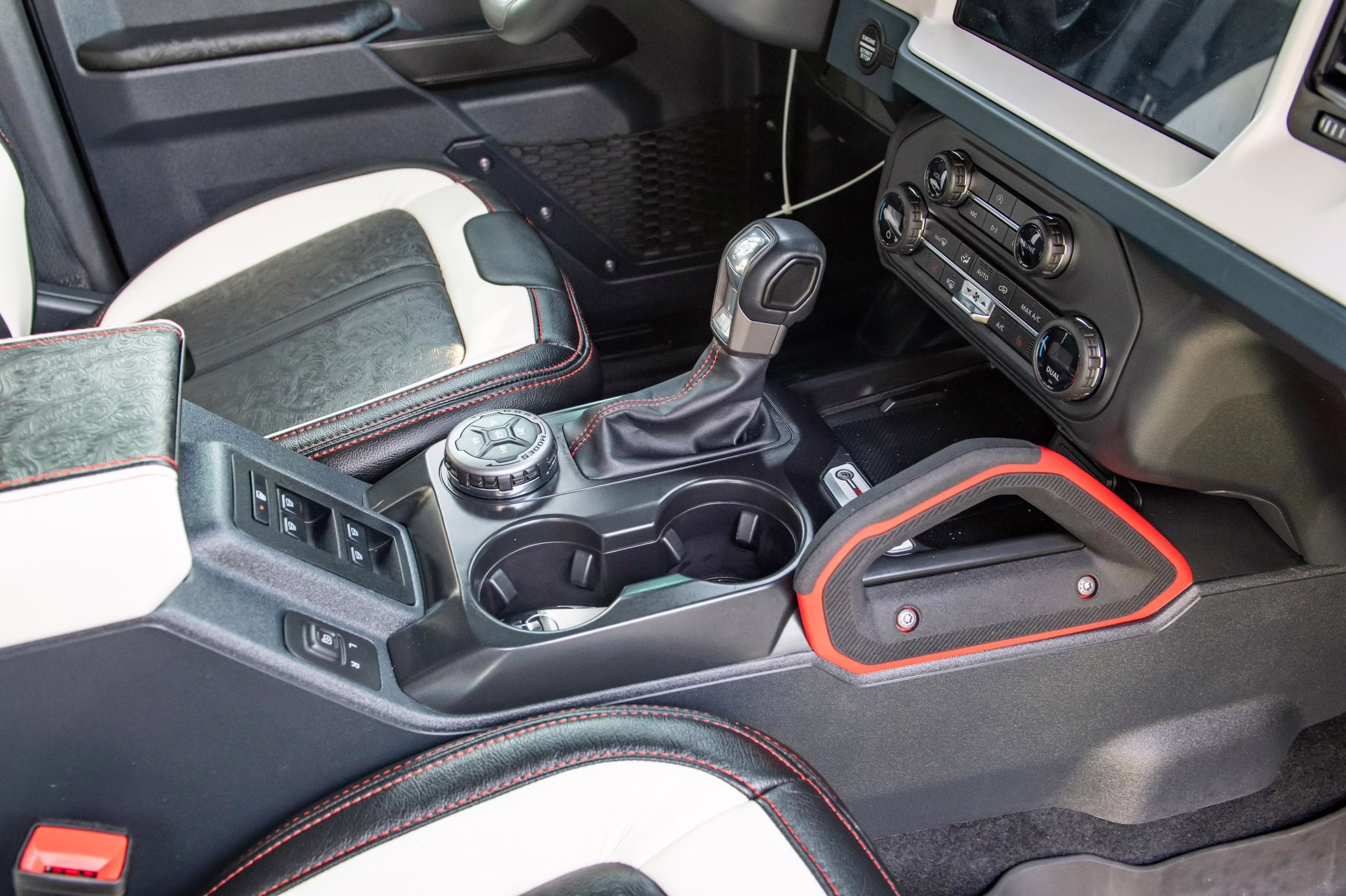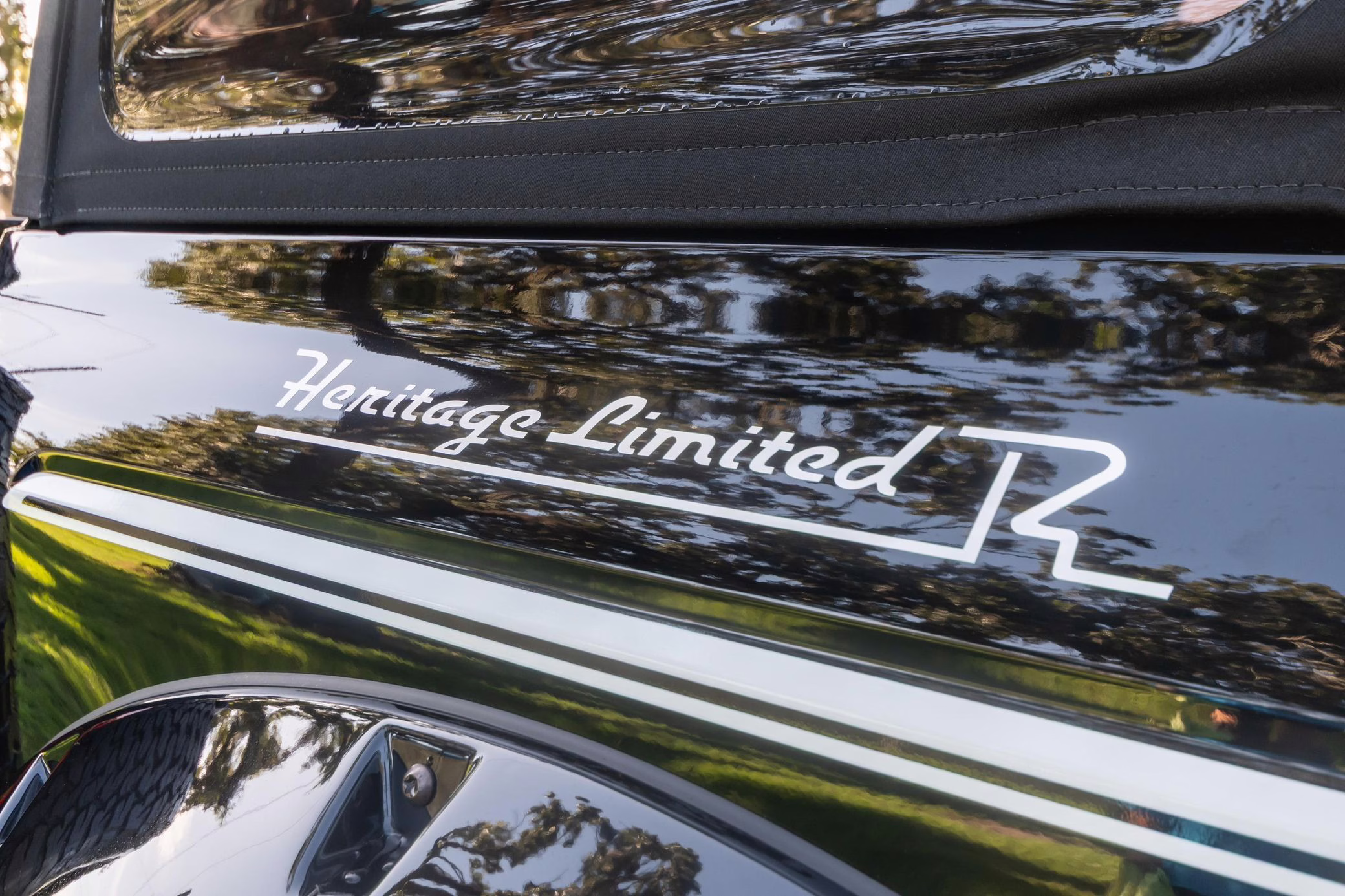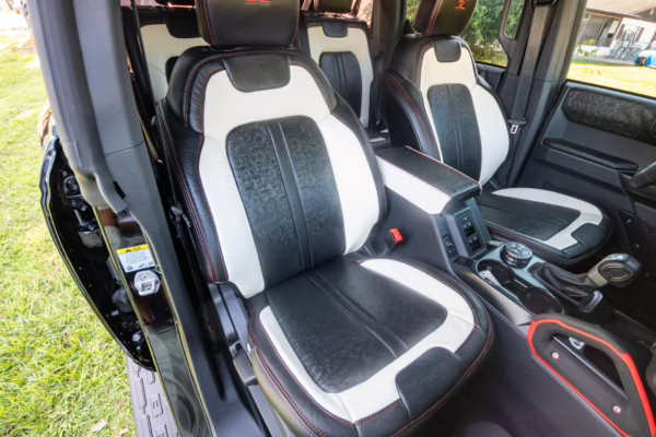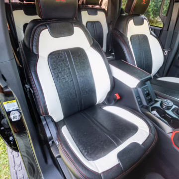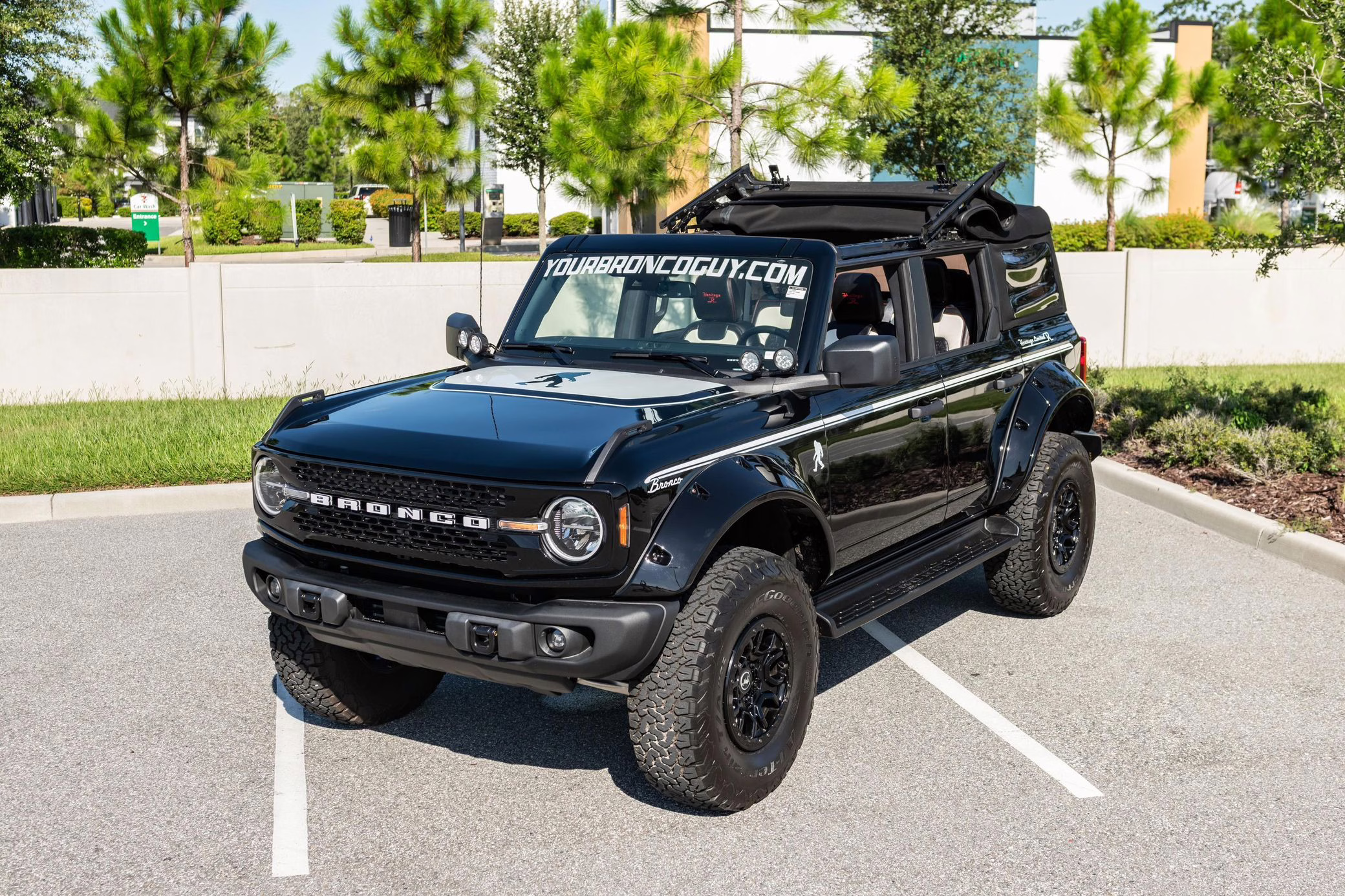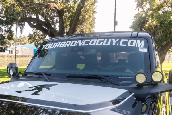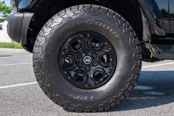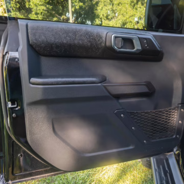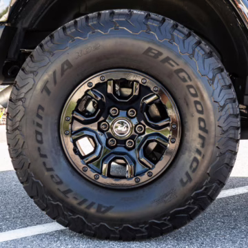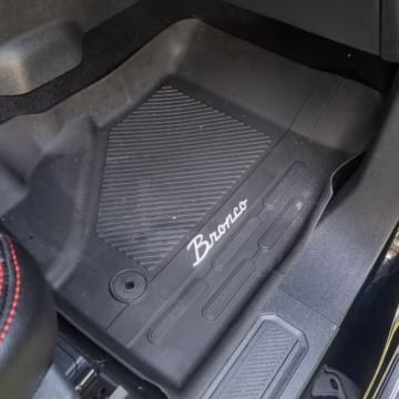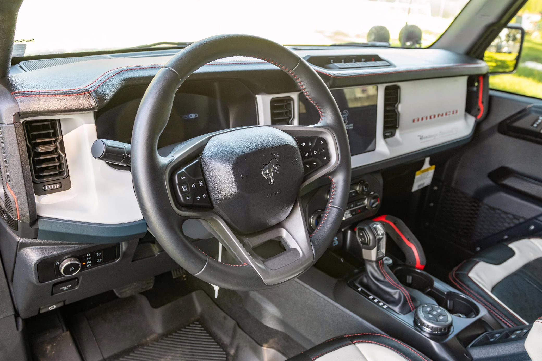 • Heritage Limited R Package (Ford Wide Body Package, Custom Paint Package, Black Out Trim Package, upgraded Ford convertible top, high output exterior pod lights, Ford Performance Rigid Quad Mounting Package, 17-inch multi-spoke black alloy wheels, 4-inch lift kit, R Graphics Package, Katzkin leather upholstery, heated front seats, red stiching, black-out grille, illuminated grille, Bronco emblems and hood graphics, Heritage Limited R logos, Sasquatch logos)