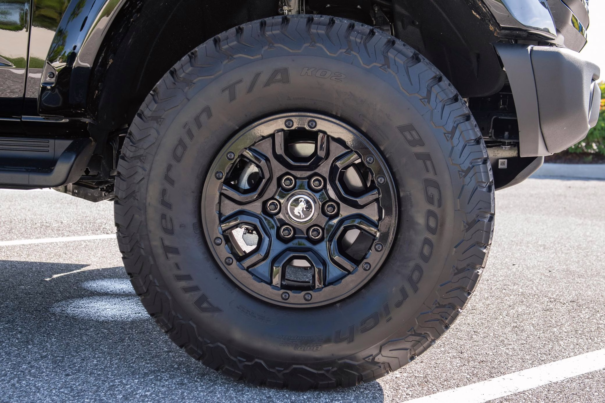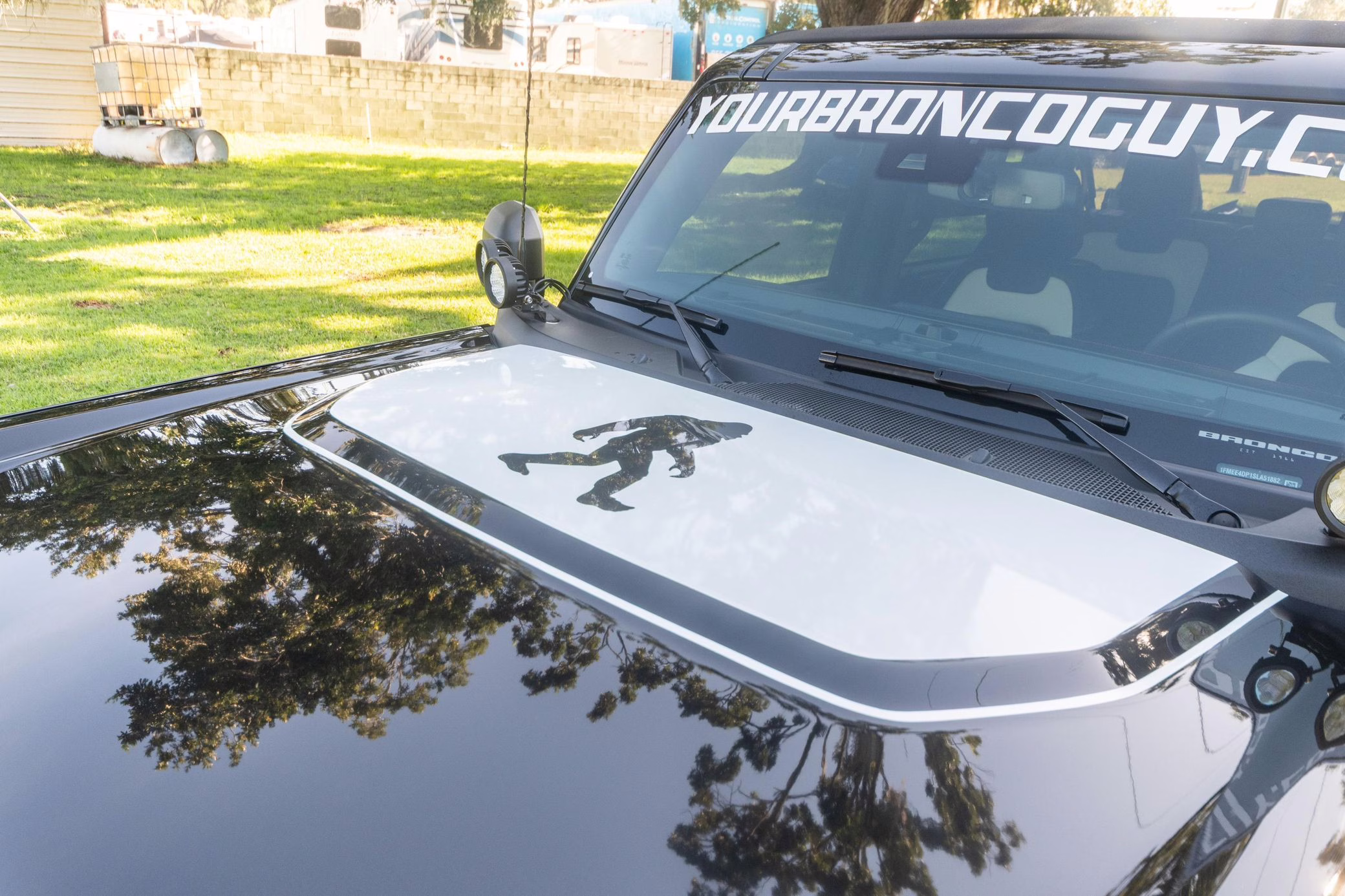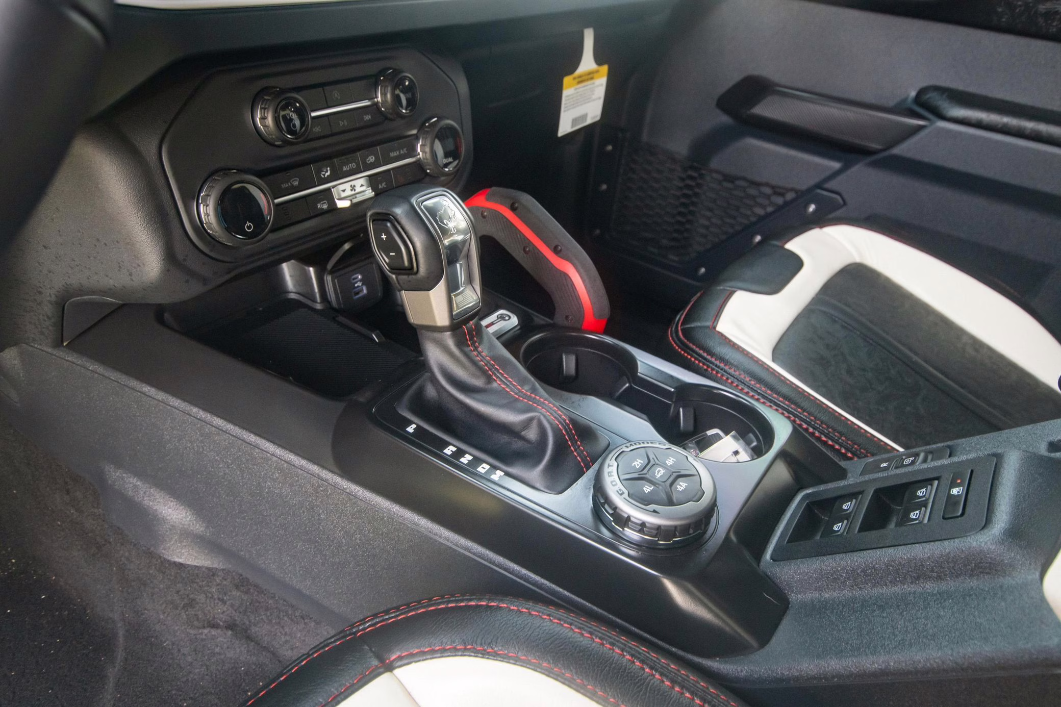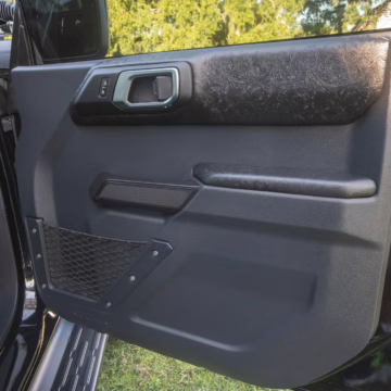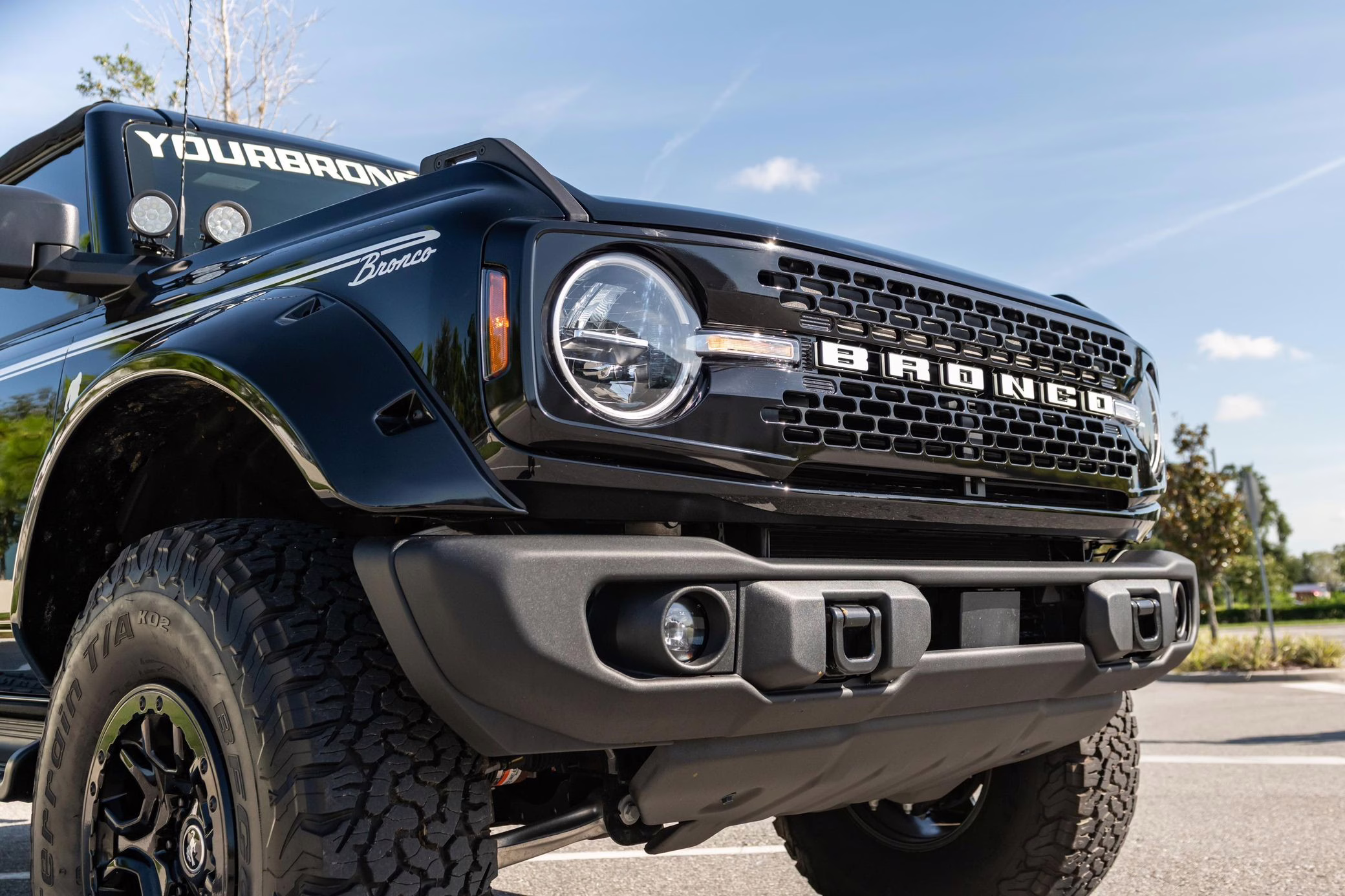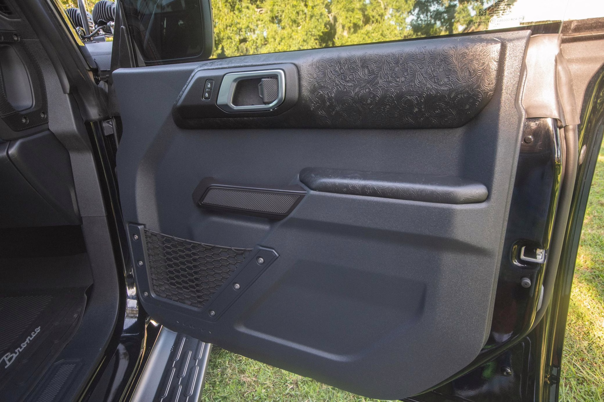 • Heritage Limited R Package (Ford Wide Body Package, Custom Paint Package, Black Out Trim Package, upgraded Ford convertible top, high output exterior pod lights, Ford Performance Rigid Quad Mounting Package, 17-inch multi-spoke black alloy wheels, 4-inch lift kit, R Graphics Package, Katzkin leather upholstery, heated front seats, red stiching, black-out grille, illuminated grille, Bronco emblems and hood graphics, Heritage Limited R logos, Sasquatch logos)